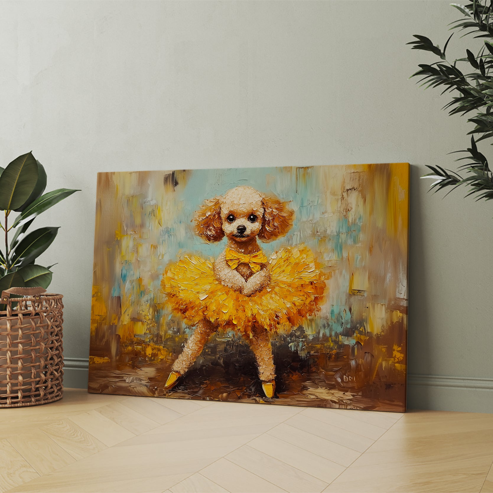 Add a touch of whimsy and elegance to any room with our Dancing Poodle Canvas Wall Art. This charming piece features a yellow tutu-clad poodle, adding a playful yet sophisticated touch to your living room, sofa backdrop, bedside, or any other space in your home. Perfect for dog lovers and art enthusiasts alike.