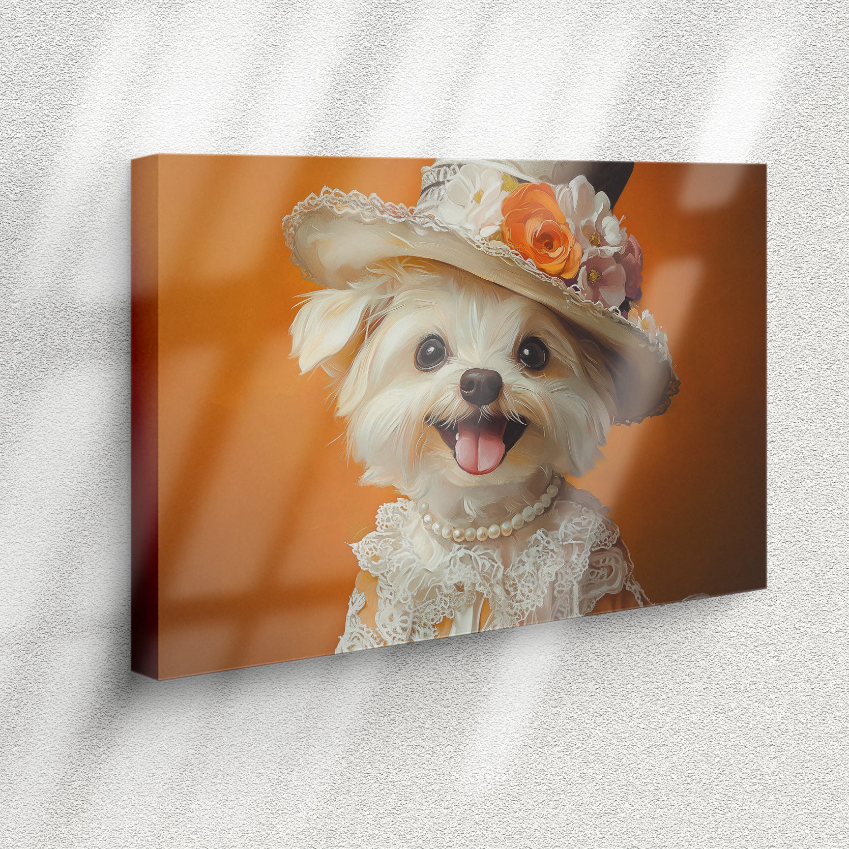 9.Elegant Dog Portrait Canvas Wall Art, White Maltese in Vintage Hat and Lace.
