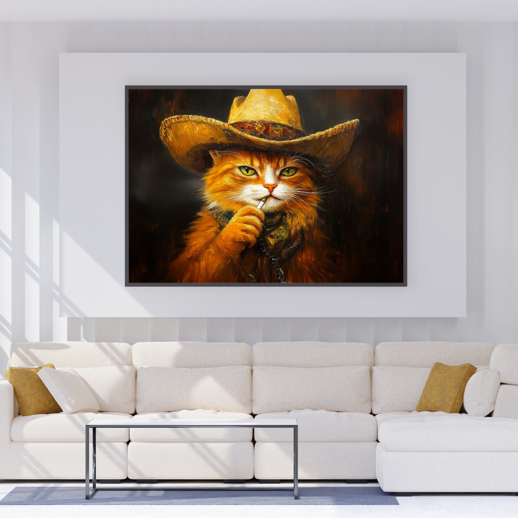 Add a touch of whimsy to your home decor with our Cowboy Cat Canvas Wall Art. This high-quality canvas features an adorable orange tabby sporting a trendy cowboy hat. Perfect for adding personality to your living room, sofa, or bedside, this piece is sure to make a statement.
