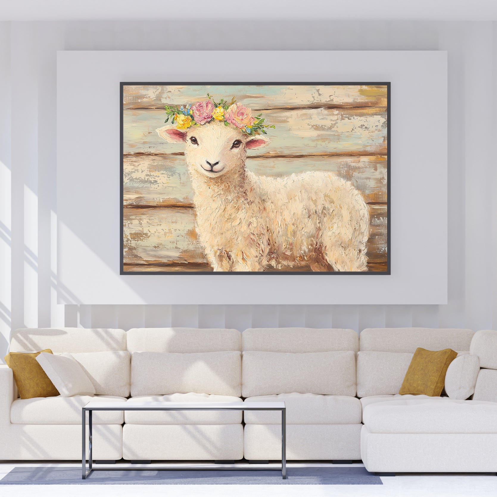 Transform any living space with this Farmhouse Lamb Canvas Wall Art. Featuring a charming and whimsical floral crown sheep painting, this piece adds character and personality to any room. Perfect for living rooms, sofa backdrops, bedside decorations, and more.