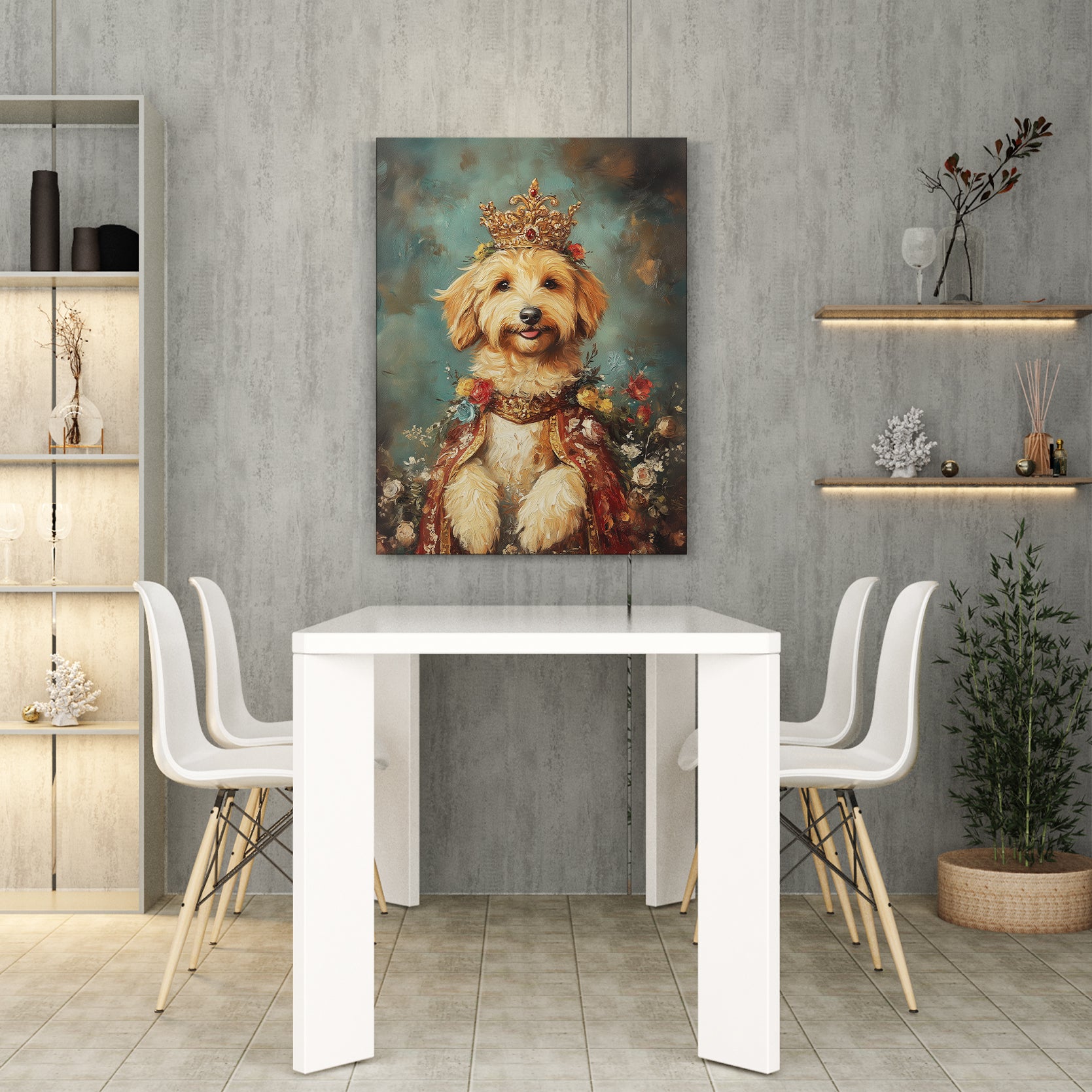11.Royal Pet Portrait Canvas Wall Art, Vintage Style Dog Painting with Crown.