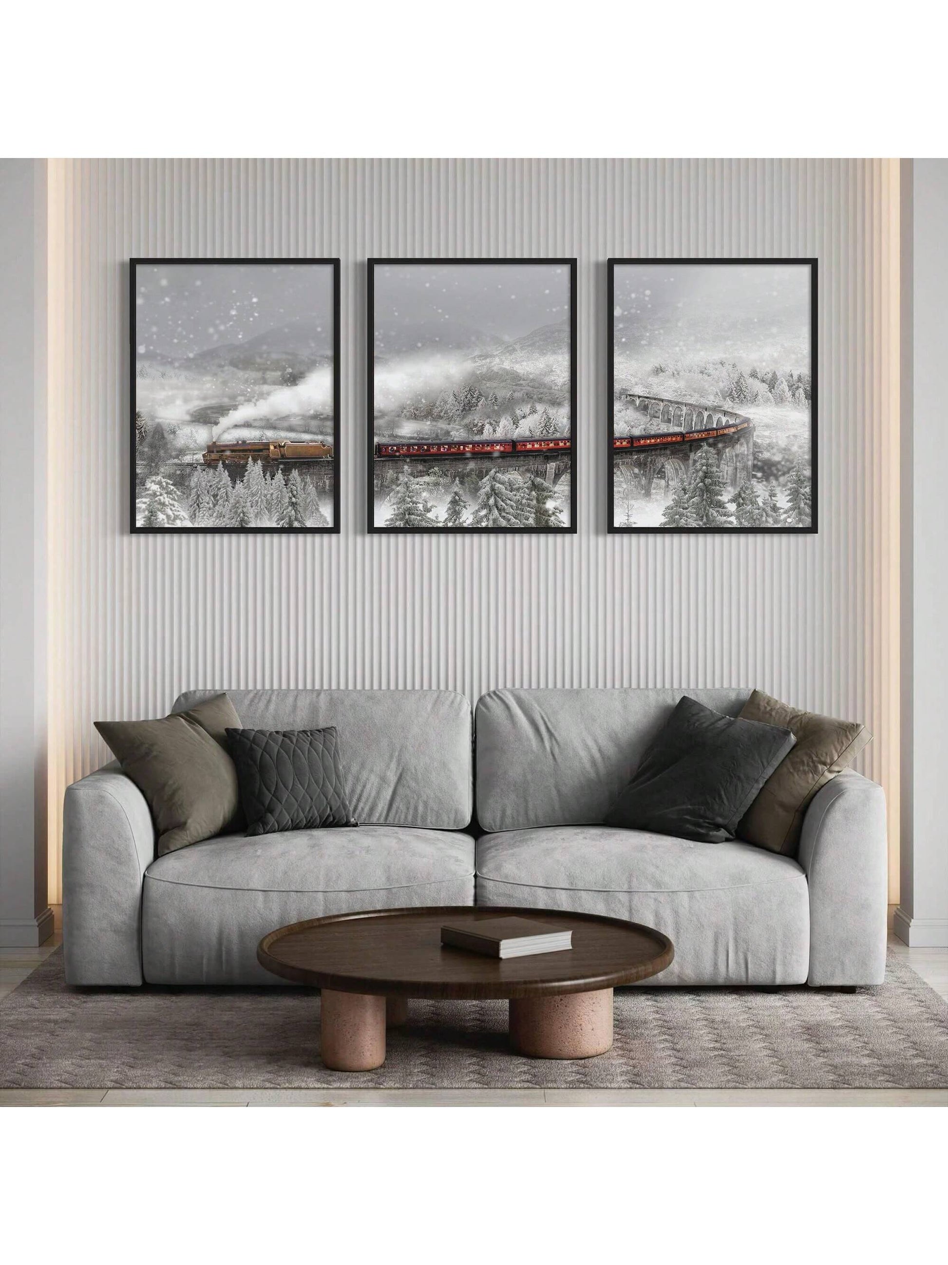 Enhance your holiday decor with this charming winter train canvas art set. Featuring 3 rustic snowscape prints, this unframed canvas poster set captures the magic and charm of the winter season. Bring a touch of nostalgia and warmth to any room with this beautiful and expertly crafted artwork.