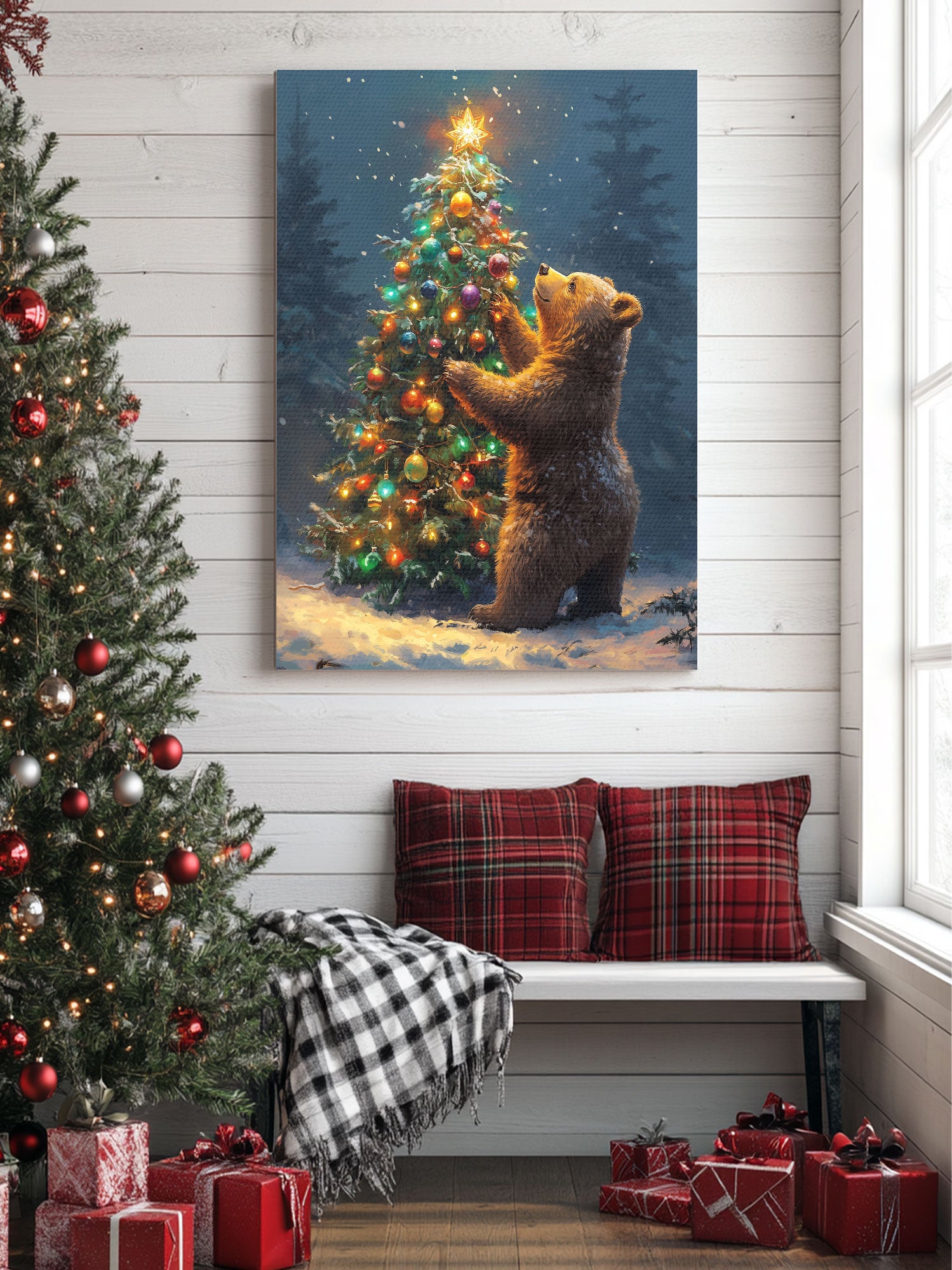 This festive bear decorating the Christmas tree will add holiday cheer to your living room, sofa backdrop, bedside, and home decor. The charming design and no frame option make it versatile for any room. Bring the joy of the season into your home with this adorable decoration.