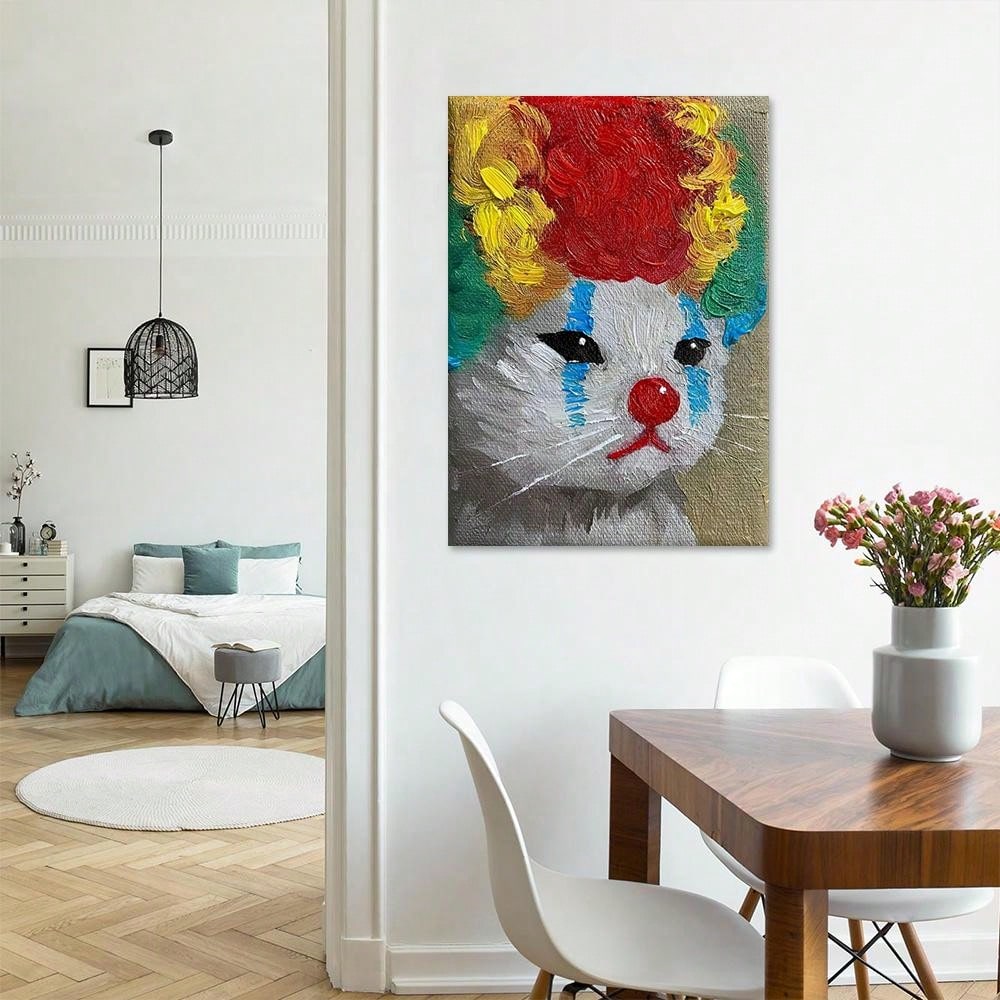 This Whimsical Clown Cat Canvas Art Print is the perfect playful addition to your home decor. Featuring a charming cat dressed as a clown, this piece adds a touch of whimsy to any space. Made with high-quality canvas, it's durable and perfect for any animal lover.