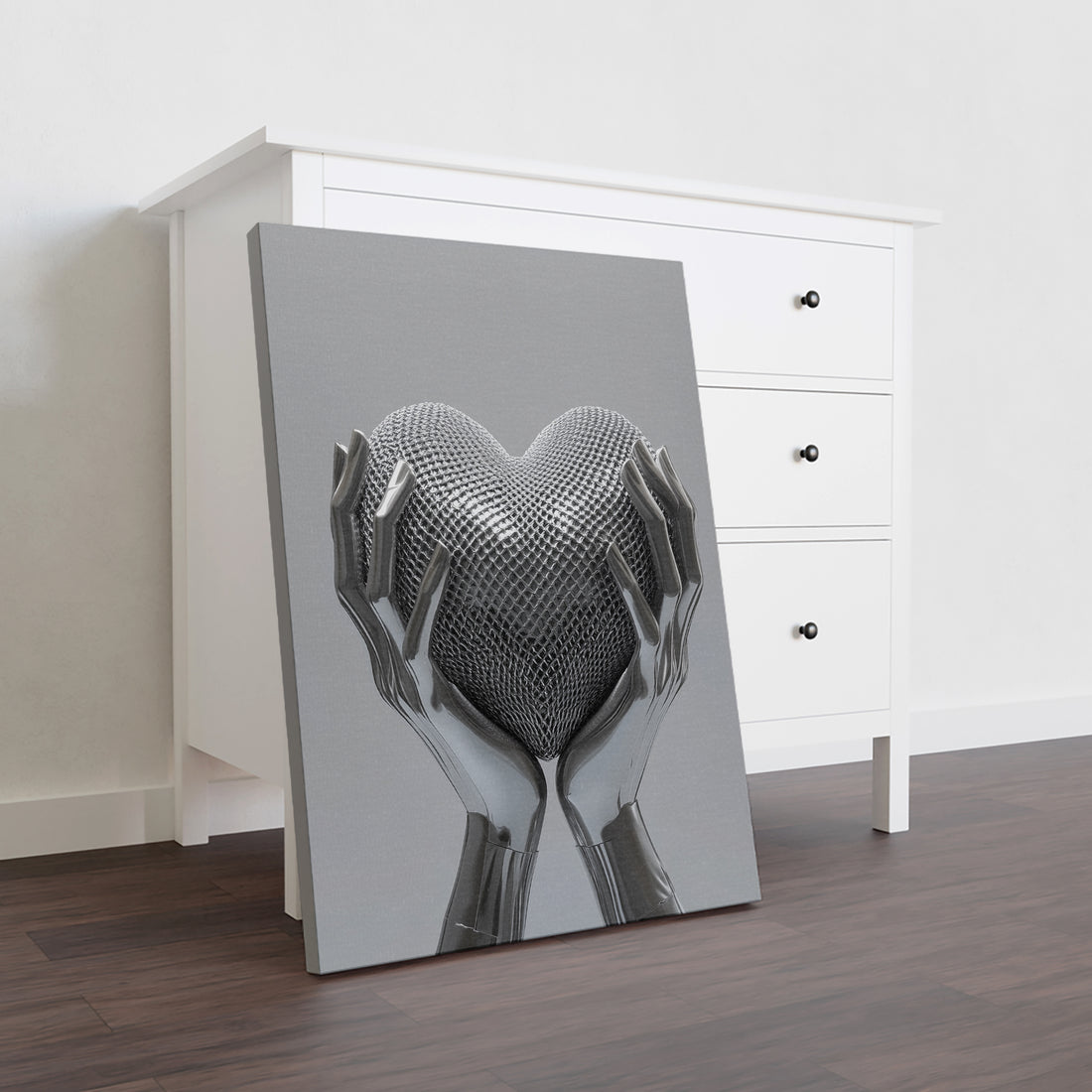 Modern Heart Art Canvas Print, Metallic Silver Mesh Design with Hands- For Living Room, Sofa Backdrop, Bedside Decoration, Home Decor