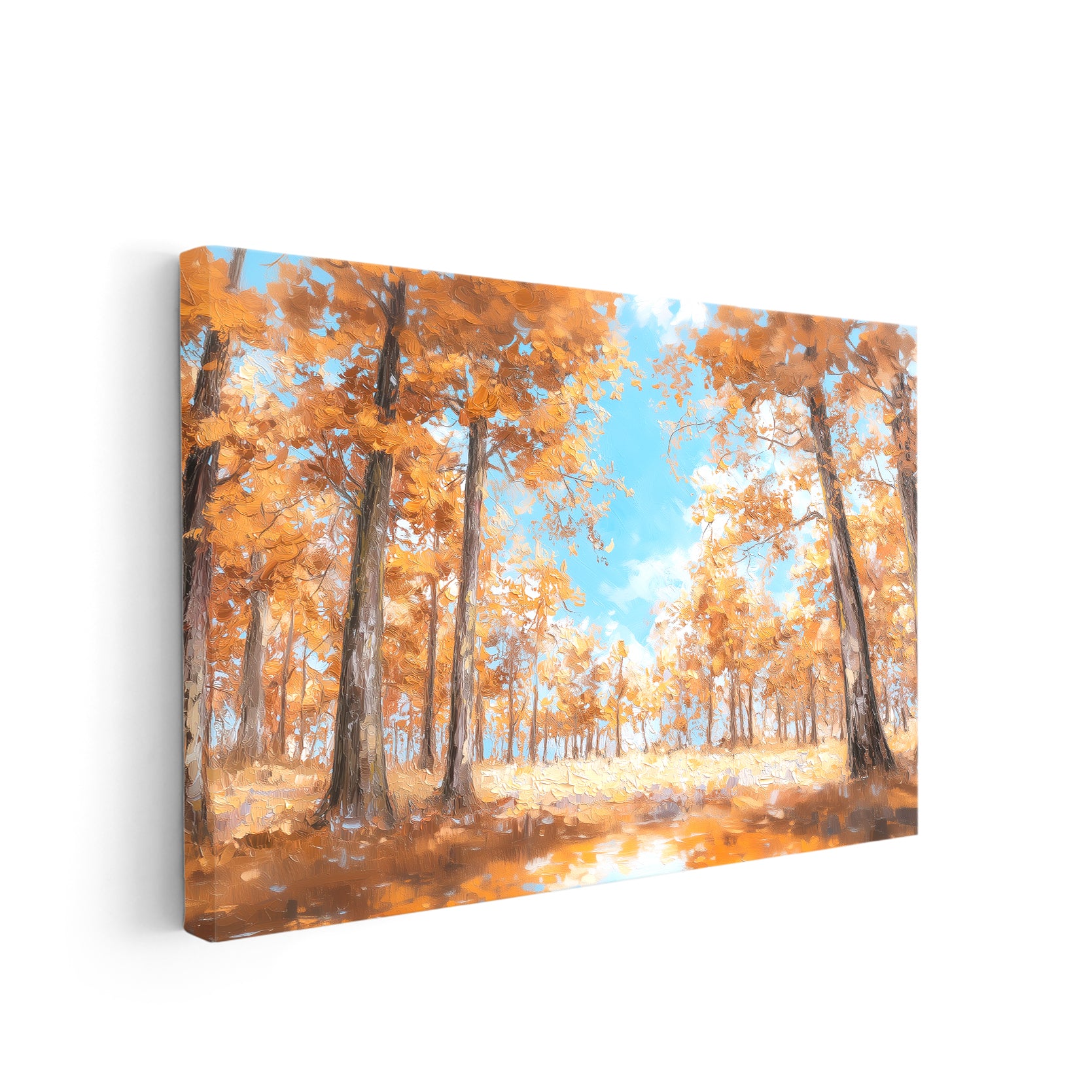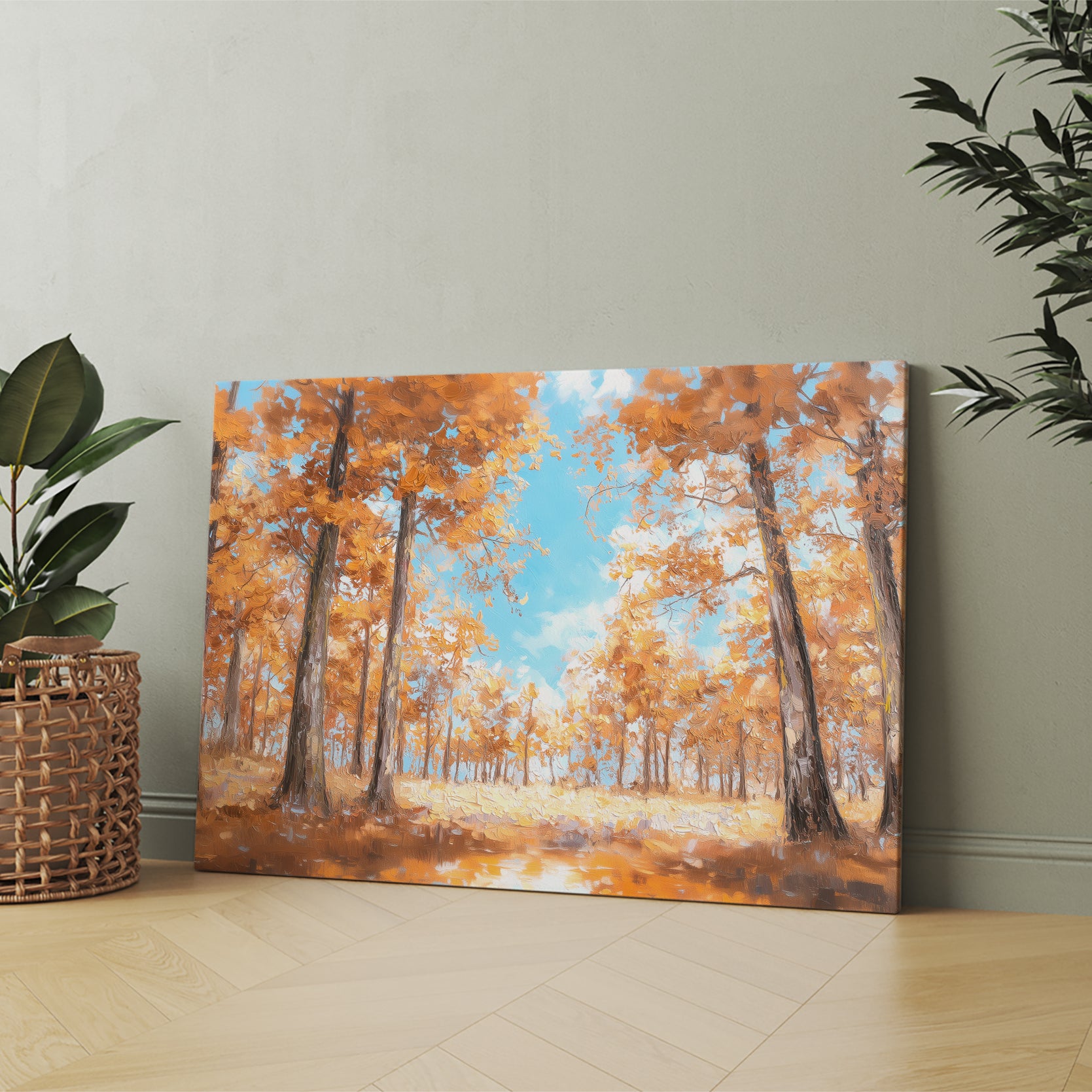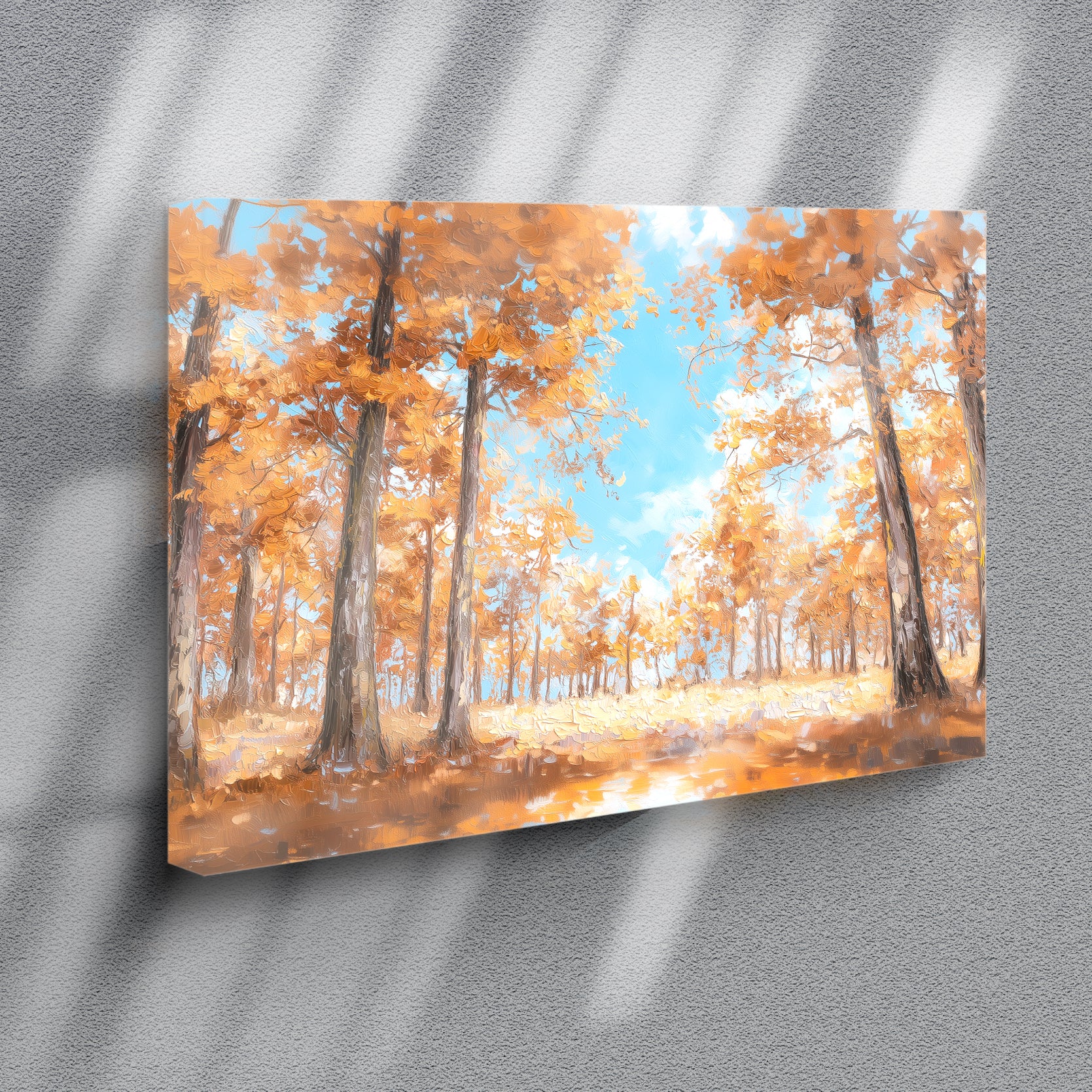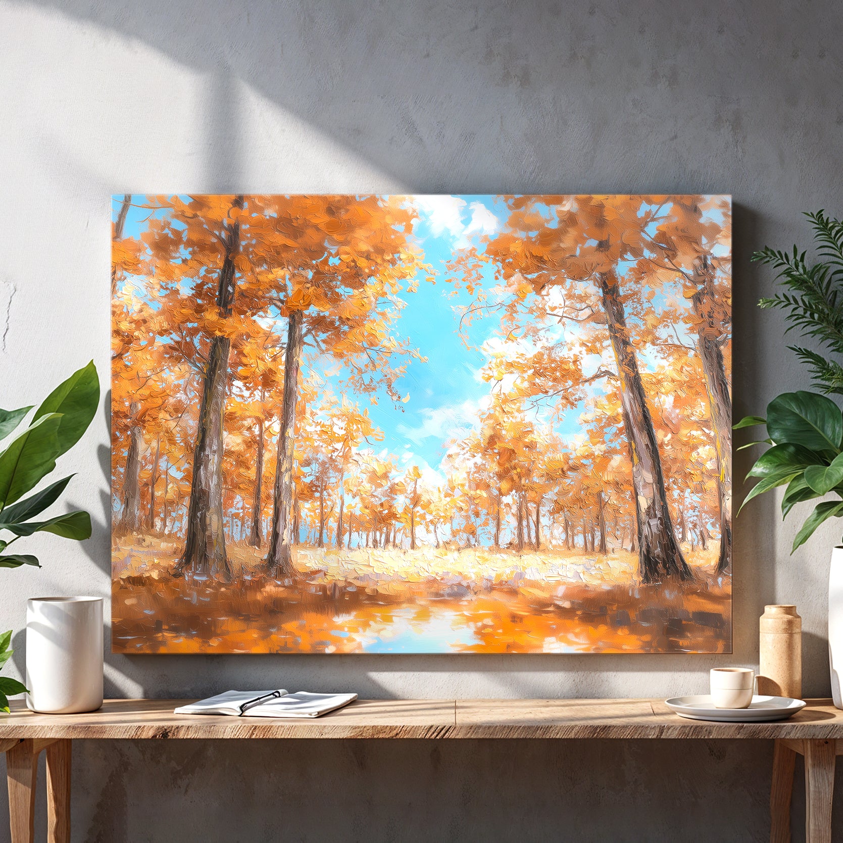 Capture the warmth of fall with this stunning canvas wall art featuring a vibrant autumn forest landscape. Rich orange and golden tones depict majestic trees in their seasonal splendor, creating a sophisticated nature scene that brings the outdoors into your home. Perfect for living rooms, bedrooms, or above sofas, this piece adds depth and visual interest to any space. The expertly rendered forest composition evokes tranquility and natural beauty, making it an ideal choice for those seeking to enhance their interior with seasonal charm and artistic elegance.