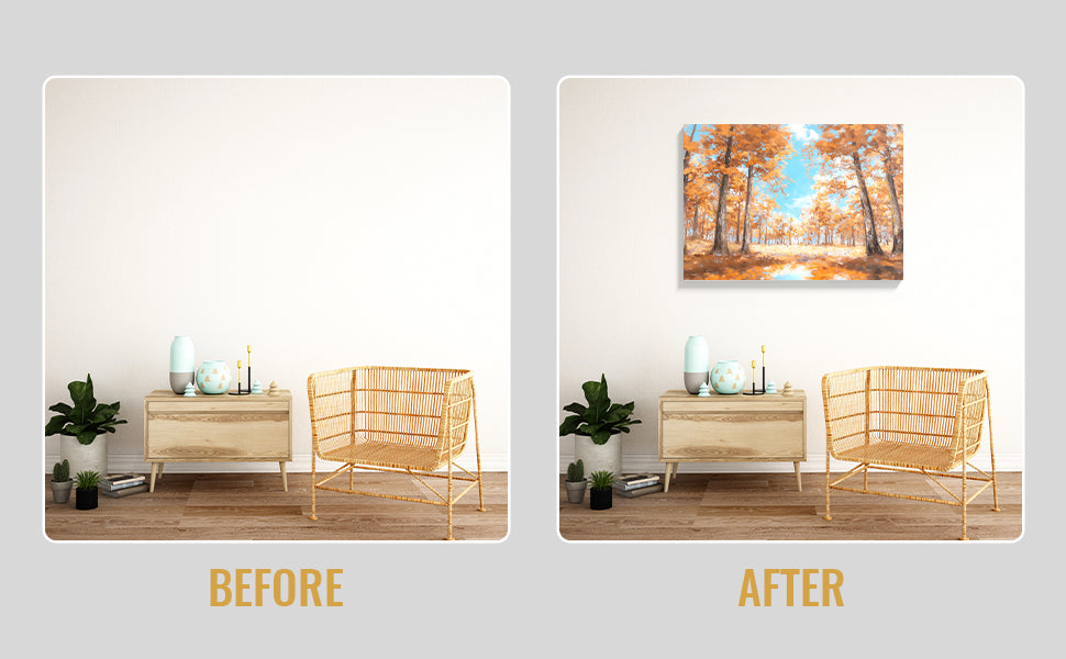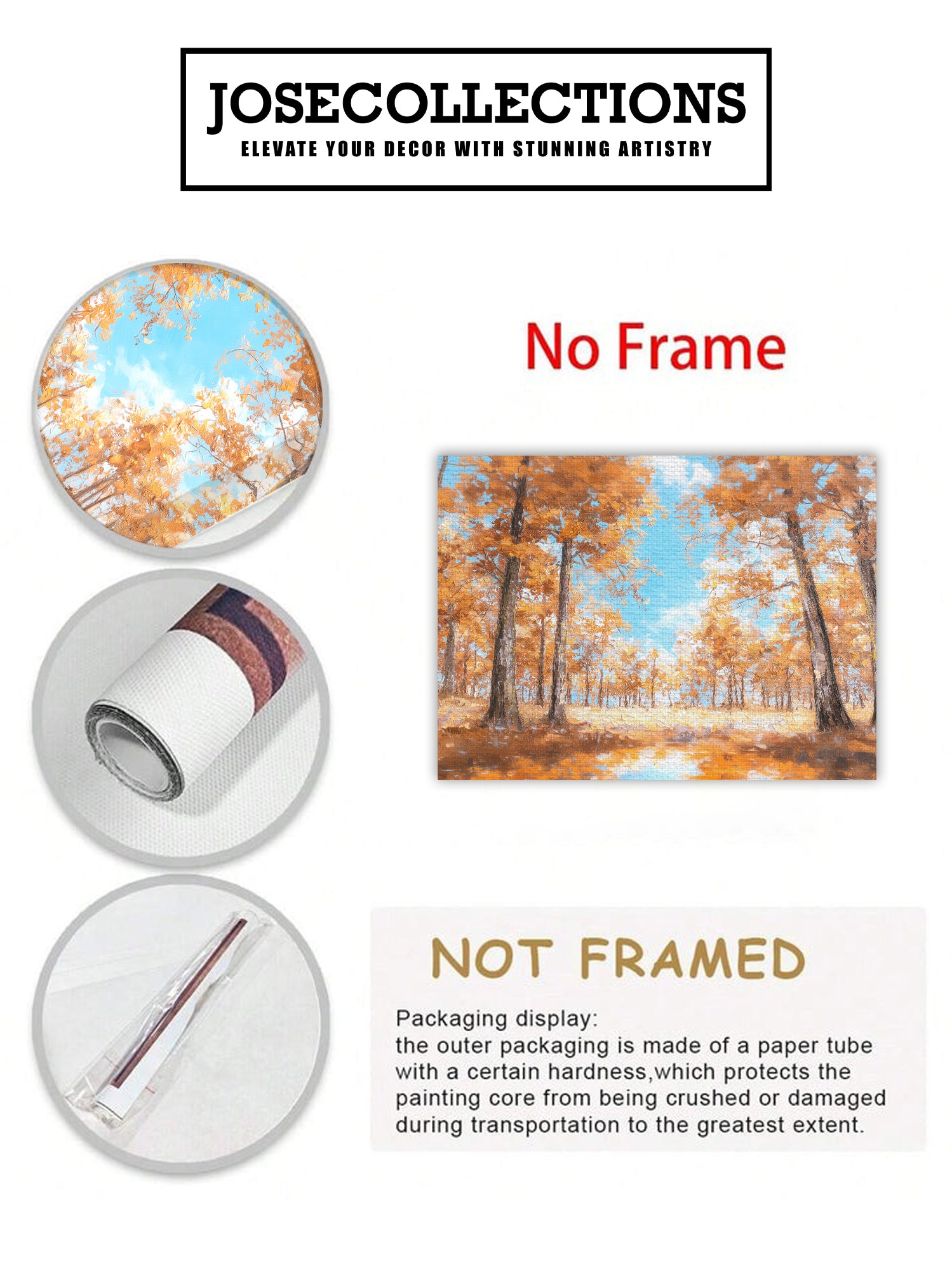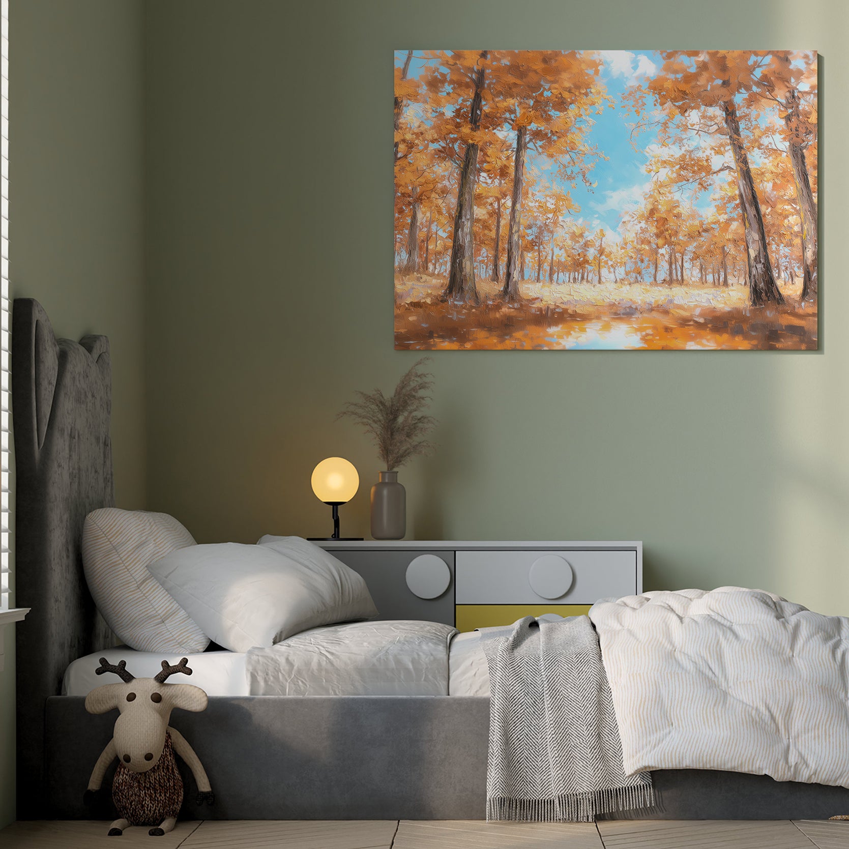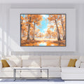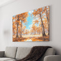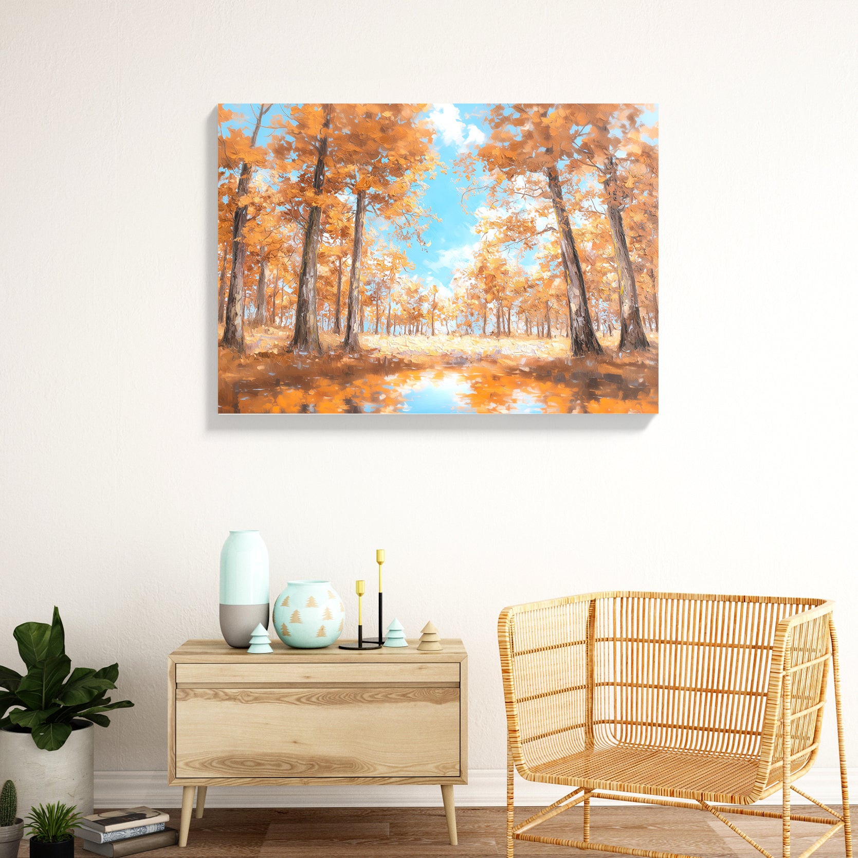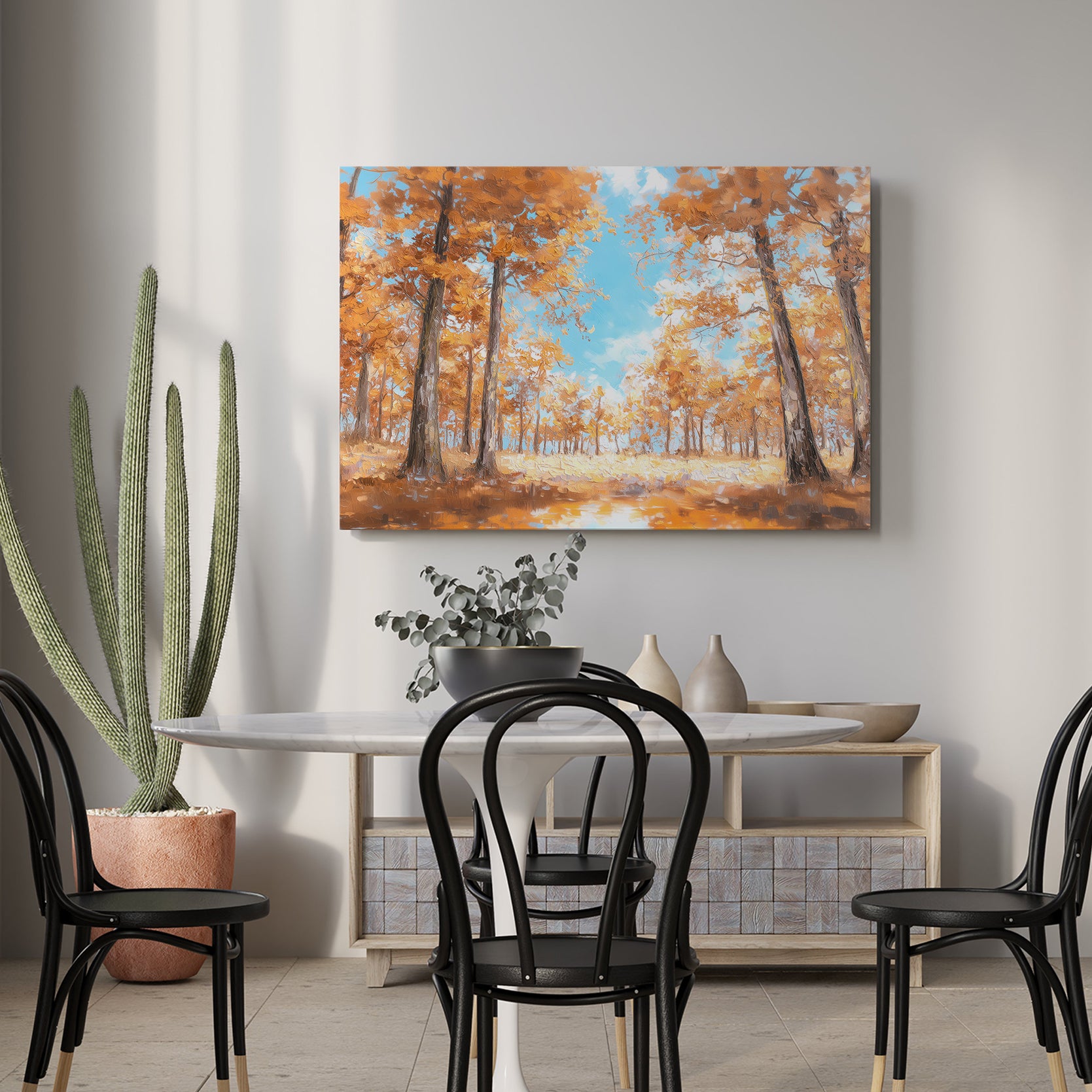 Capture the warmth of fall with this stunning canvas wall art featuring a vibrant autumn forest landscape. Rich orange and golden tones depict majestic trees in their seasonal splendor, creating a sophisticated nature scene that brings the outdoors into your home. Perfect for living rooms, bedrooms, or above sofas, this piece adds depth and visual interest to any space. The expertly rendered forest composition evokes tranquility and natural beauty, making it an ideal choice for those seeking to enhance their interior with seasonal charm and artistic elegance.