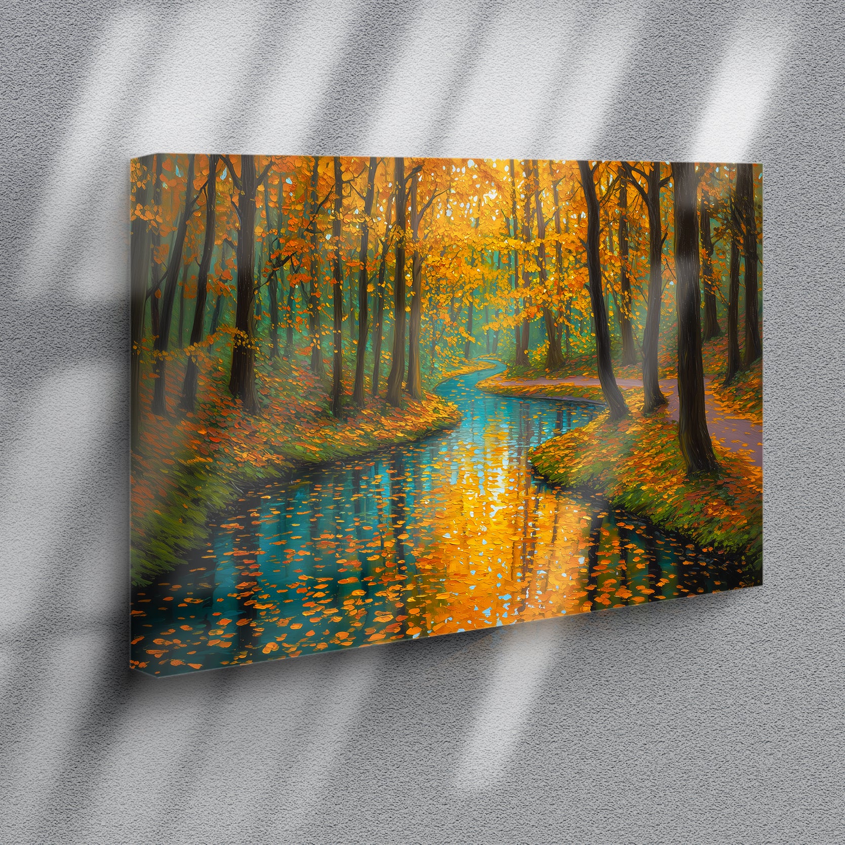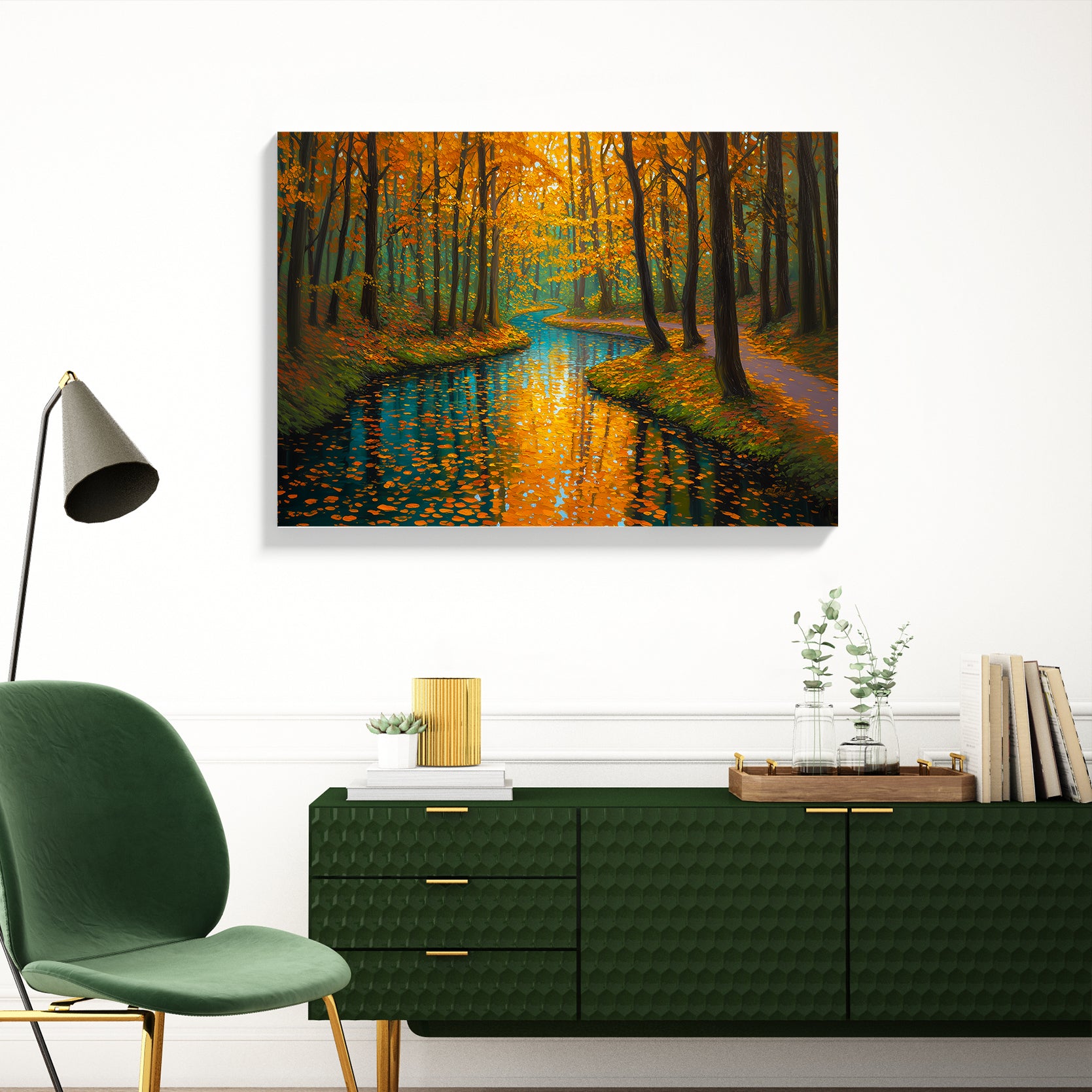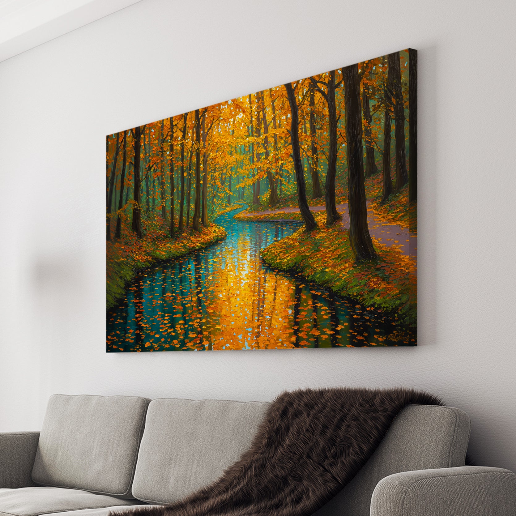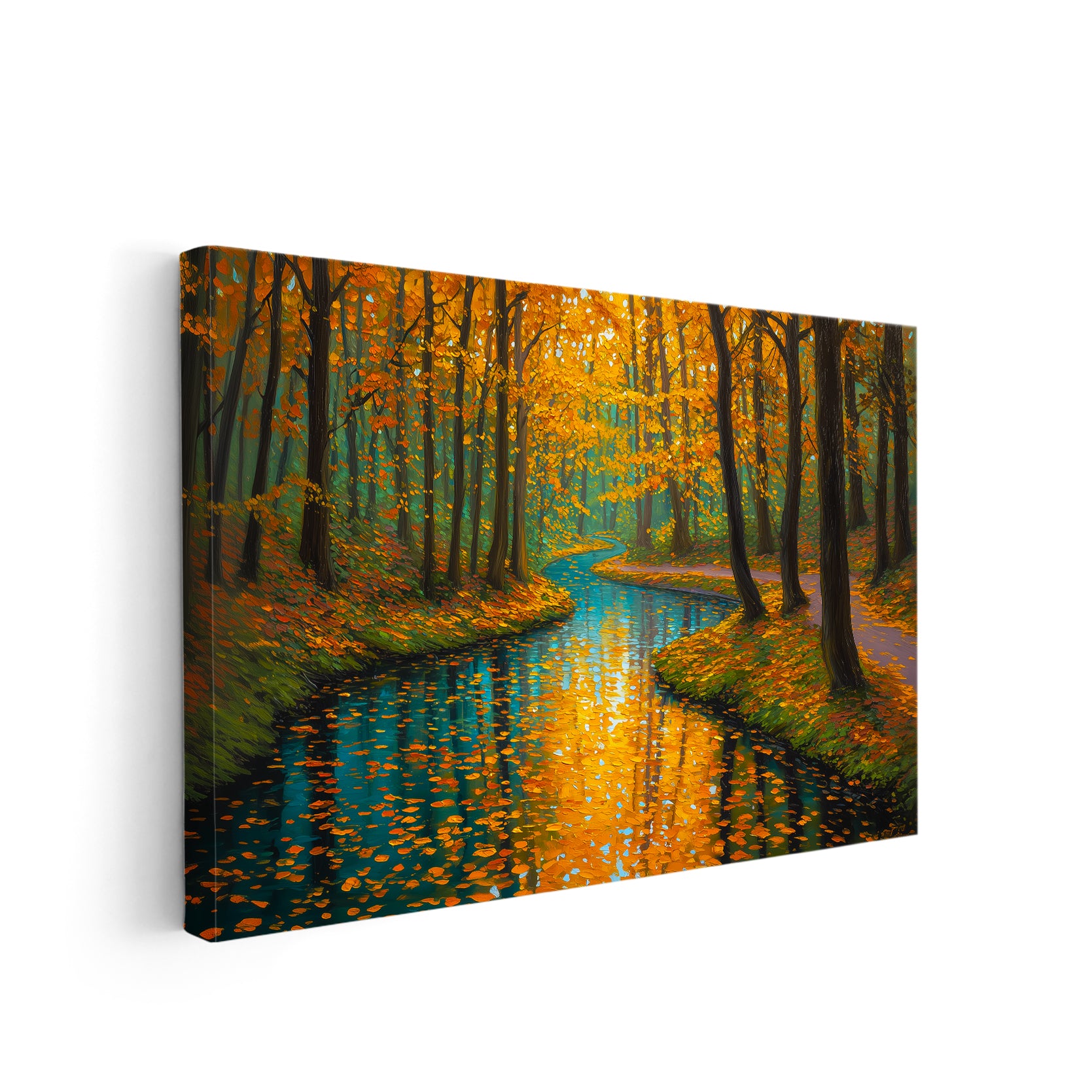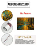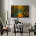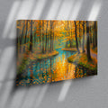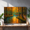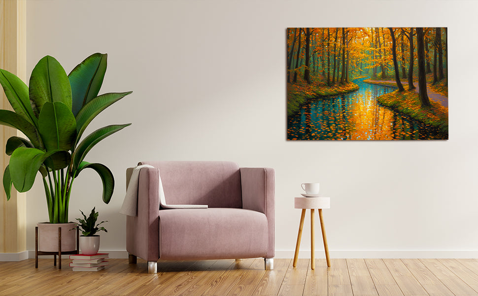 Capture the serene beauty of nature with this stunning canvas wall art featuring a tranquil forest stream framed by autumn foliage. The rich orange and cool blue palette creates a sophisticated color contrast that draws the eye and complements contemporary and traditional interiors alike. This landscape print serves as an ideal focal point above your sofa, beside your bed, or in any living space seeking warmth and natural elegance. The high-quality canvas construction ensures durability and vibrant color retention, while the expertly rendered composition brings depth and movement to your walls. Transform your home with this versatile piece that bridges the gap between gallery-quality art and accessible home décor.