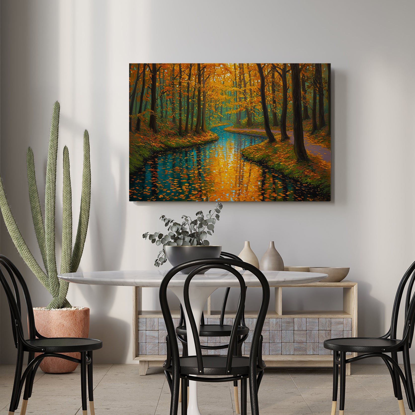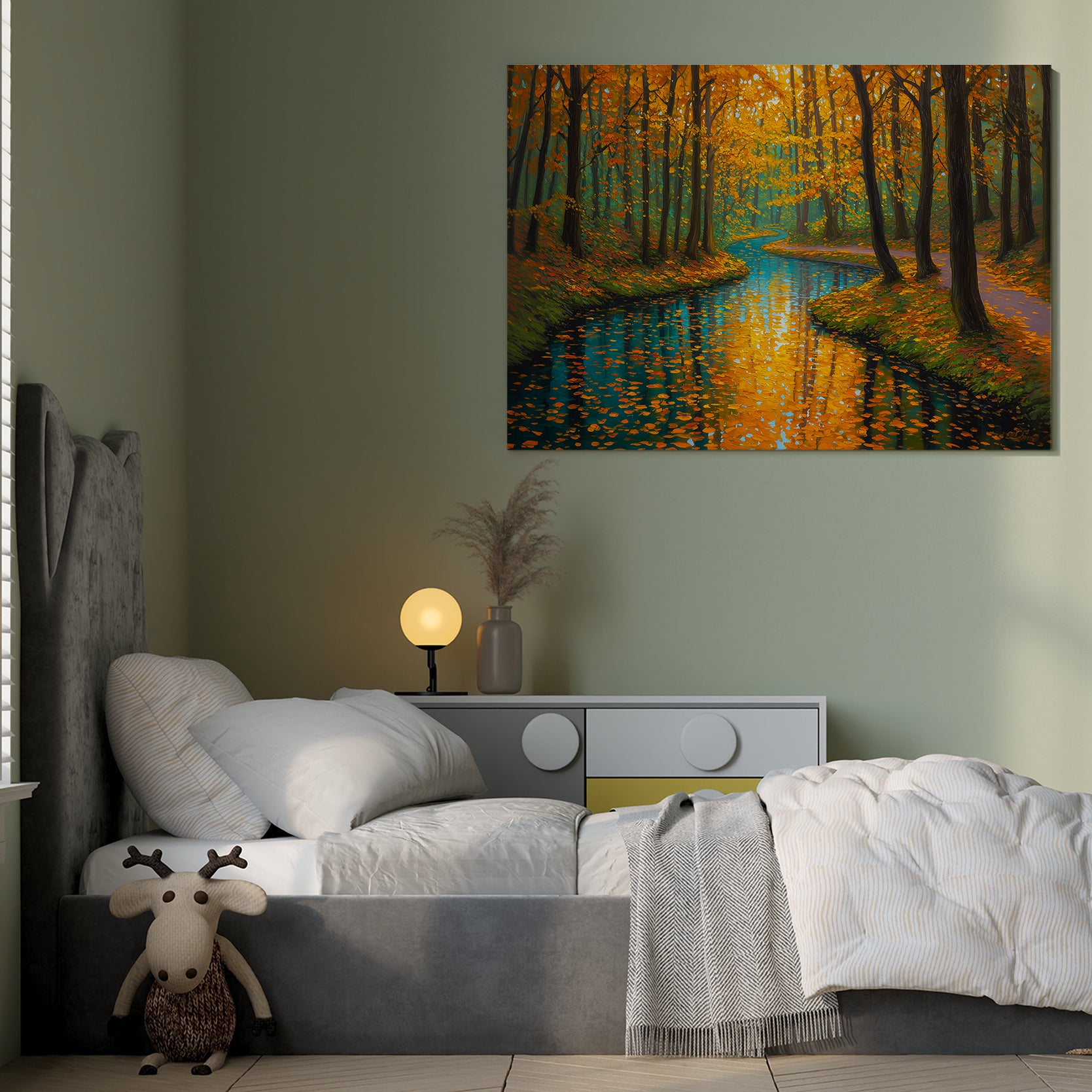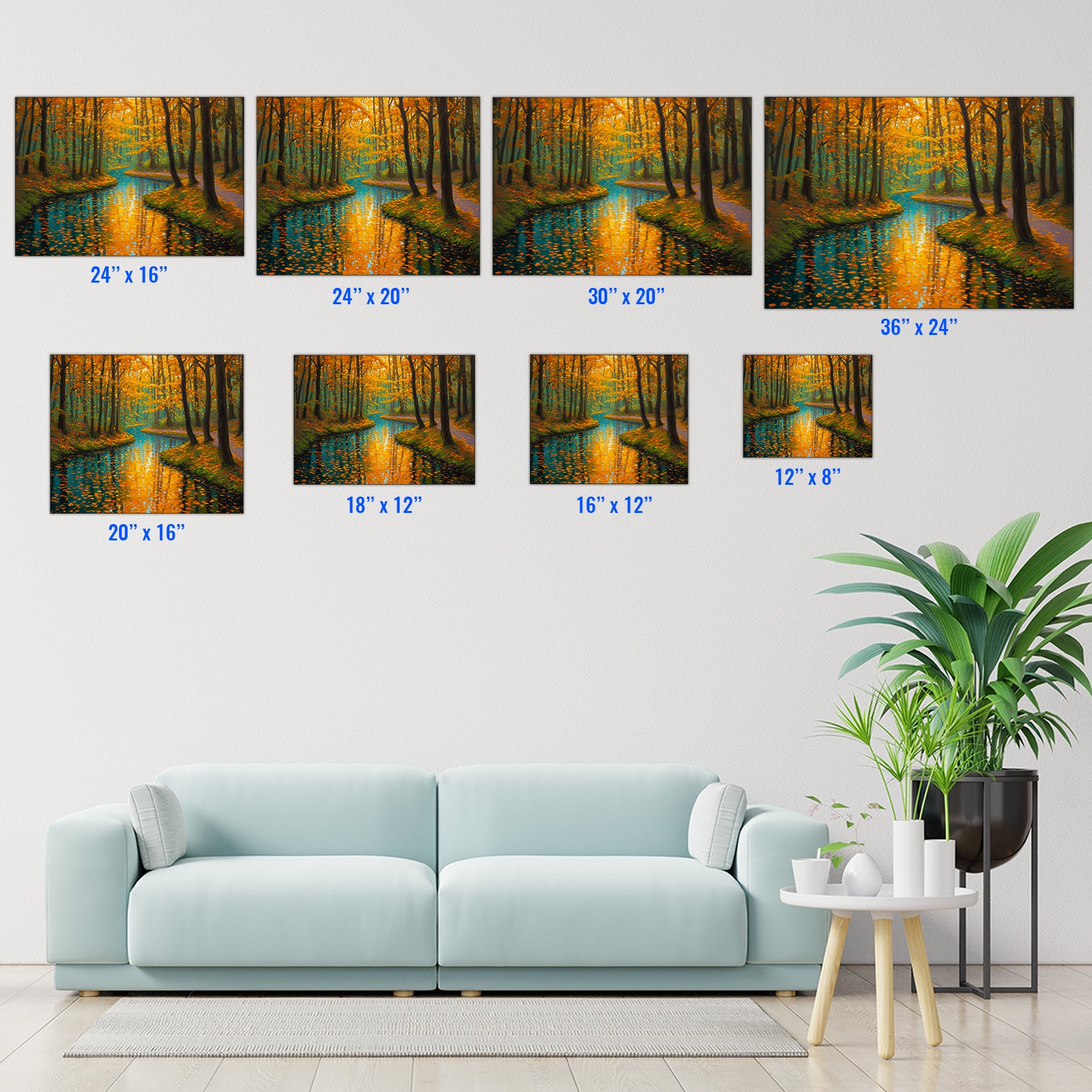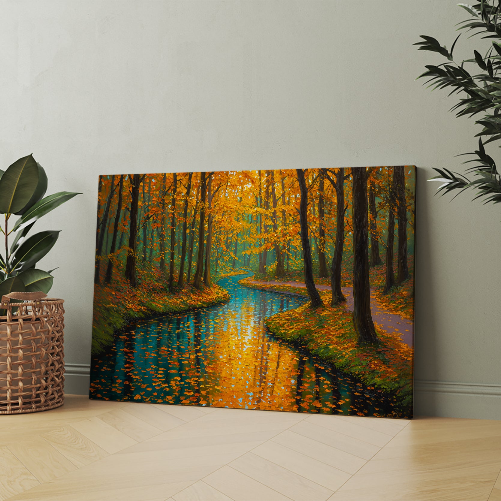Capture the serene beauty of nature with this stunning canvas wall art featuring a tranquil forest stream framed by autumn foliage. The rich orange and cool blue palette creates a sophisticated color contrast that draws the eye and complements contemporary and traditional interiors alike. This landscape print serves as an ideal focal point above your sofa, beside your bed, or in any living space seeking warmth and natural elegance. The high-quality canvas construction ensures durability and vibrant color retention, while the expertly rendered composition brings depth and movement to your walls. Transform your home with this versatile piece that bridges the gap between gallery-quality art and accessible home décor.