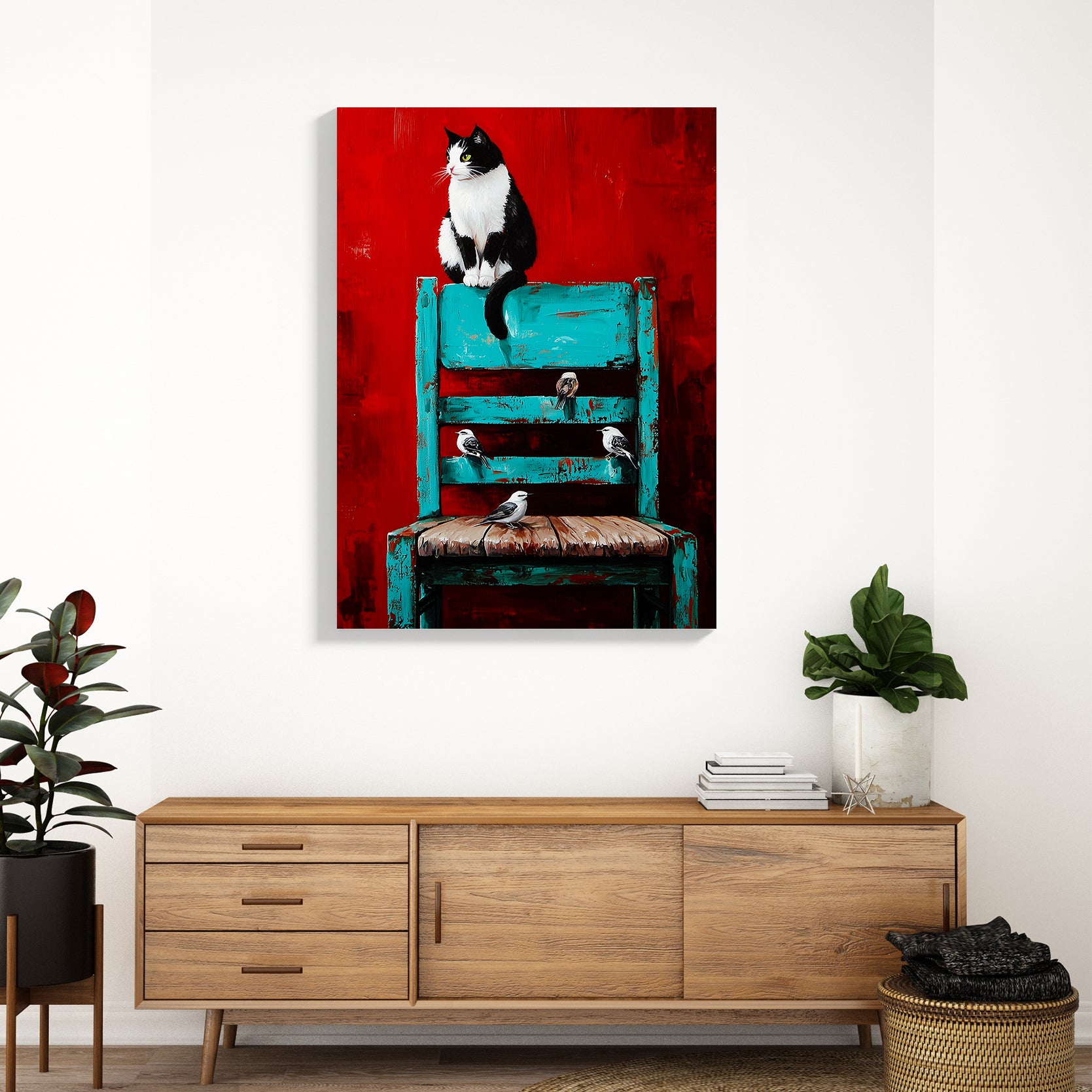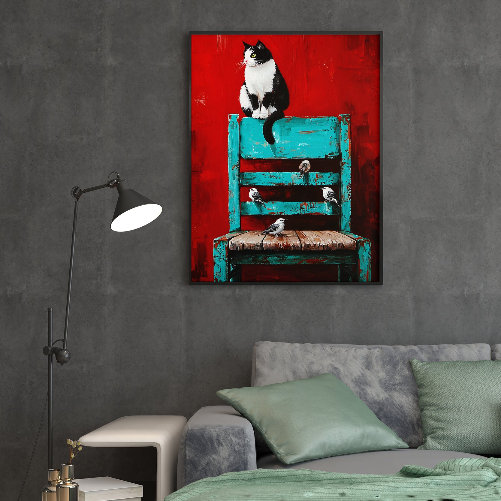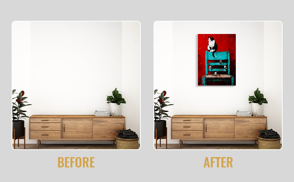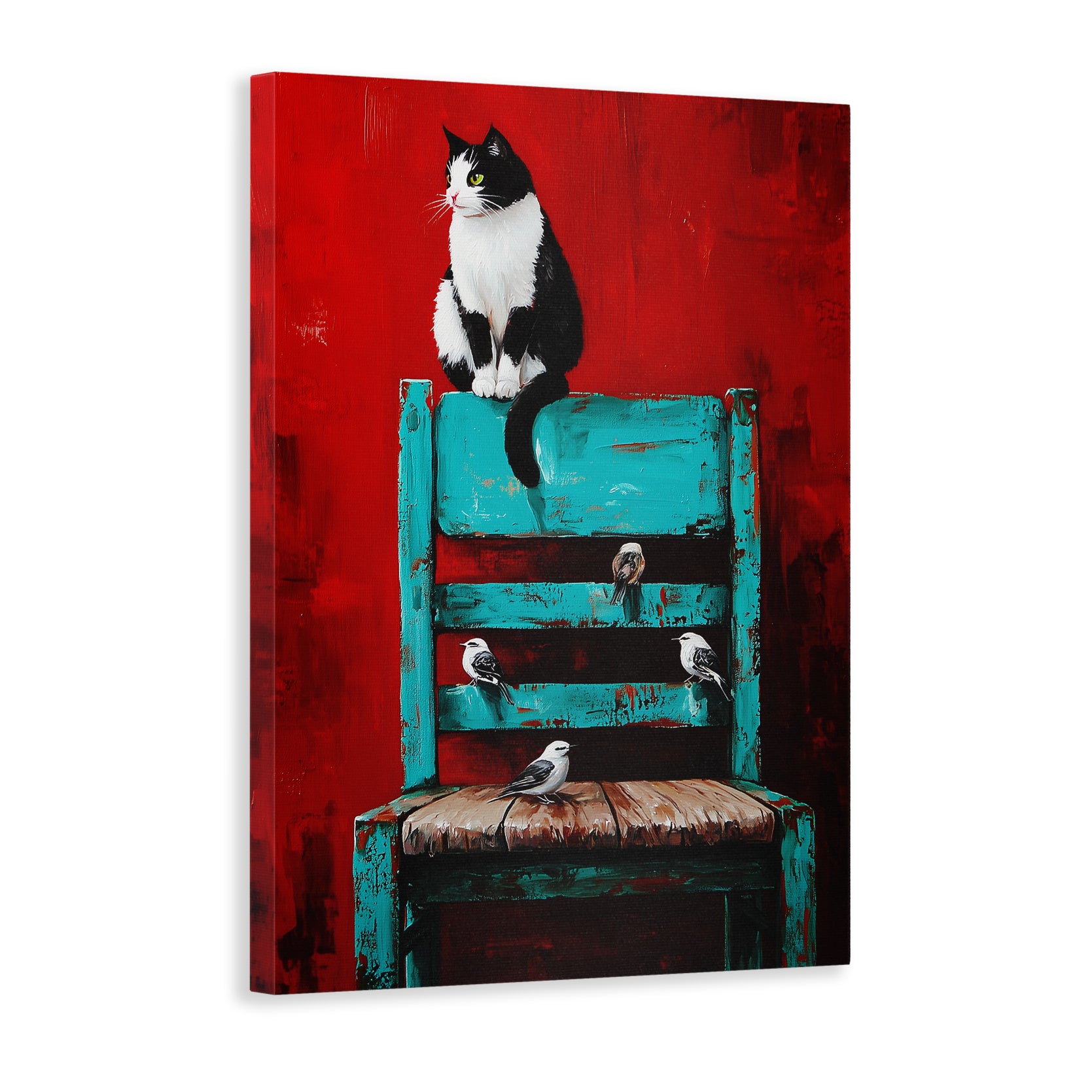 Transform your living space with this striking wall art canvas that masterfully blends contrasting elements. The composition features a captivating black and white cat alongside delicate birds, set against a bold red background that anchors the piece. A turquoise chair adds an unexpected pop of color, creating visual interest and contemporary appeal. This versatile canvas works beautifully as a sofa backdrop, bedside focal point, or standalone statement piece. The expert color palette—combining warm reds with cool turquoise accents—complements modern and eclectic interiors alike. Perfect for those seeking artwork that sparks conversation while maintaining sophisticated style.