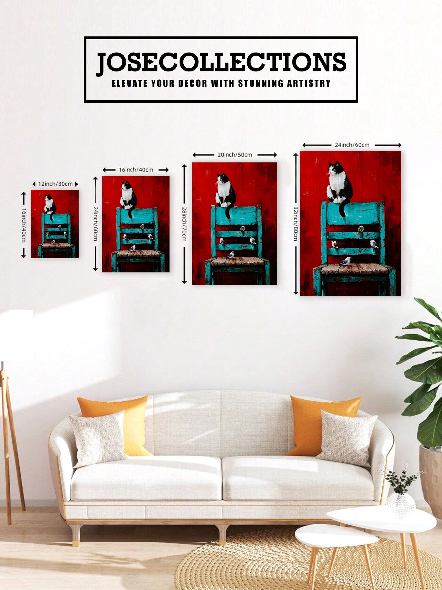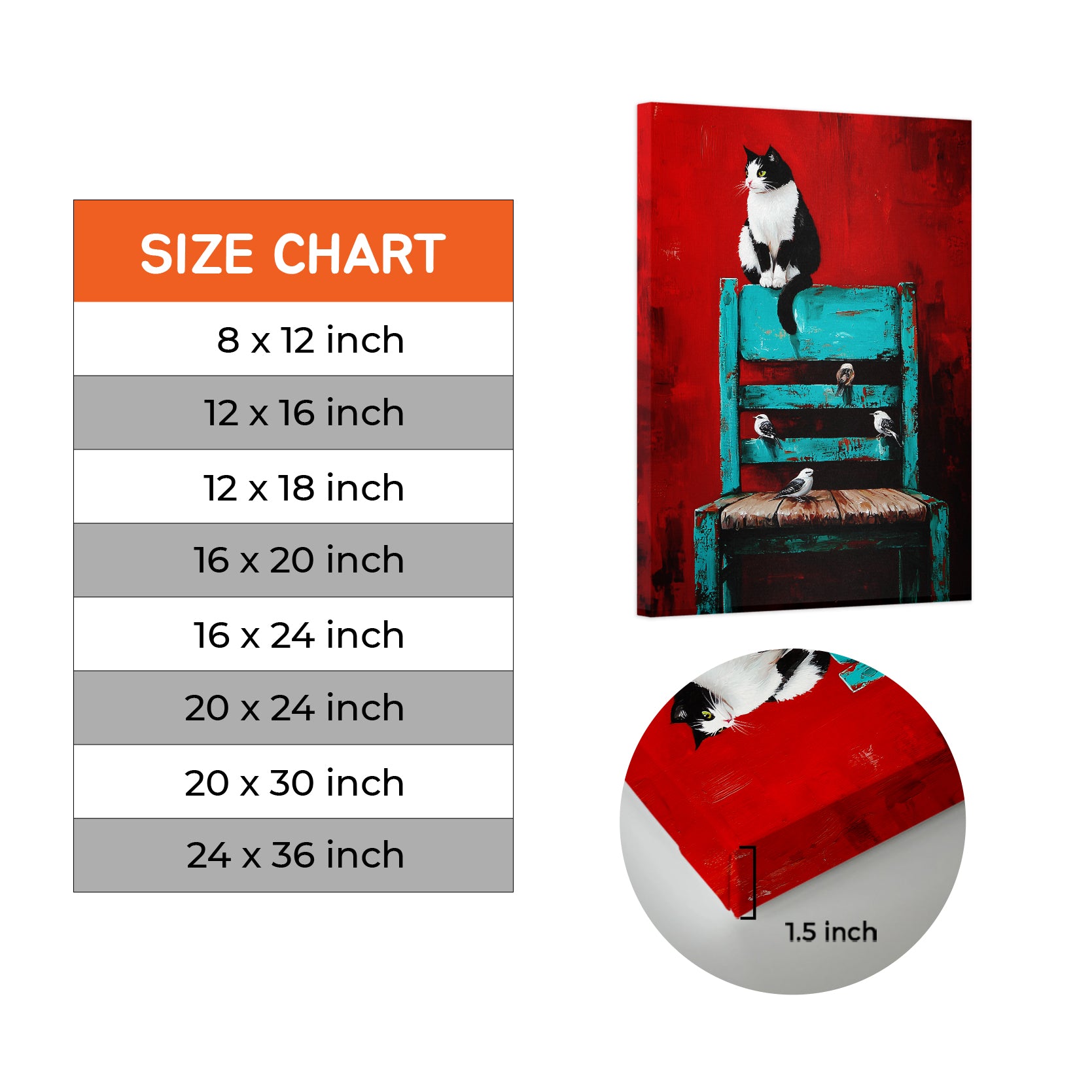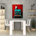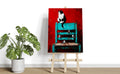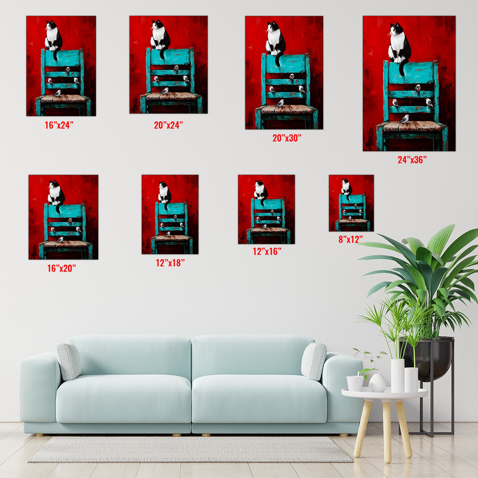 Transform your living space with this striking wall art canvas that masterfully blends contrasting elements. The composition features a captivating black and white cat alongside delicate birds, set against a bold red background that anchors the piece. A turquoise chair adds an unexpected pop of color, creating visual interest and contemporary appeal. This versatile canvas works beautifully as a sofa backdrop, bedside focal point, or standalone statement piece. The expert color palette—combining warm reds with cool turquoise accents—complements modern and eclectic interiors alike. Perfect for those seeking artwork that sparks conversation while maintaining sophisticated style.