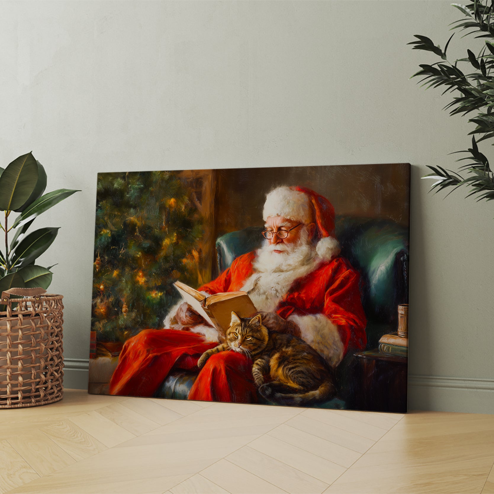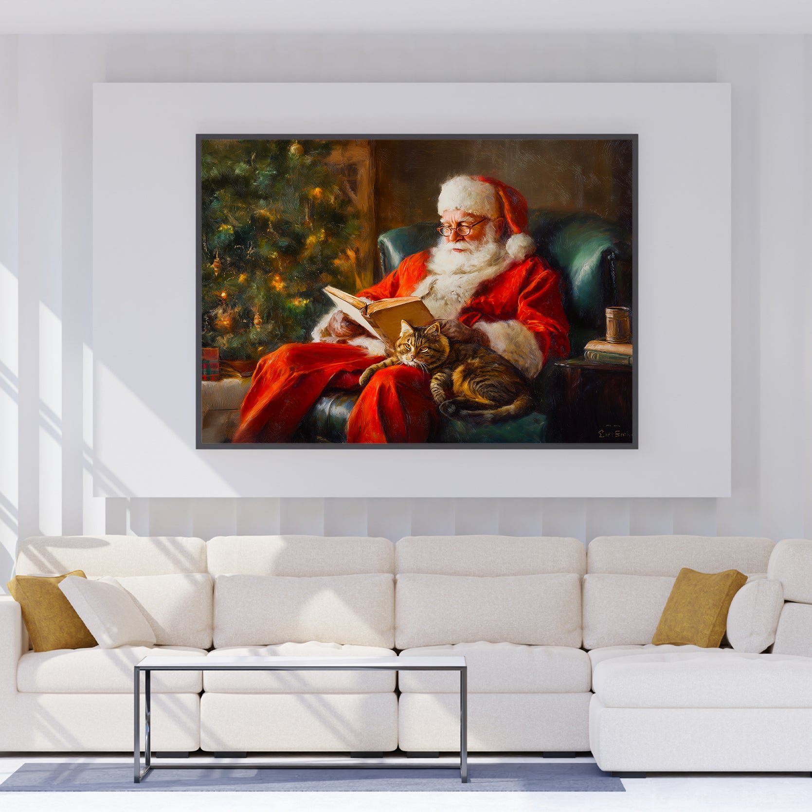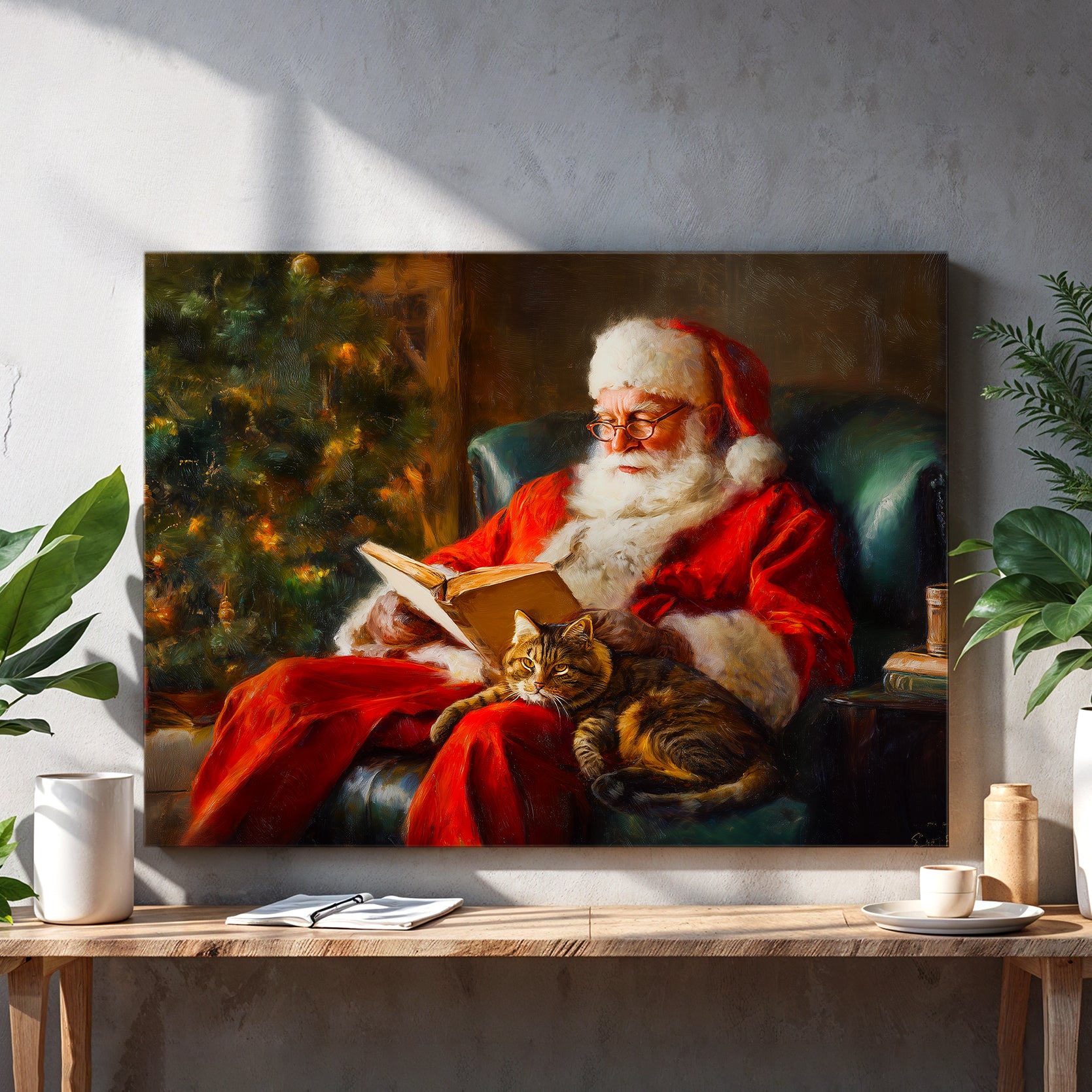 Bring festive warmth into your home with this charming canvas wall art featuring a traditional holiday scene. The composition captures a cozy moment with a cat nestled beside a decorated Christmas tree, evoking timeless seasonal charm. Perfect for creating a focal point above your sofa, anchoring a living room gallery wall, or adding character to bedroom spaces, this piece seamlessly complements classic and contemporary interiors alike. The canvas construction ensures durability and vibrant color retention, while the subject matter resonates with those who appreciate both holiday aesthetics and feline companionship. An ideal choice for transforming any room into a welcoming, festive sanctuary.