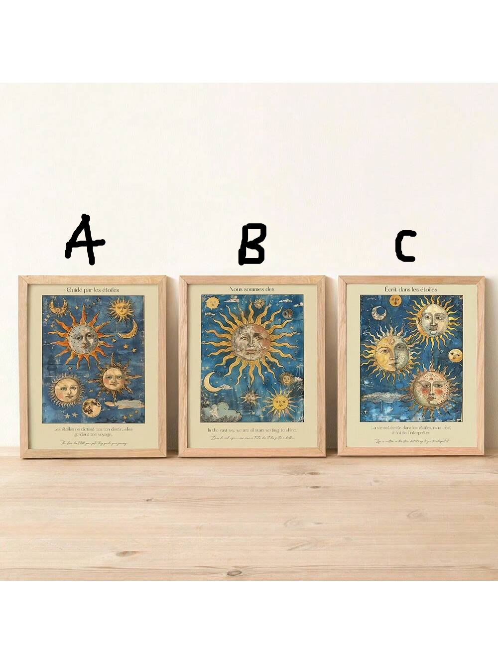 Celestial Sun and Moon Wall Art Posters - Modern Bohemian Cosmic Energy Illustrations in Frames