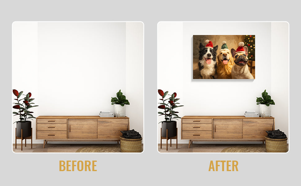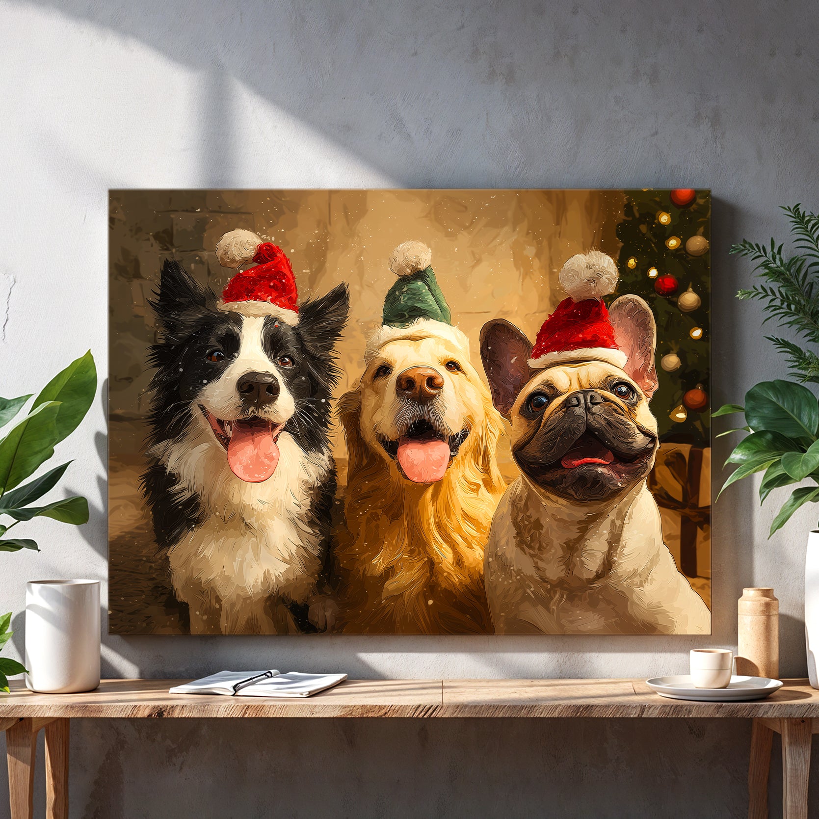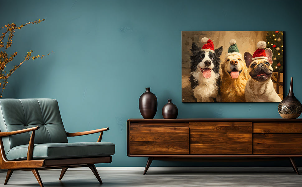 Bring festive cheer to your home with this charming canvas wall art featuring adorable dogs dressed in Santa hats. Perfect for the holiday season, this piece combines playful pet imagery with classic Christmas spirit, making it an ideal accent for living rooms, bedside spaces, or above sofas. The vibrant, cheerful design captures the warmth of the season while adding personality to any room.