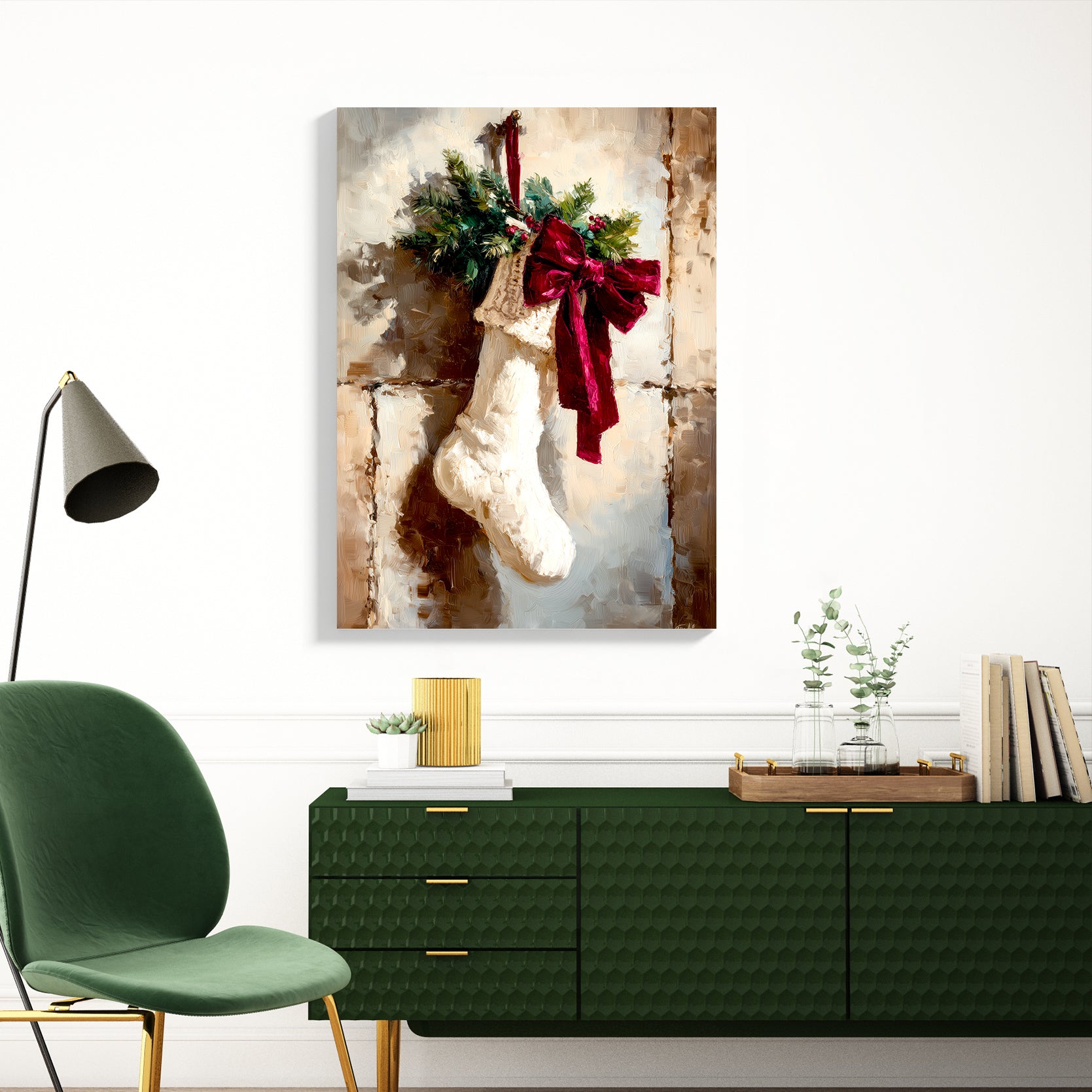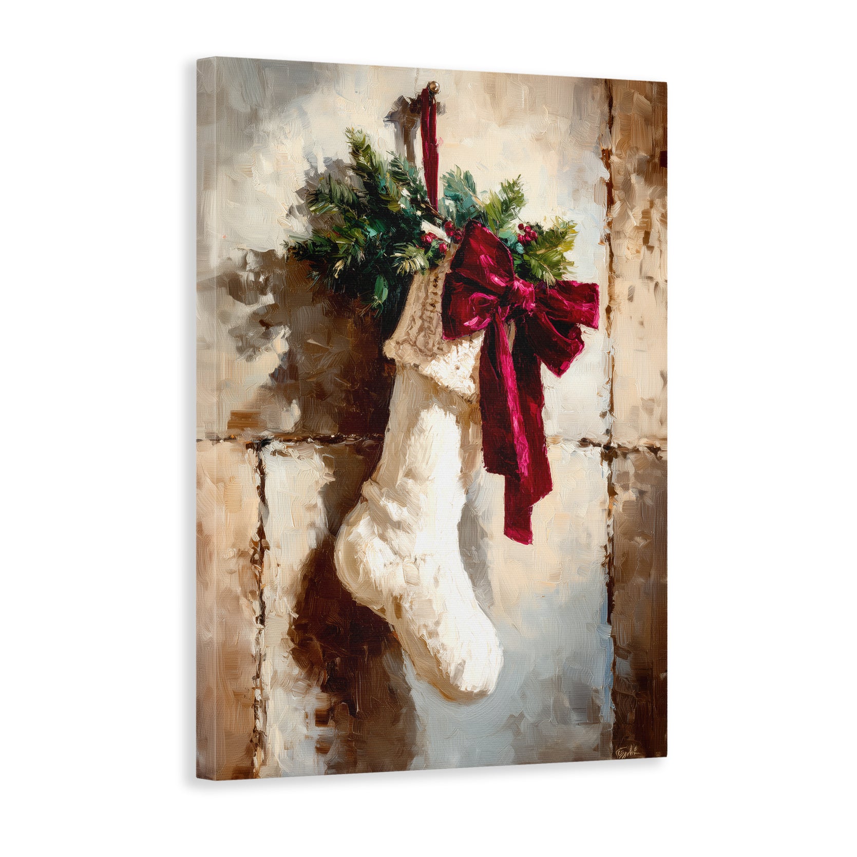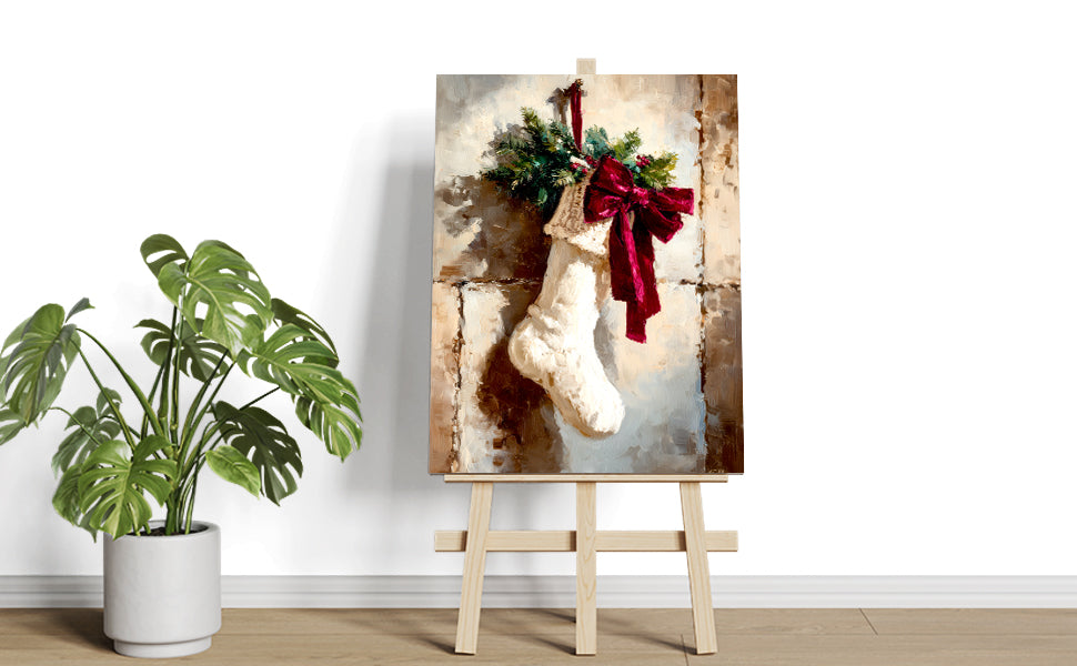 Elevate your seasonal décor with this sophisticated Christmas stocking canvas print, expertly designed to capture the warmth of holiday traditions. Featuring a beautifully rendered stocking adorned with a vibrant red bow and lush greenery accents, this piece brings festive elegance to any room. The high-quality canvas construction ensures lasting color vibrancy and durability, making it an ideal choice for living rooms, bedroom walls, or above sofas. Its versatile design complements both traditional and contemporary interiors, while the timeless holiday imagery creates an inviting atmosphere that resonates throughout the season and beyond. Transform your space into a curated holiday retreat with this refined wall art.