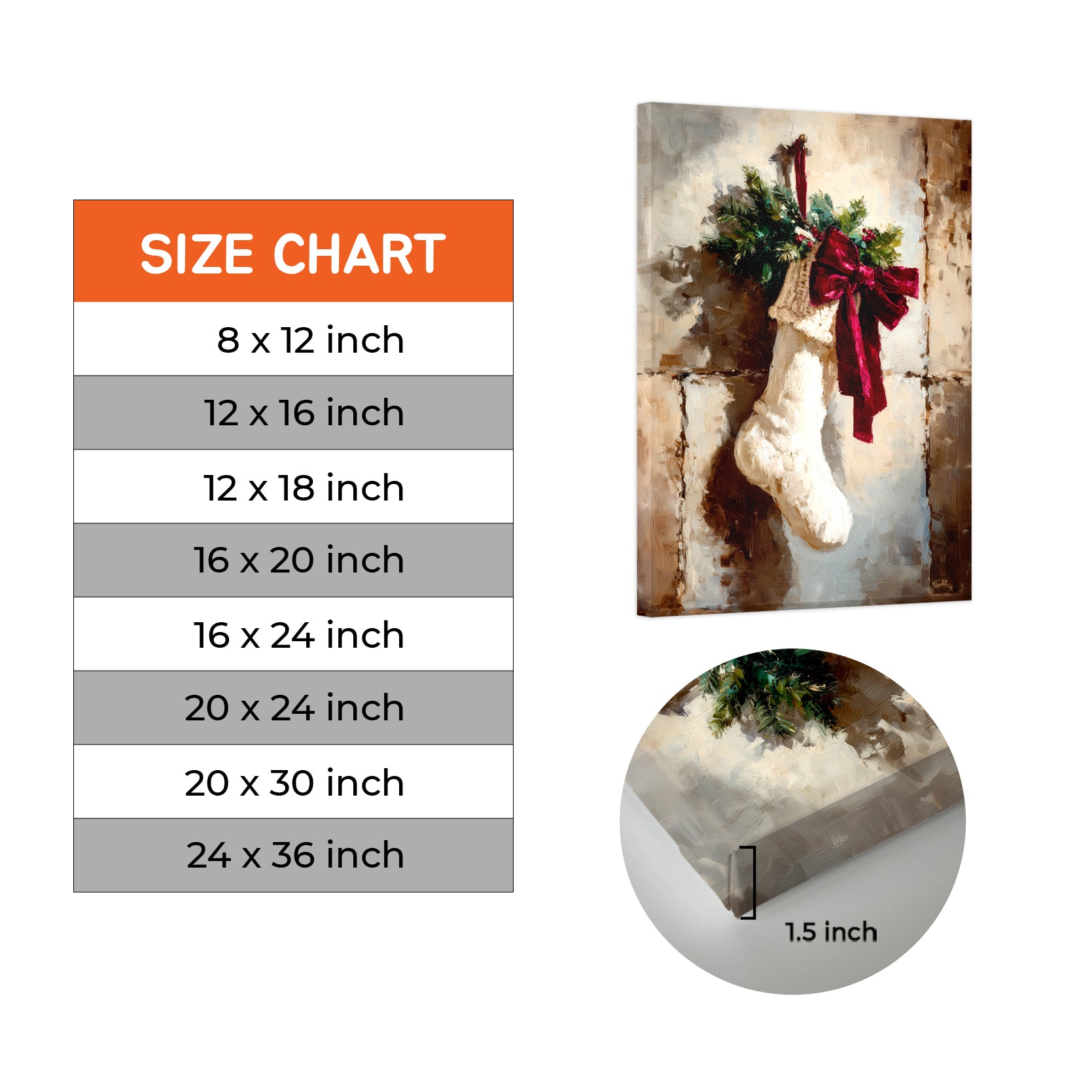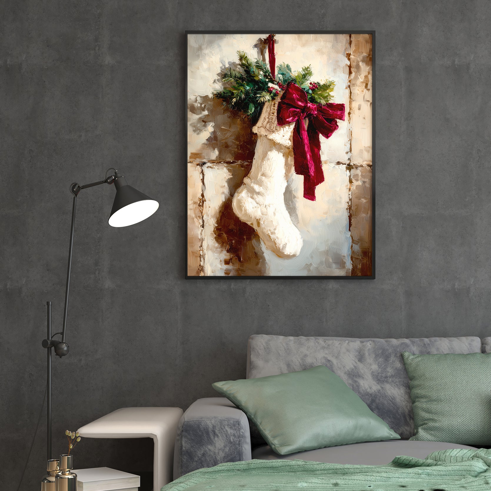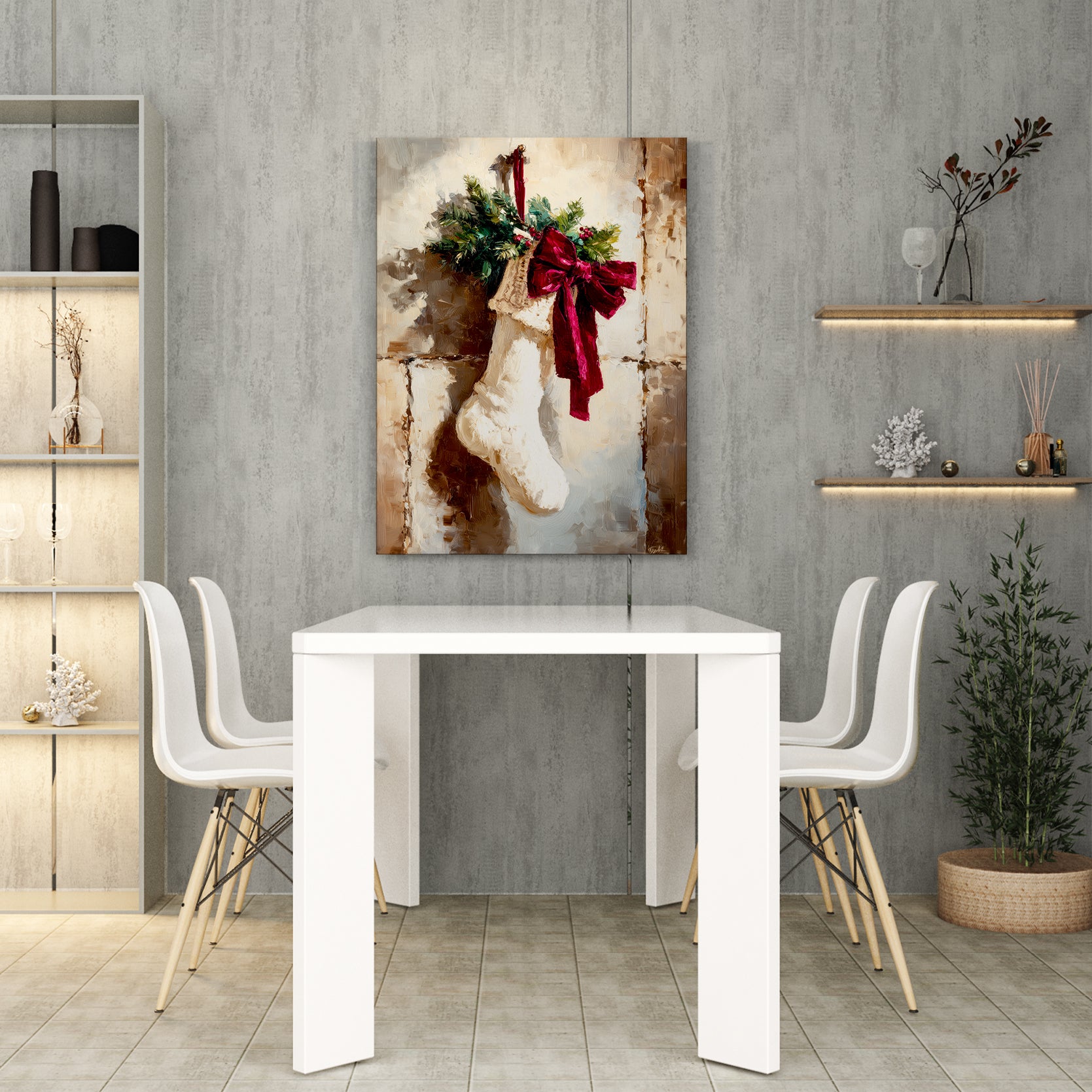 Elevate your seasonal décor with this sophisticated Christmas stocking canvas print, expertly designed to capture the warmth of holiday traditions. Featuring a beautifully rendered stocking adorned with a vibrant red bow and lush greenery accents, this piece brings festive elegance to any room. The high-quality canvas construction ensures lasting color vibrancy and durability, making it an ideal choice for living rooms, bedroom walls, or above sofas. Its versatile design complements both traditional and contemporary interiors, while the timeless holiday imagery creates an inviting atmosphere that resonates throughout the season and beyond. Transform your space into a curated holiday retreat with this refined wall art.