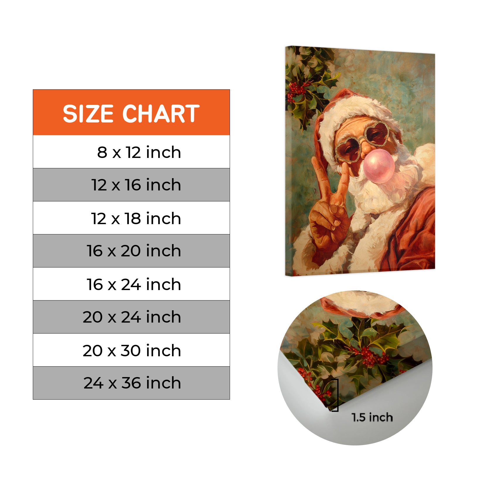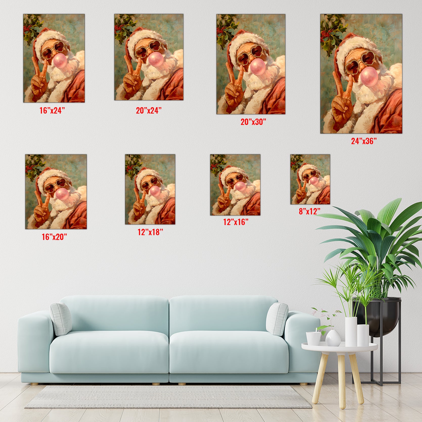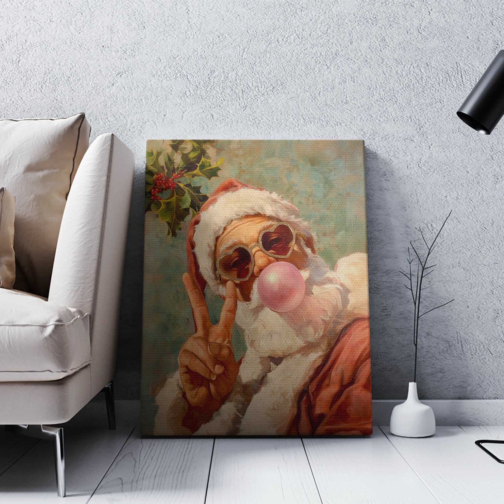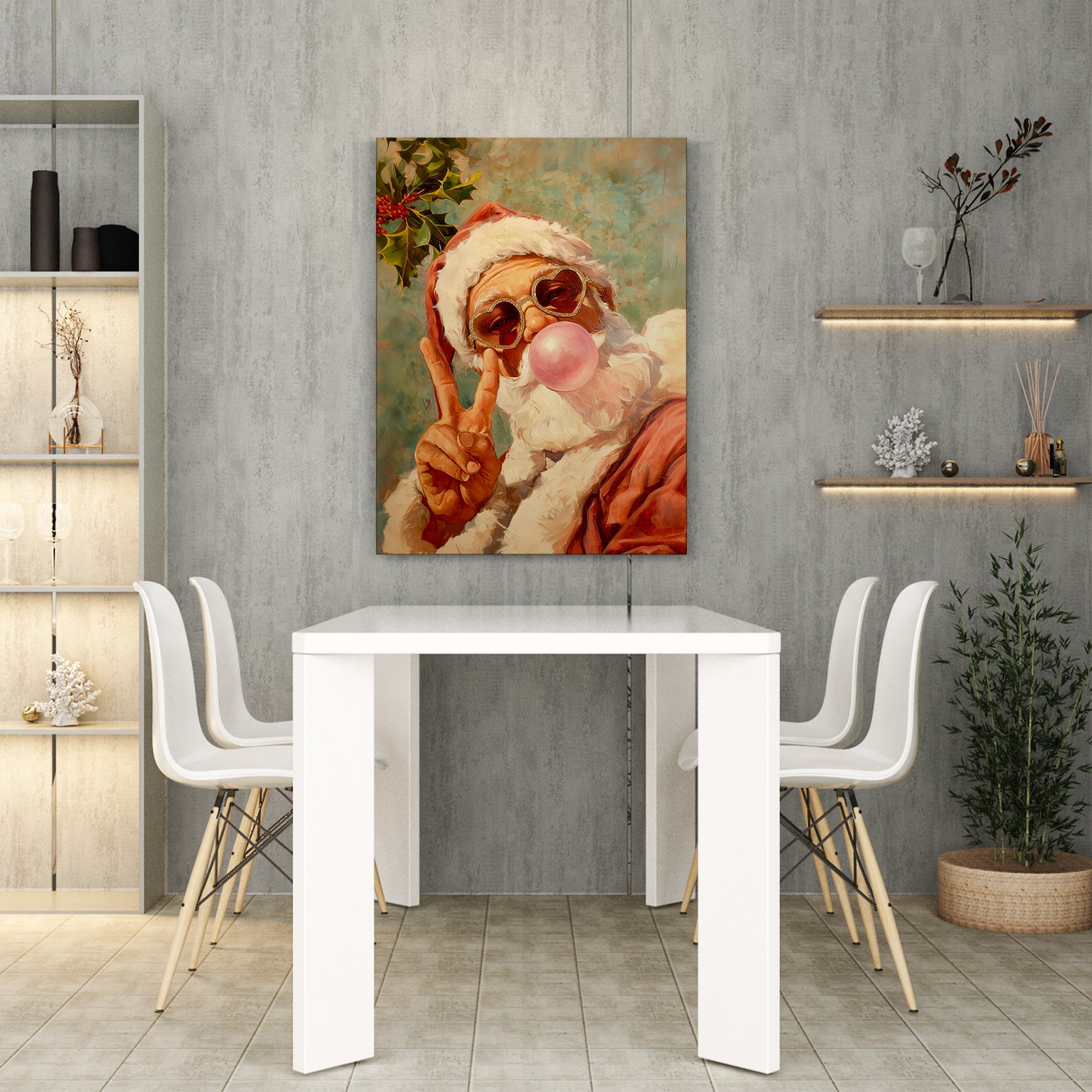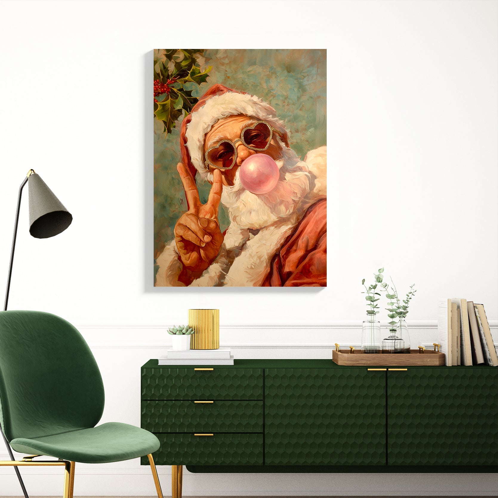 Elevate your space with this striking Santa Claus portrait canvas, reimagined with contemporary flair. Featuring a playful Santa sporting trendy bubble gum and heart-shaped glasses, this artwork blends festive tradition with modern pop art aesthetics. The vibrant composition makes an ideal focal point above your sofa, in the living room, or beside your bed. Crafted on premium canvas with vivid color reproduction, it transforms any room into a conversation-starting gallery. Perfect for those seeking holiday décor that breaks from convention while maintaining seasonal charm. A sophisticated yet whimsical addition to your home.