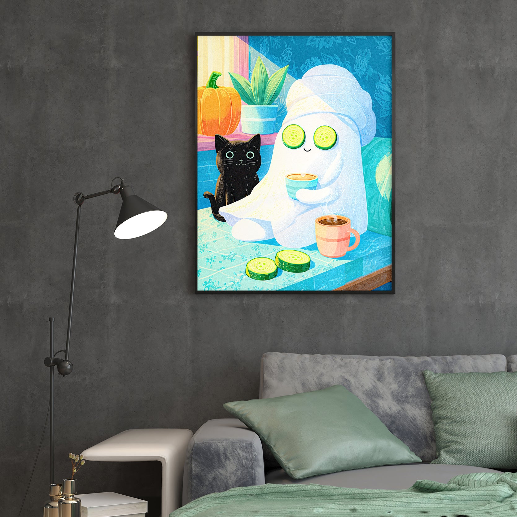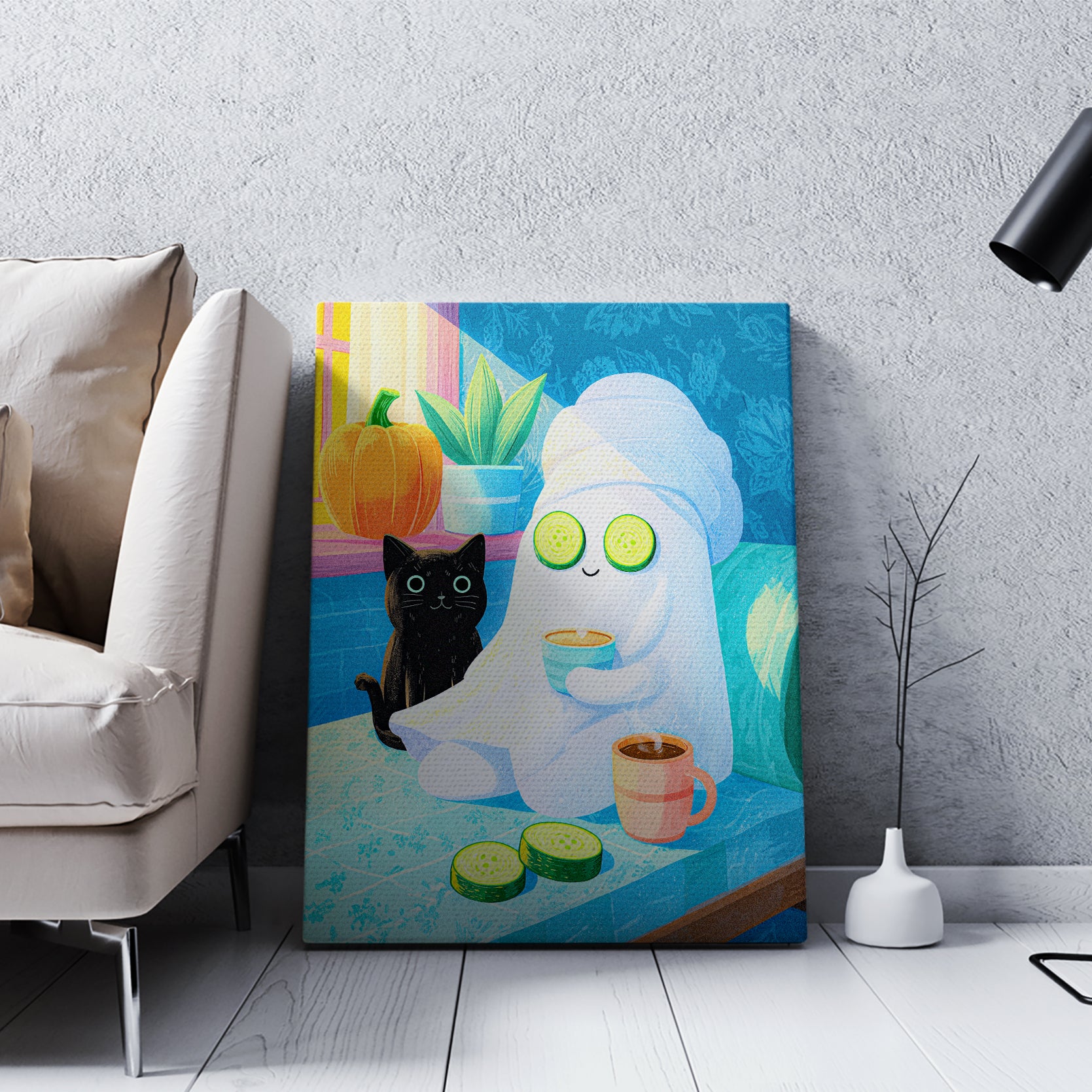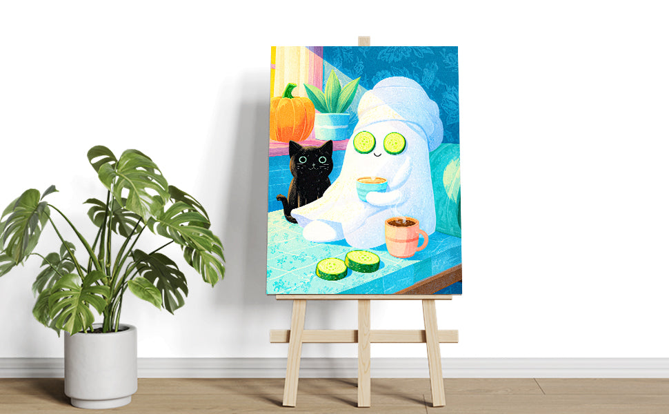 Bring playful Halloween charm to any space with this delightful art print featuring an adorable black cat and friendly ghost enjoying a spa day. Perfect for living rooms, bedside tables, or above sofas, this whimsical design combines seasonal flair with cozy comfort. The charming illustration adds personality and warmth to your home decor while maintaining an approachable, lighthearted aesthetic. Ideal for Halloween enthusiasts and those who appreciate quirky, artistic touches year-round.