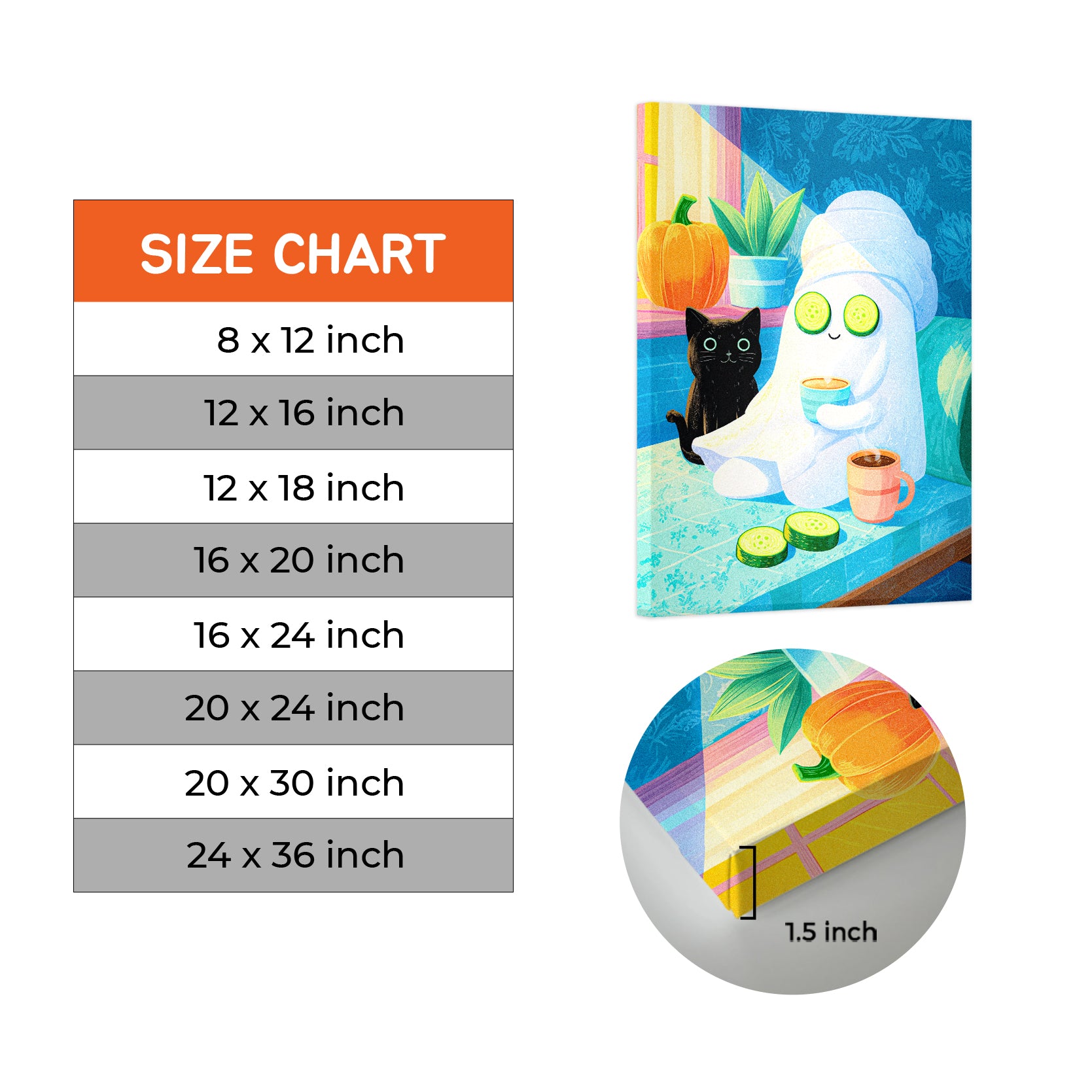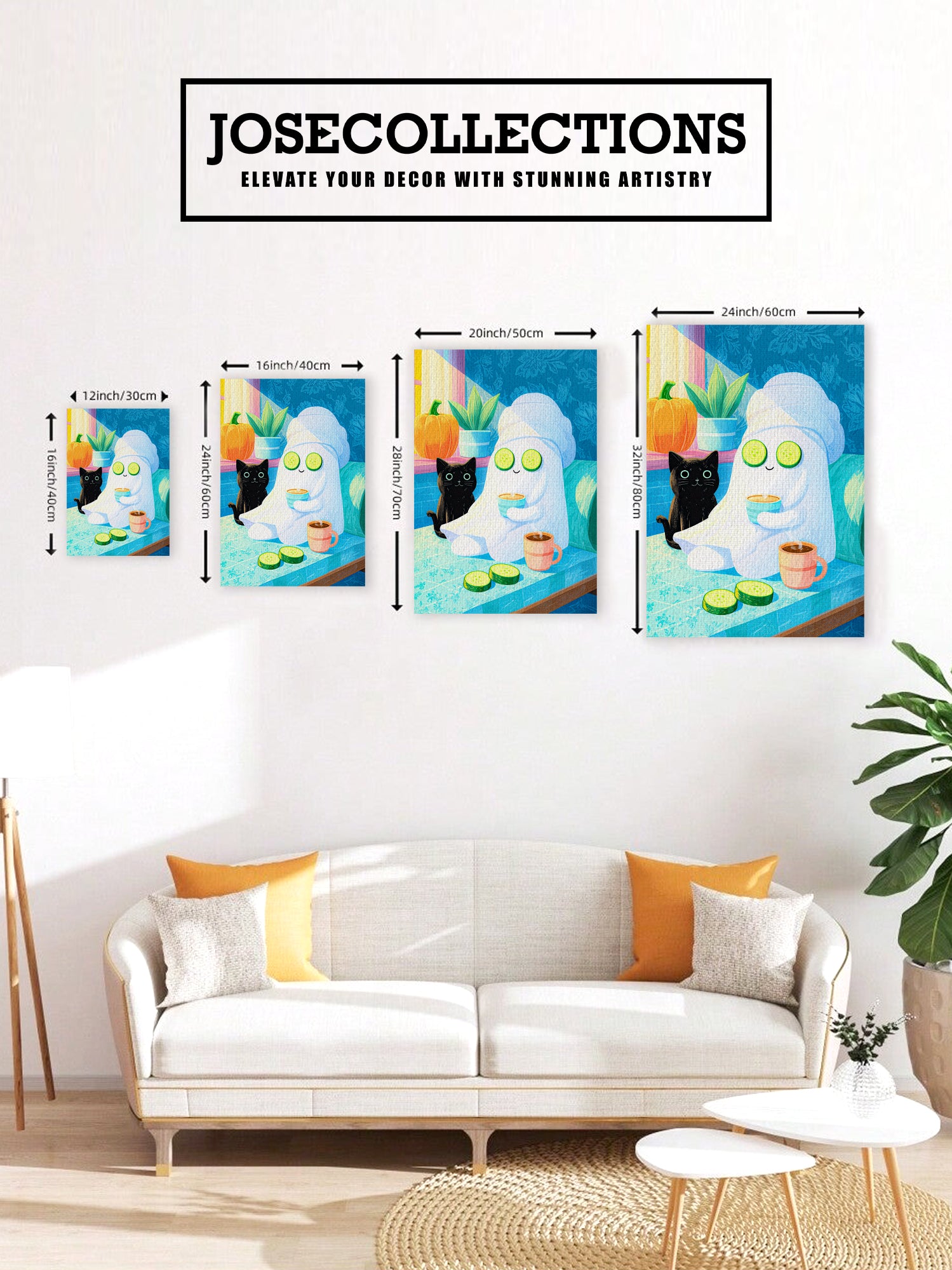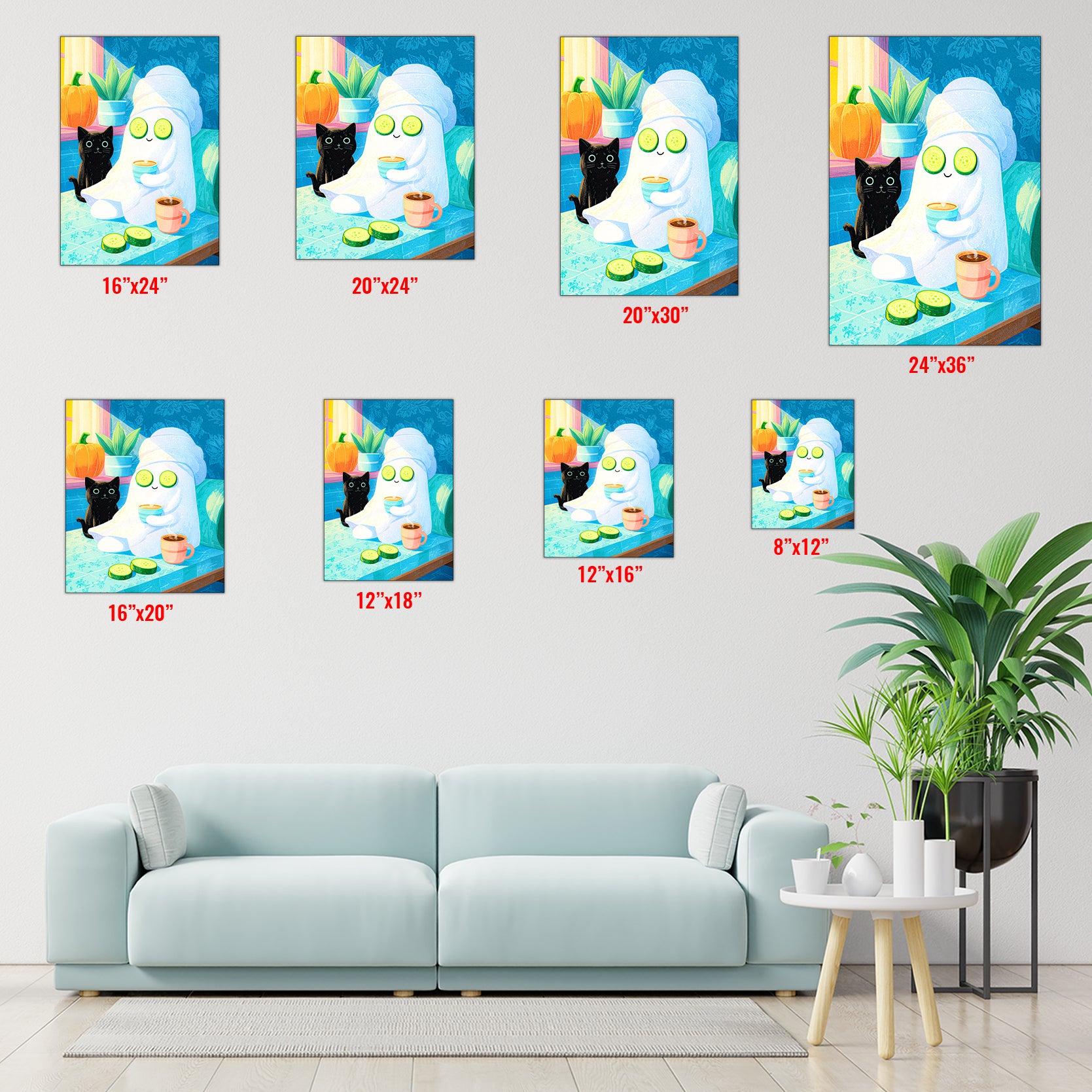 Bring playful Halloween charm to any space with this delightful art print featuring an adorable black cat and friendly ghost enjoying a spa day. Perfect for living rooms, bedside tables, or above sofas, this whimsical design combines seasonal flair with cozy comfort. The charming illustration adds personality and warmth to your home decor while maintaining an approachable, lighthearted aesthetic. Ideal for Halloween enthusiasts and those who appreciate quirky, artistic touches year-round.