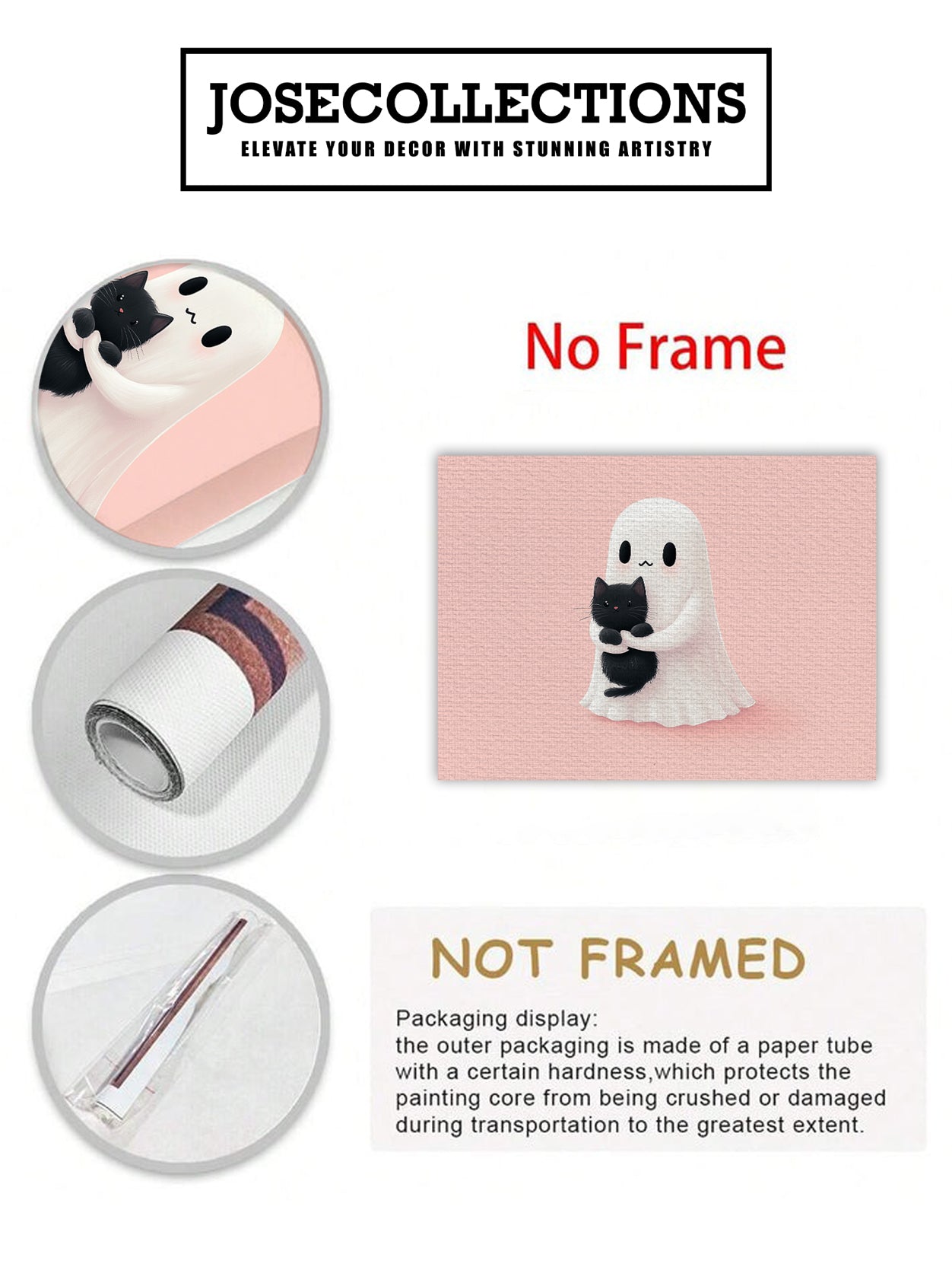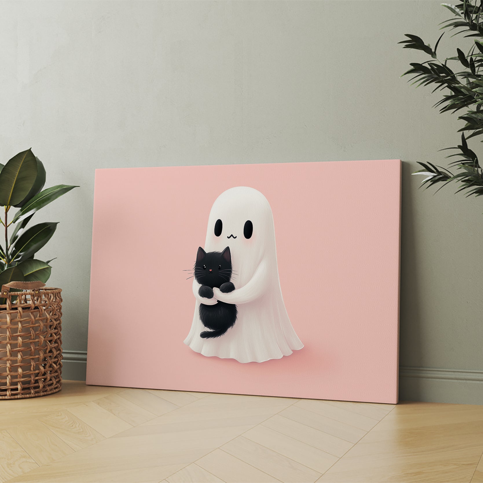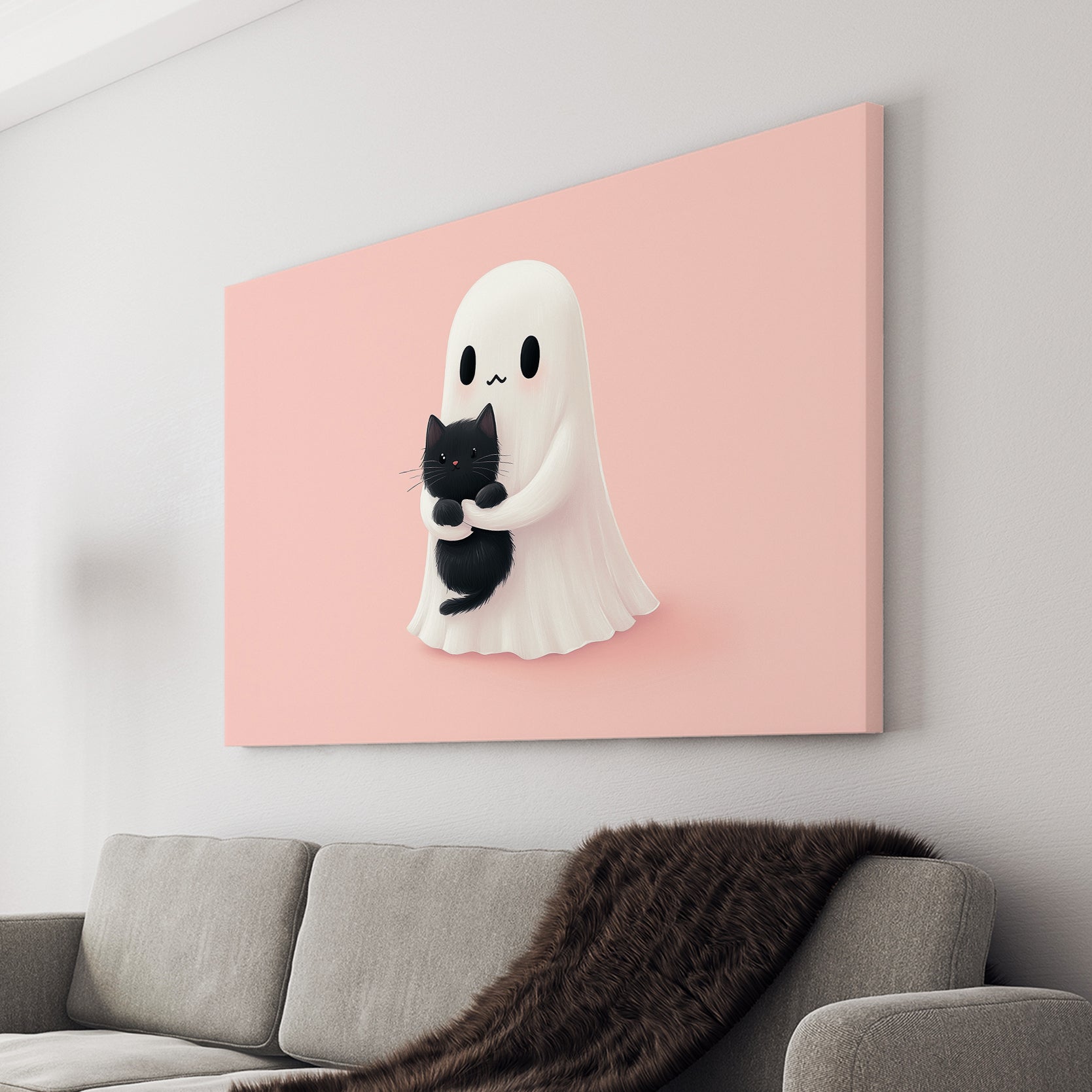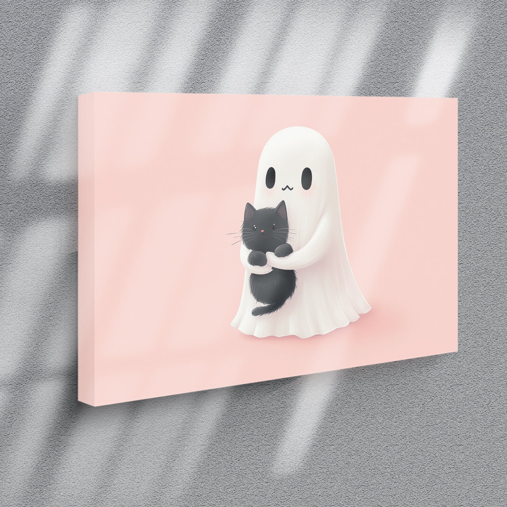 Add a touch of whimsy and charm to any room with our Cute Ghost and Black Cat Wall Art. Featuring a playful design on a soothing pink background, this canvas print is perfect for living rooms, sofas, and bedside decor. Elevate your home decor with this unique and adorable piece.
