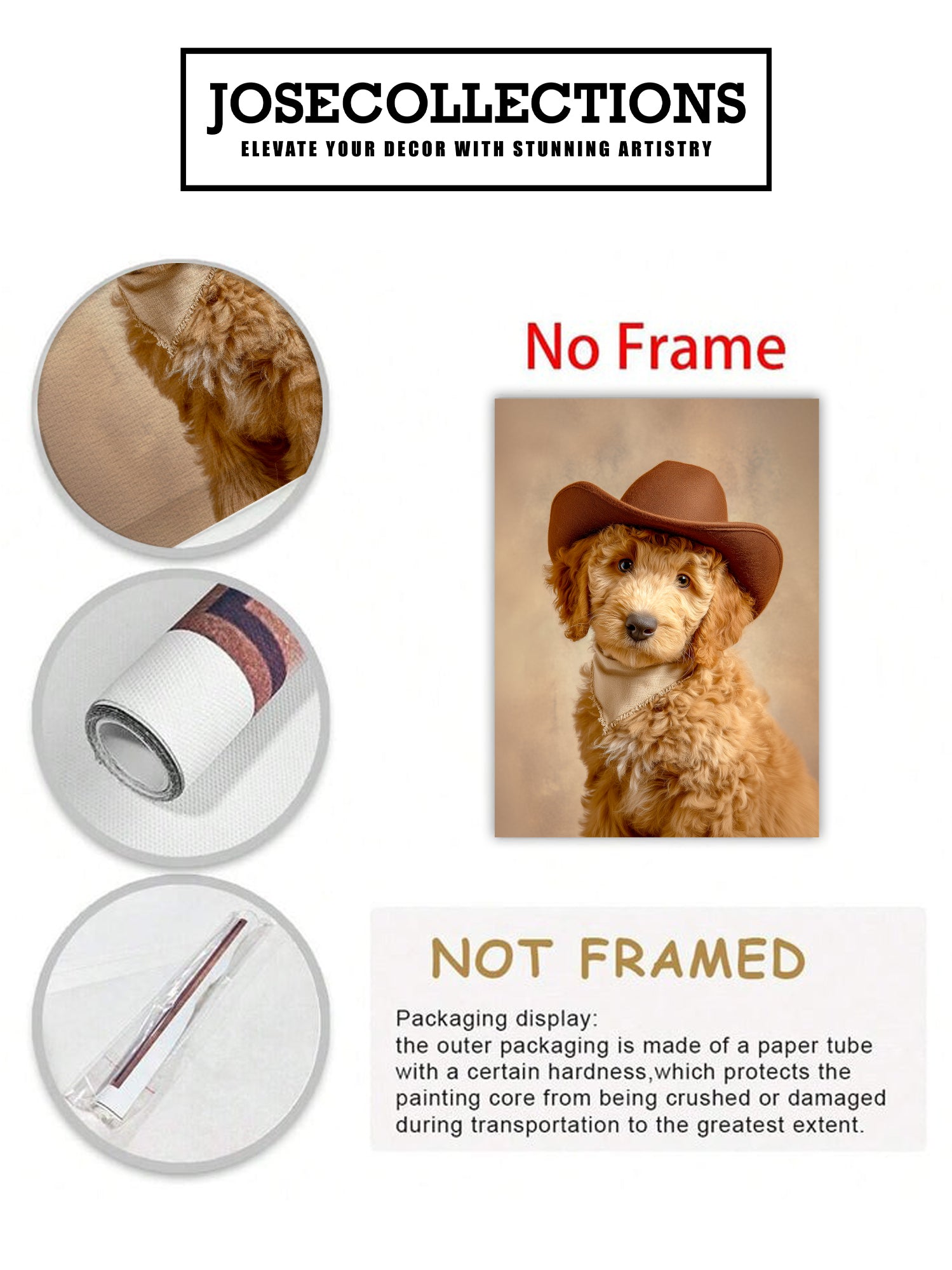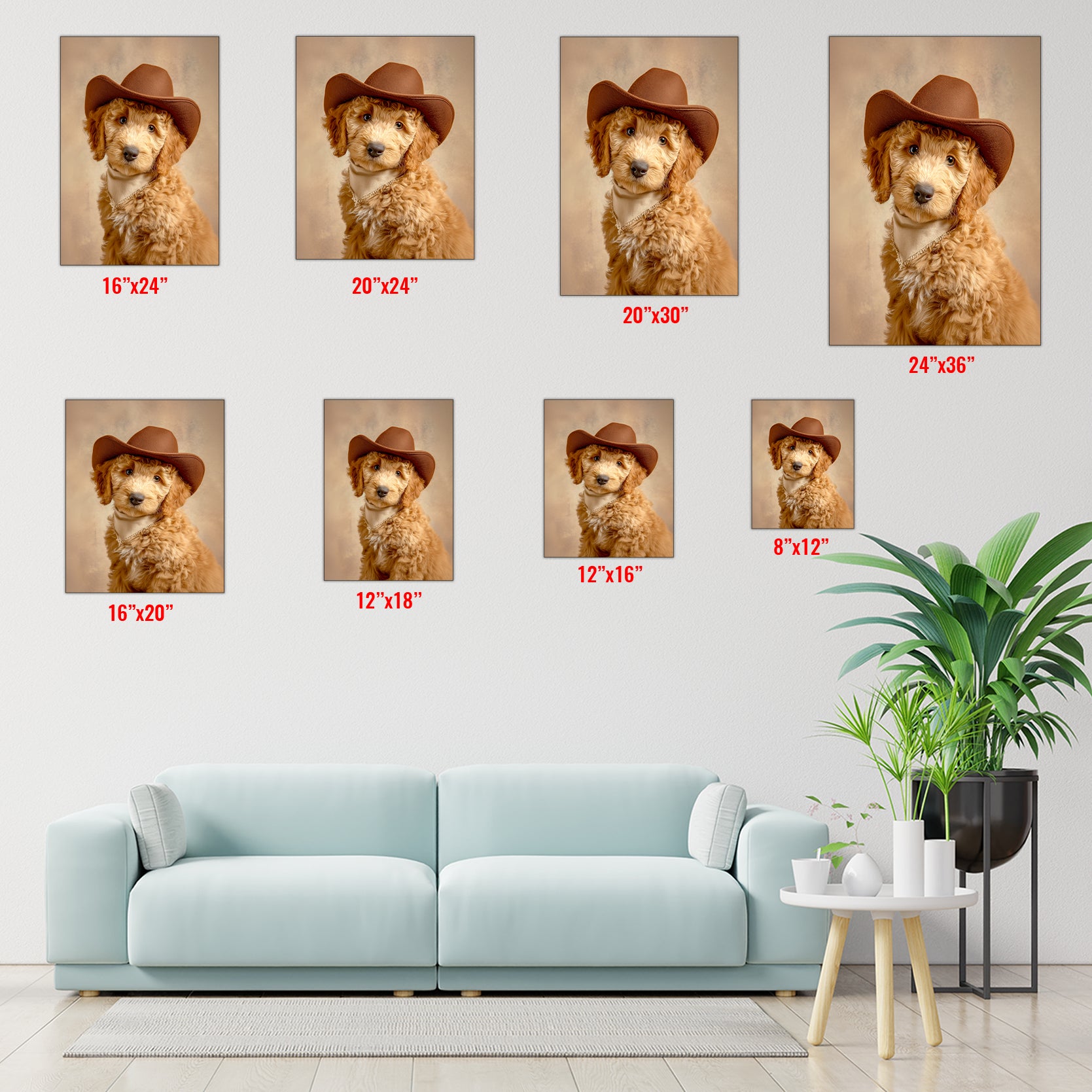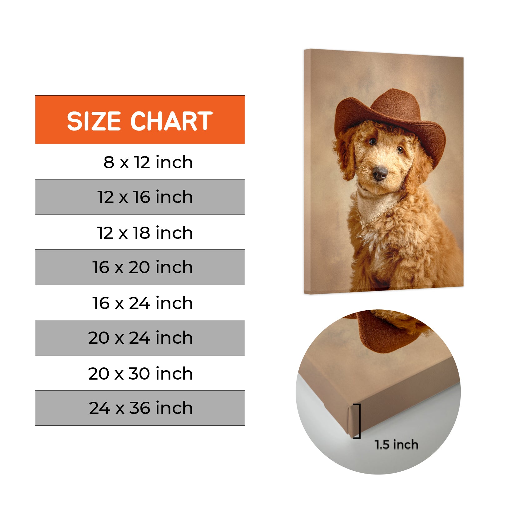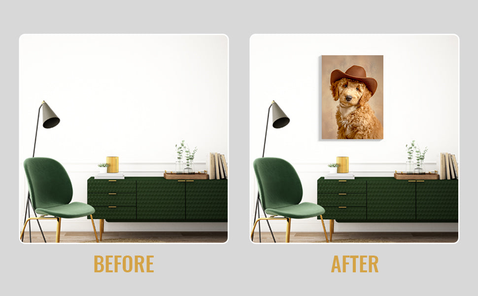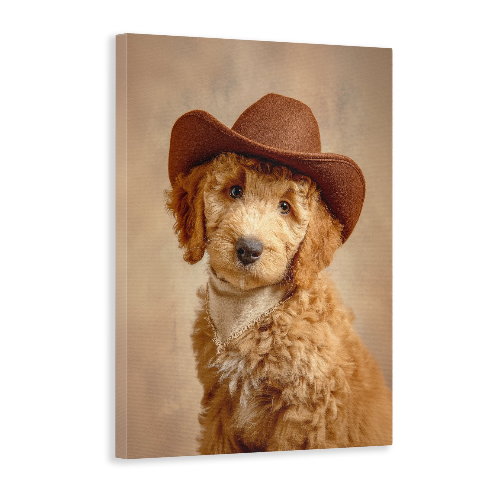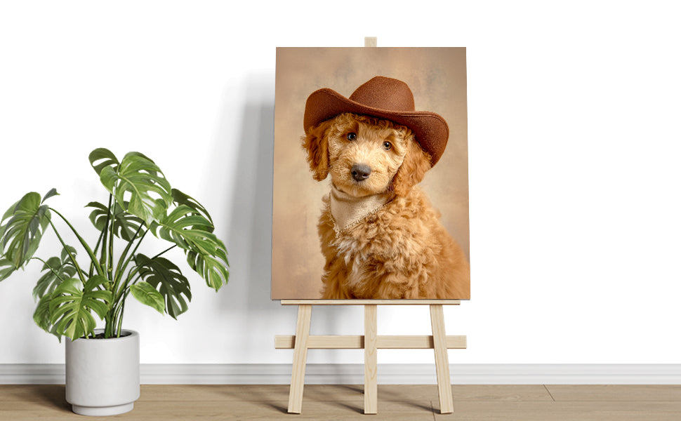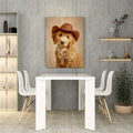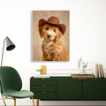 This charming canvas portrait captures a spirited dog sporting a classic cowboy hat, bringing personality and warmth to any interior space. The artwork combines playful Western aesthetics with pet-lover appeal, making it an ideal focal point for living rooms, bedrooms, or spaces above sofas. The high-quality canvas construction ensures durability and vibrant color reproduction, while the versatile design complements both traditional and contemporary décor styles. Perfect for dog enthusiasts seeking distinctive wall art that sparks conversation and adds character to their home environment.