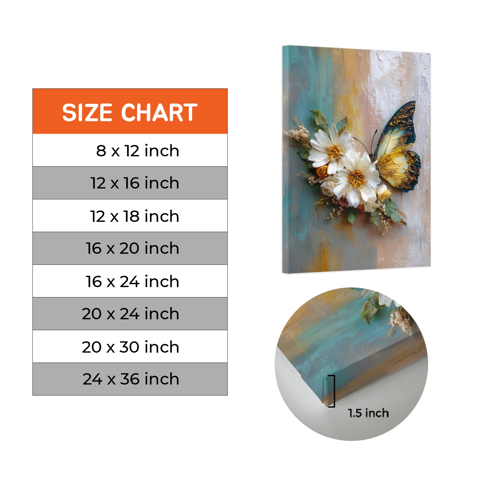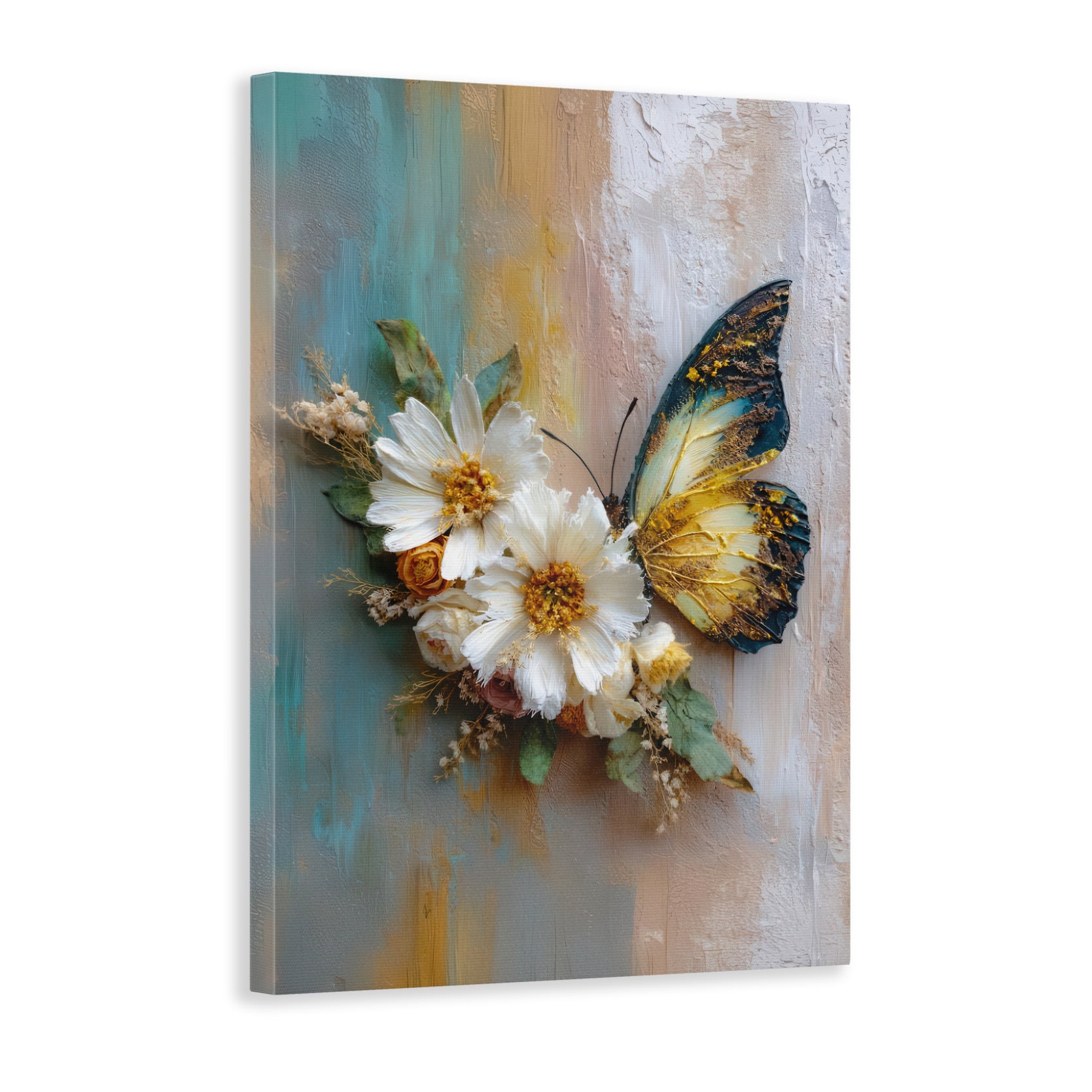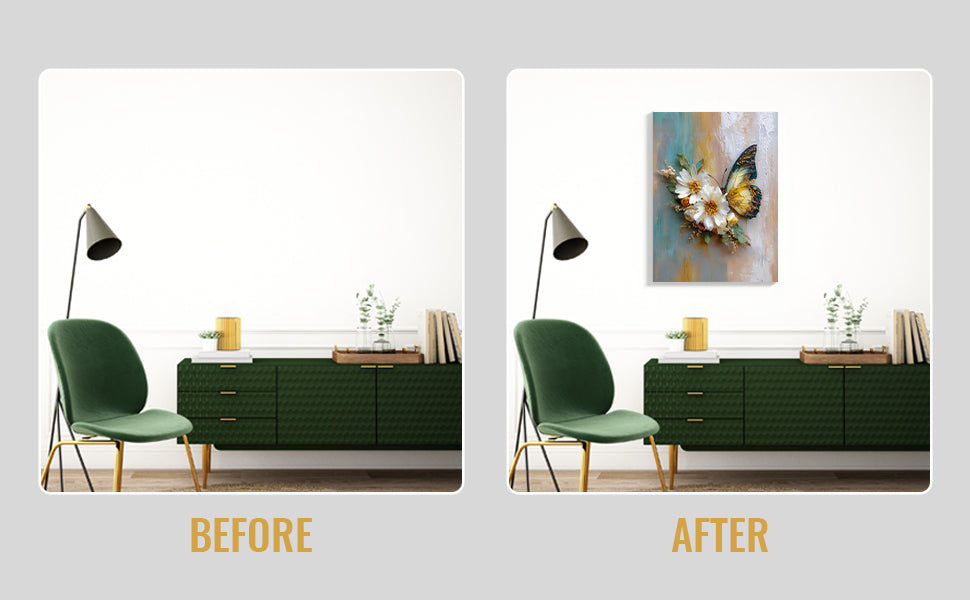 Transform your living space with this sophisticated canvas wall art featuring delicate white daisies and an elegant butterfly rendered in rich, textured oil painting style. The three-dimensional surface creates depth and visual interest, catching light beautifully from different angles. Perfect for above sofas, bedroom walls, or any room needing refined botanical elegance. This gallery-quality piece combines artistic craftsmanship with timeless floral design, making it an ideal choice for those seeking to elevate their home décor with understated sophistication and natural beauty.