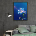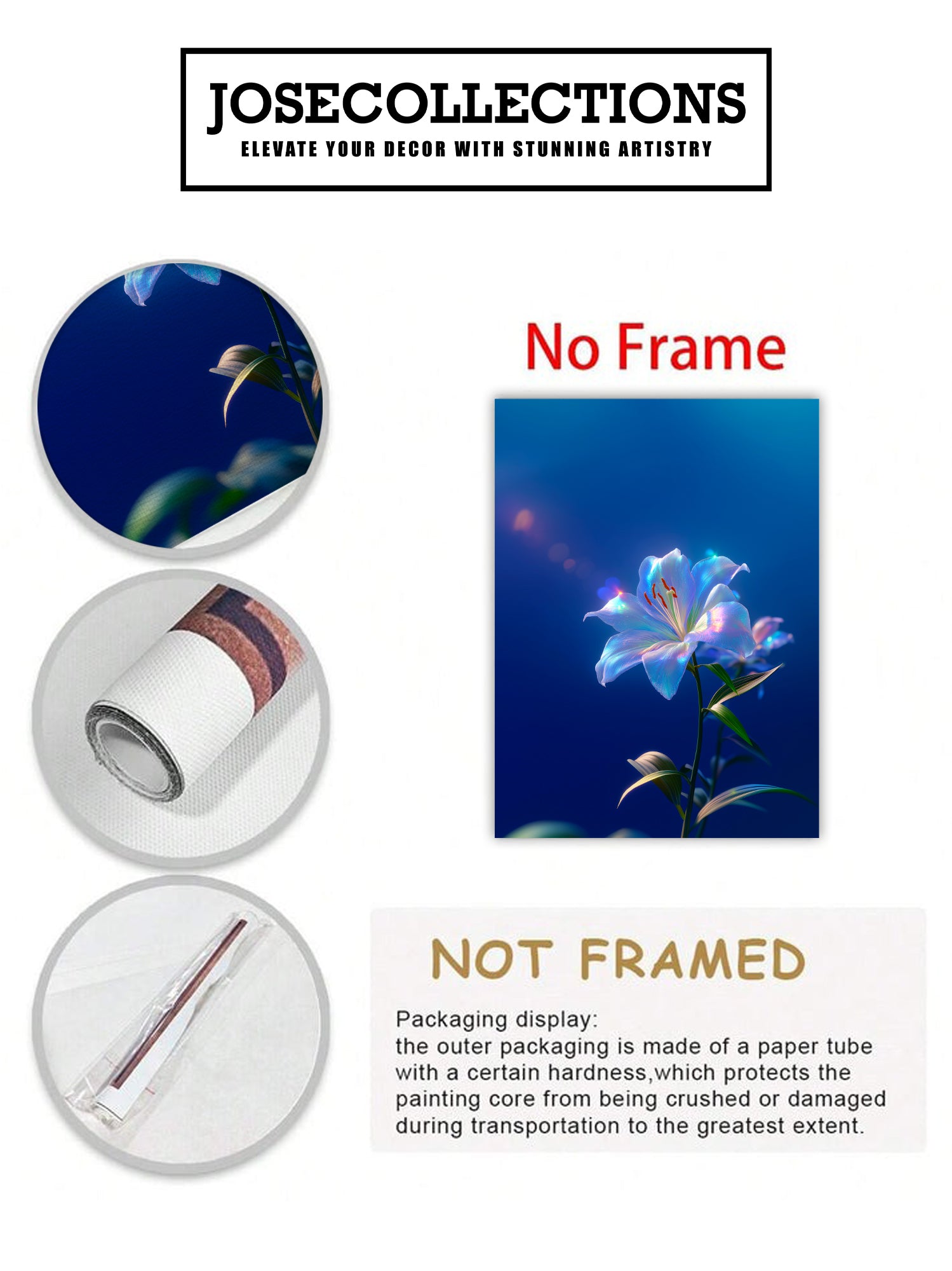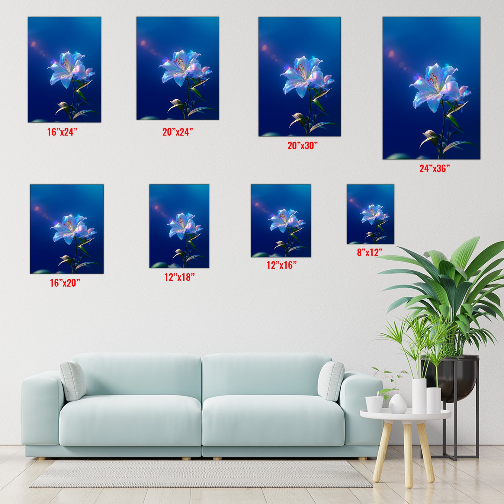 Ethereal Blue Lily Canvas Wall Art, Glowing Floral Photography Print on Deep Blue Background - For Living Room, Sofa Backdrop, Bedside Decoration, Home Decor