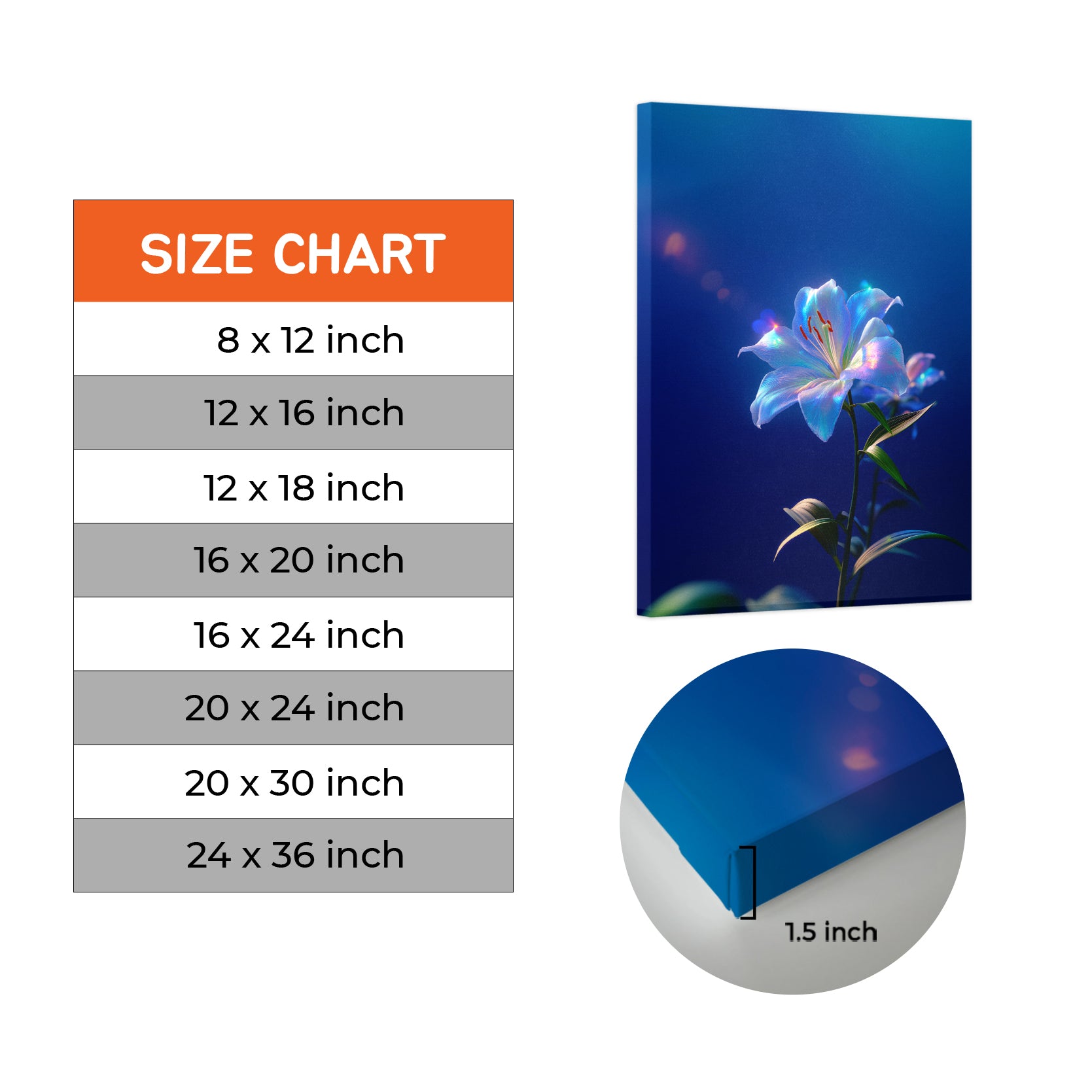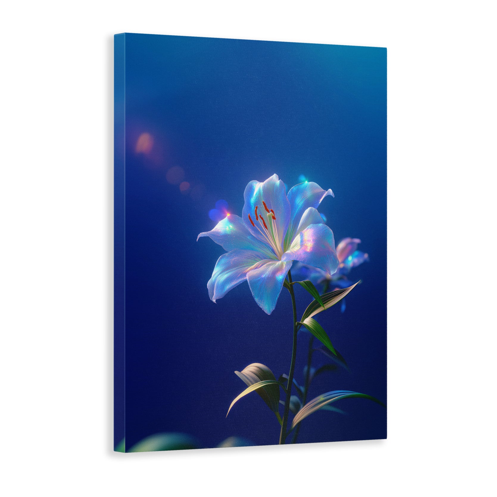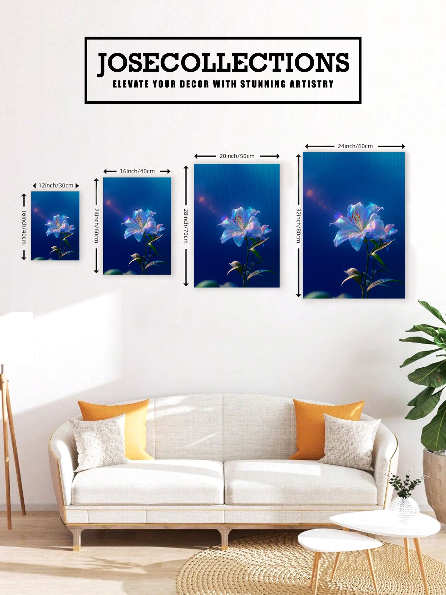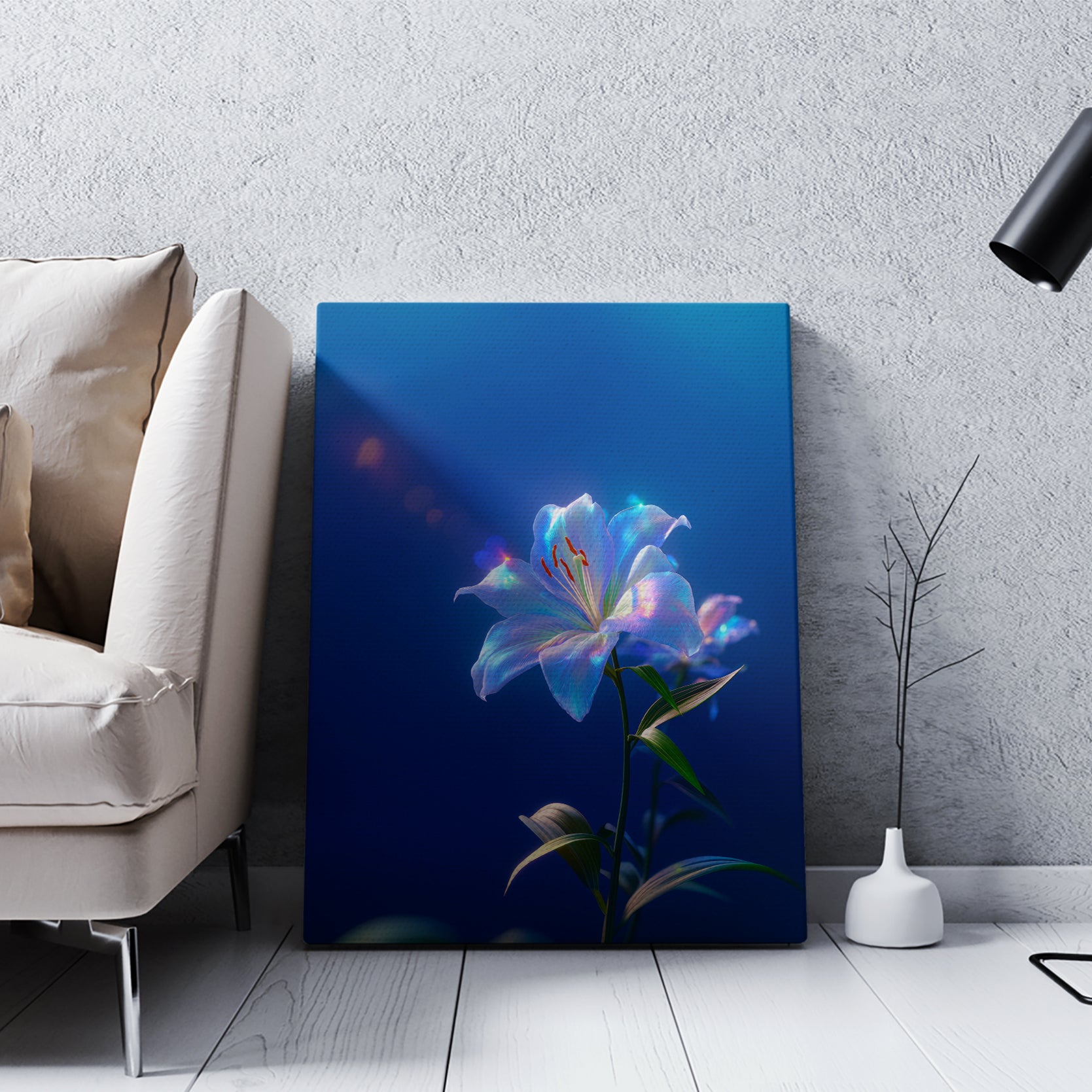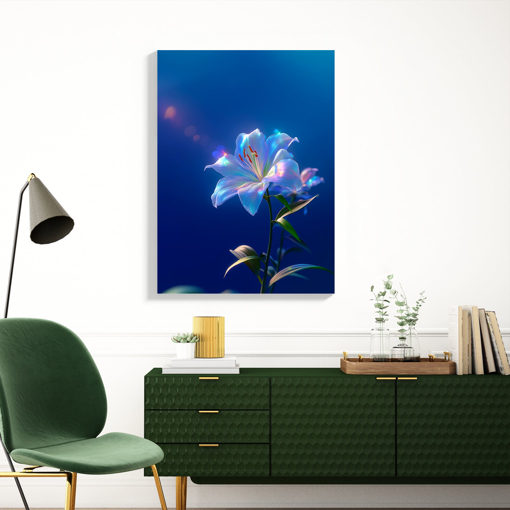 Capture the serene beauty of nature with this stunning canvas wall art featuring an ethereal blue lily rendered in glowing floral photography. The delicate bloom emerges against a rich, deep blue background, creating a sophisticated focal point that transforms any space. Perfect for living rooms, bedroom walls, or above sofas, this piece brings tranquility and elegance to your home decor. The luminous quality of the imagery adds depth and visual interest, while the calming color palette complements modern and traditional interiors alike. An ideal choice for those seeking to infuse their space with botanical artistry and peaceful ambiance.