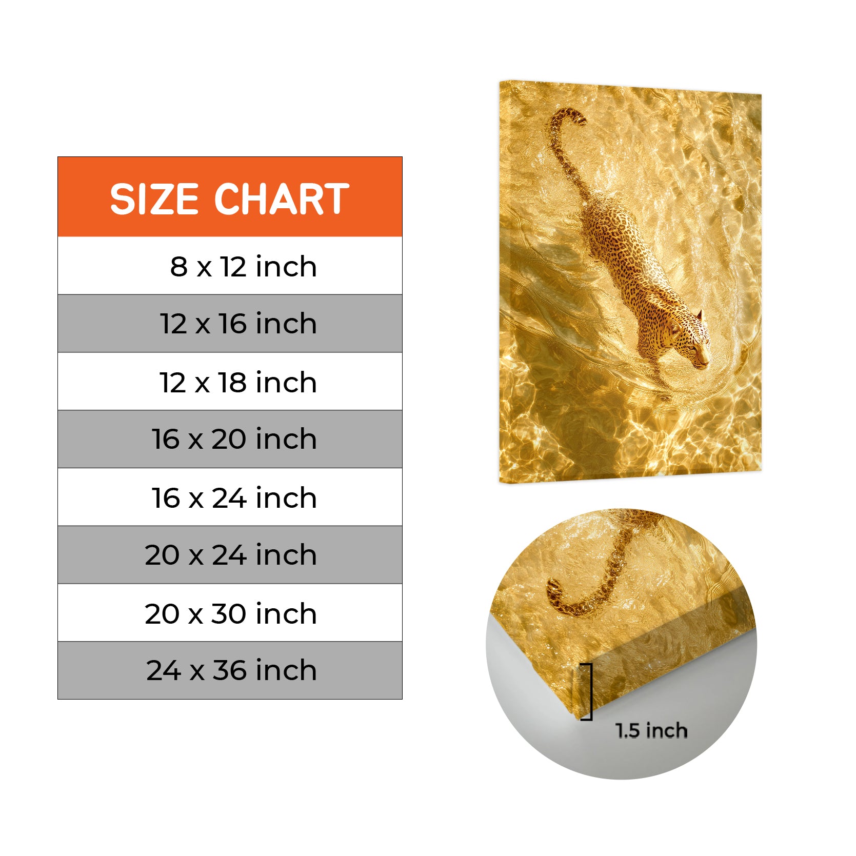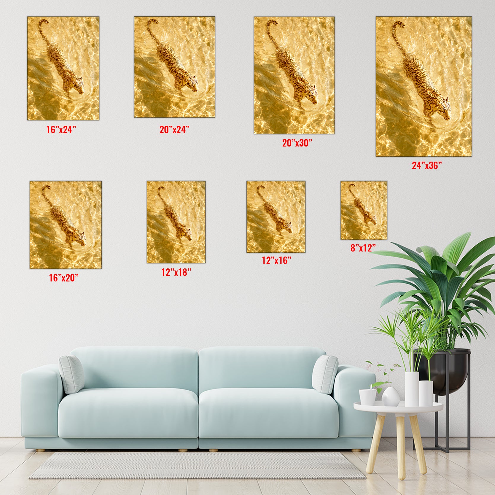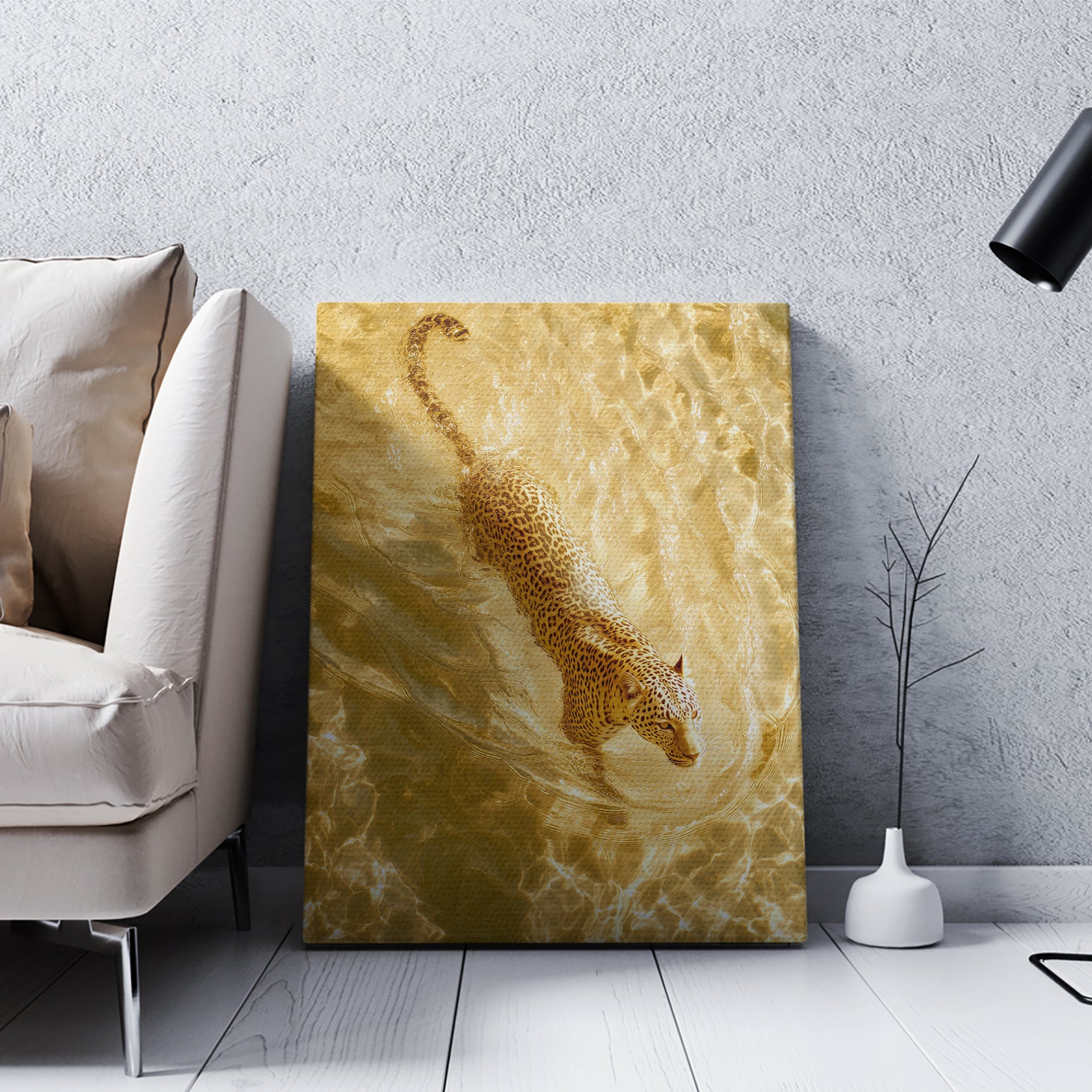 Capture the majesty of wildlife with this stunning golden leopard canvas art, featuring a captivating shimmering water scene. The expertly rendered composition showcases rich, luminous tones that bring movement and depth to any space. Perfect for creating a sophisticated focal point above your sofa, in the bedroom, or throughout your home, this piece combines artistic elegance with natural beauty. The dynamic interplay of light and water creates visual interest while the leopard's commanding presence adds drama and refinement. An ideal choice for collectors and design enthusiasts seeking museum-quality wall art that elevates interior spaces with both style and storytelling.