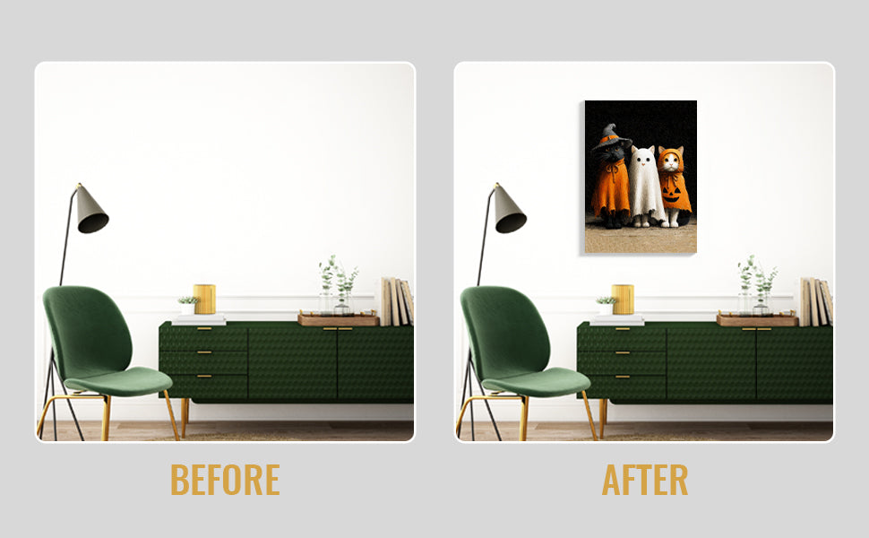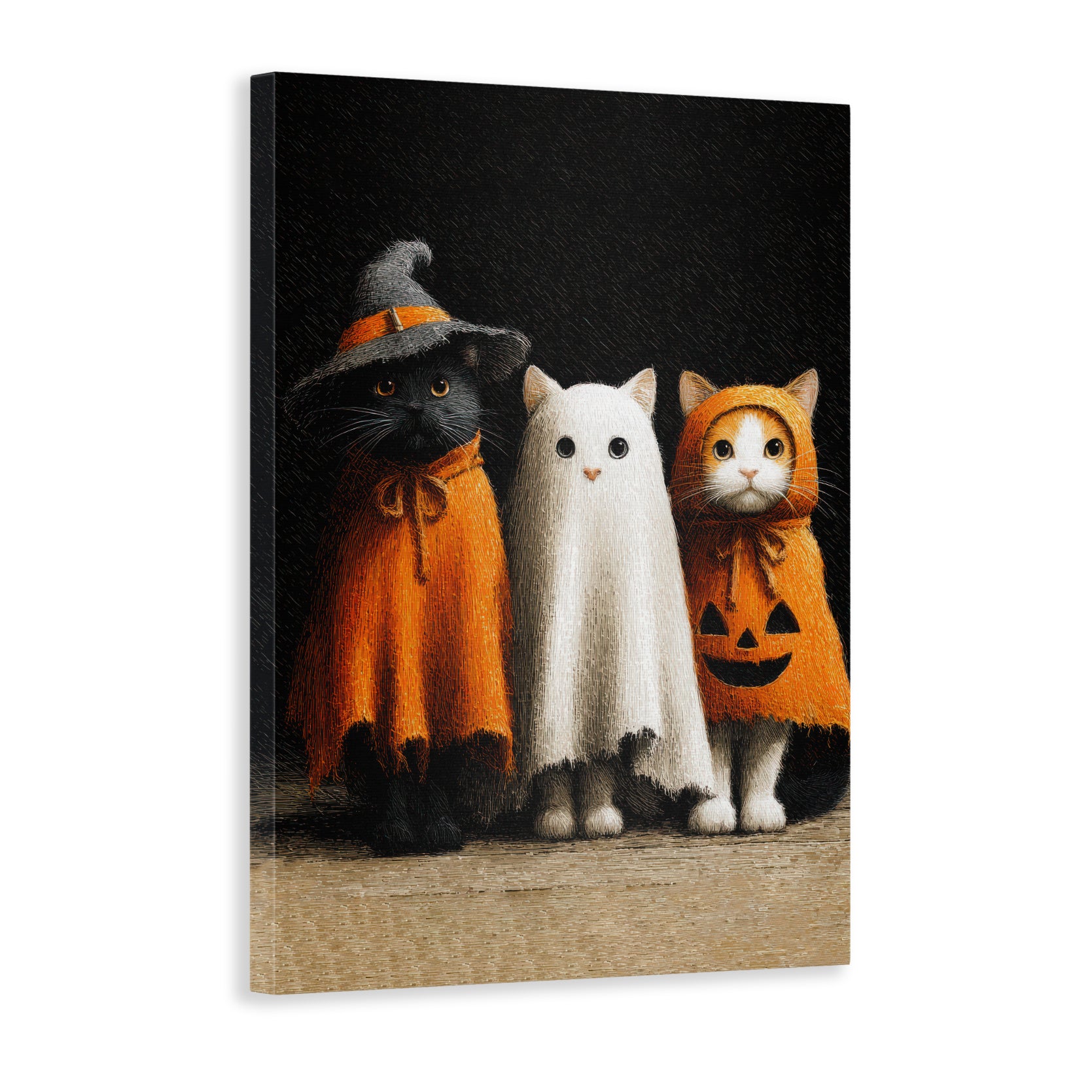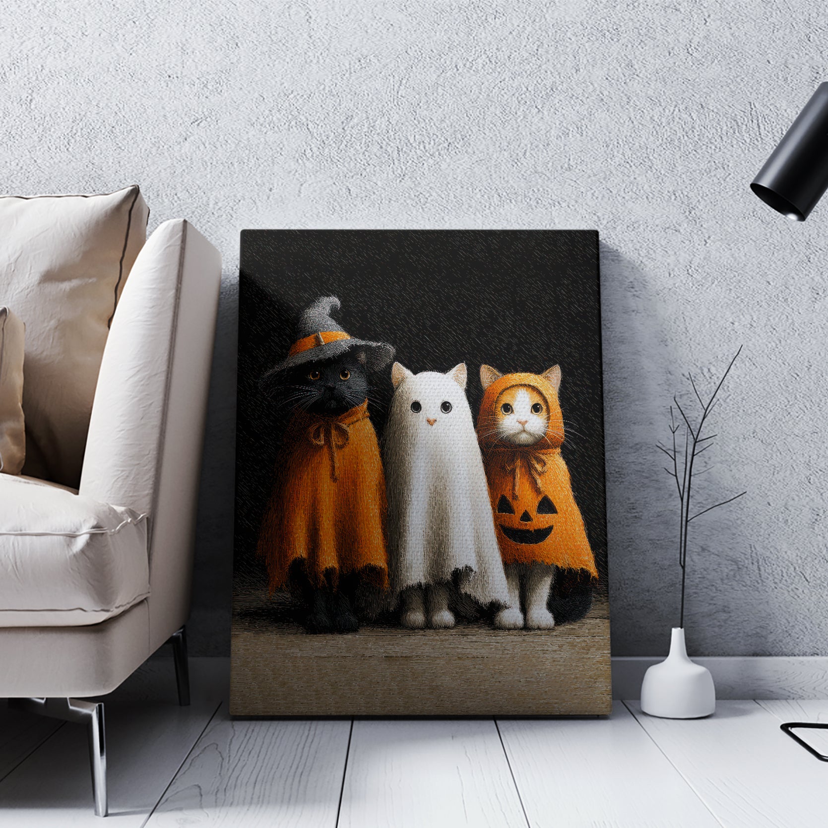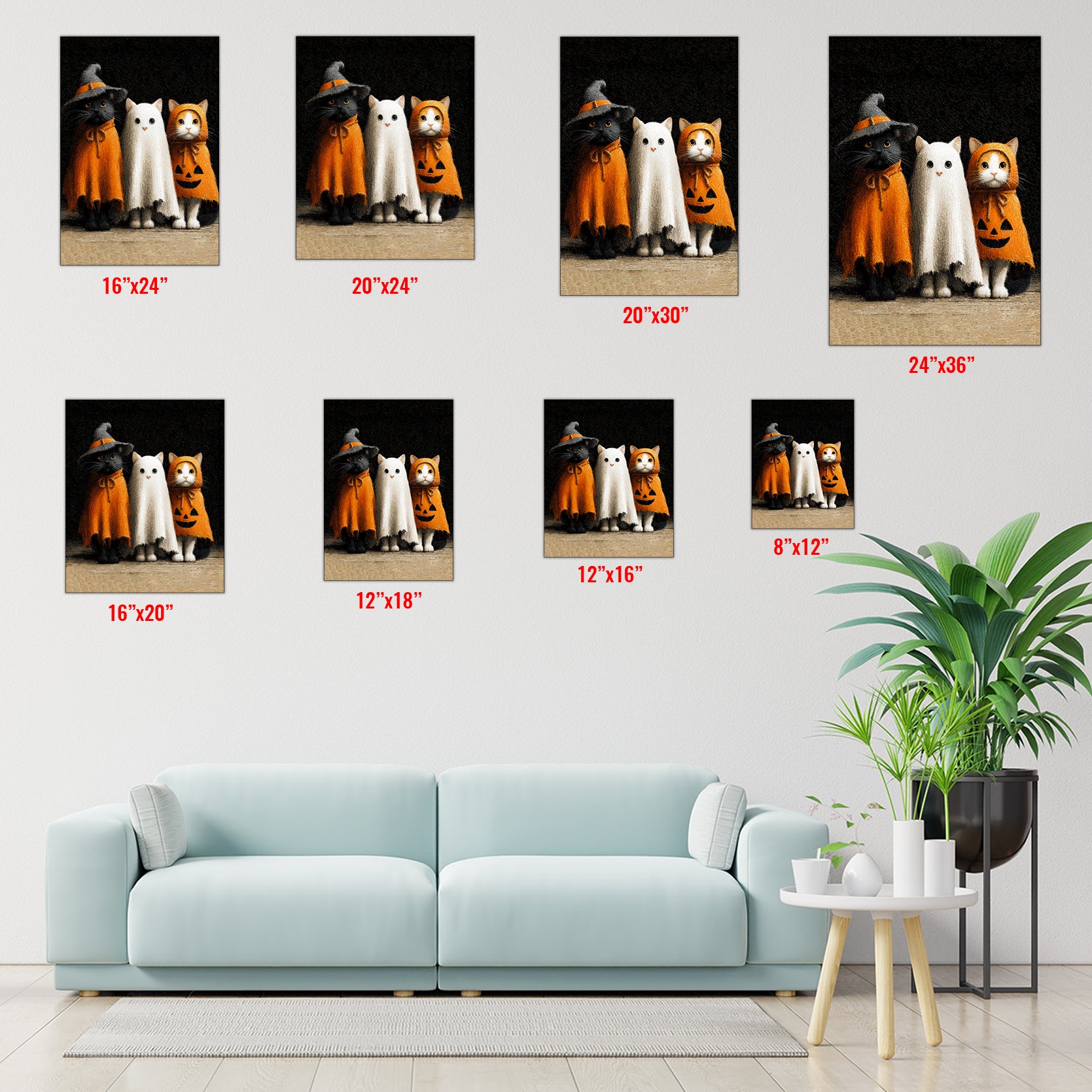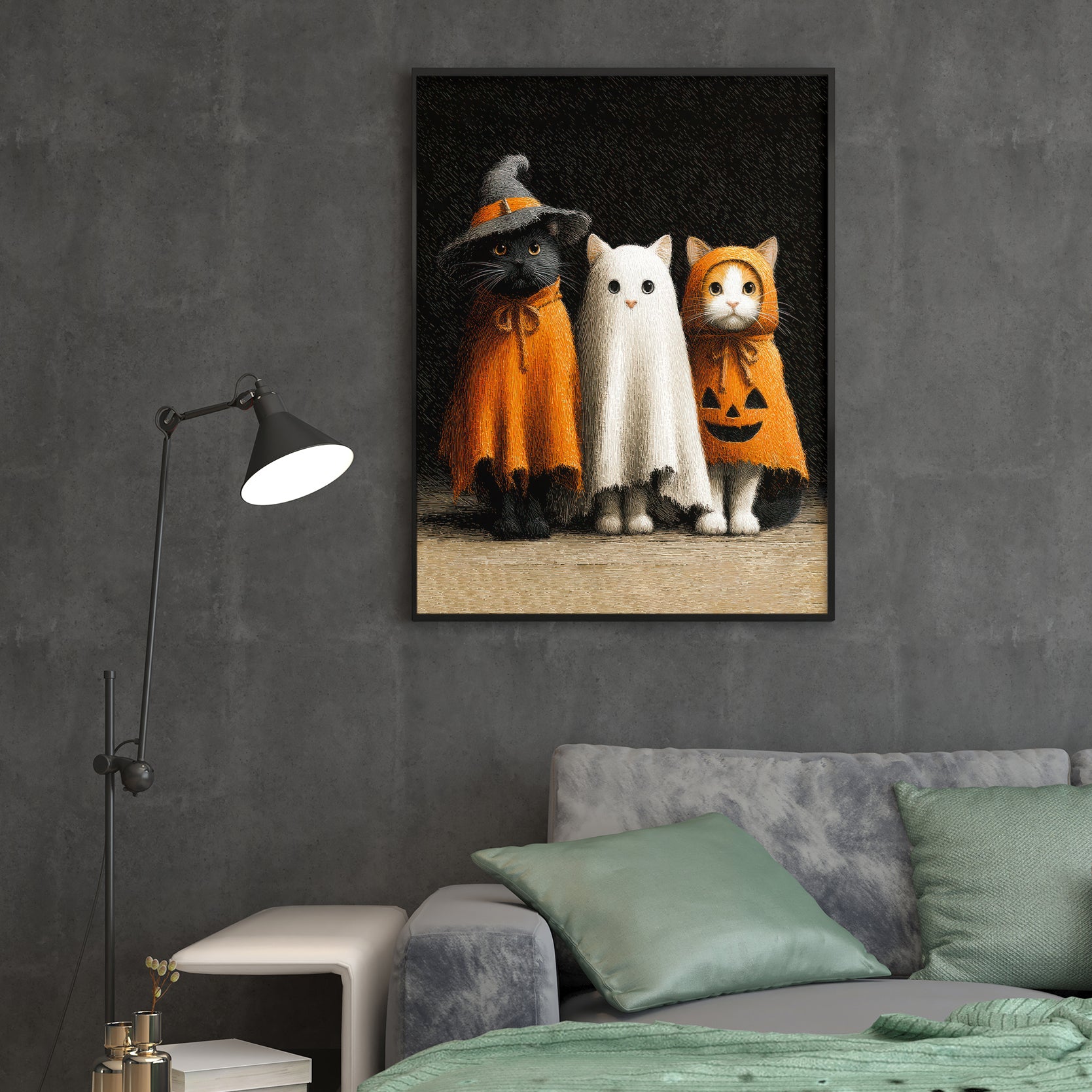 Add a touch of eerie charm to your living space with this Halloween Cats Canvas Wall Art. Featuring cats in spooky costumes, this print creates a festive atmosphere perfect for your living room, sofa backdrop, or bedside decoration. Crafted to enhance your home decor, it blends seasonal spirit with artistic flair, making it an ideal choice for those who appreciate unique and thematic wall art.