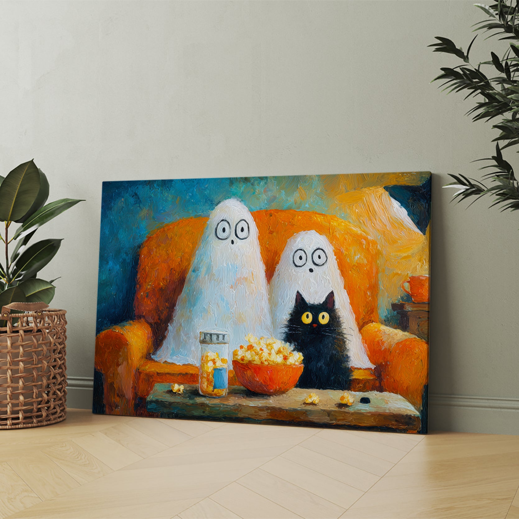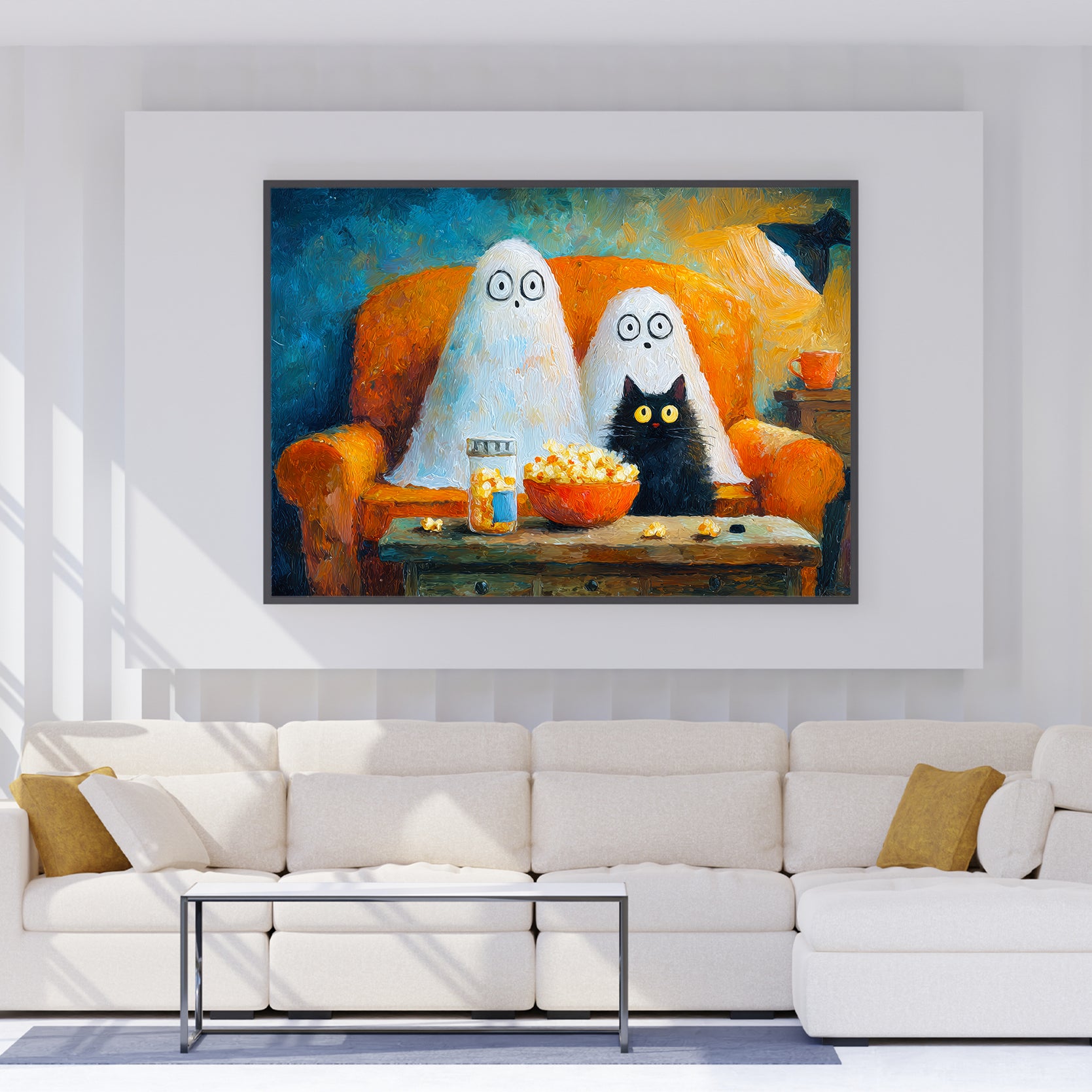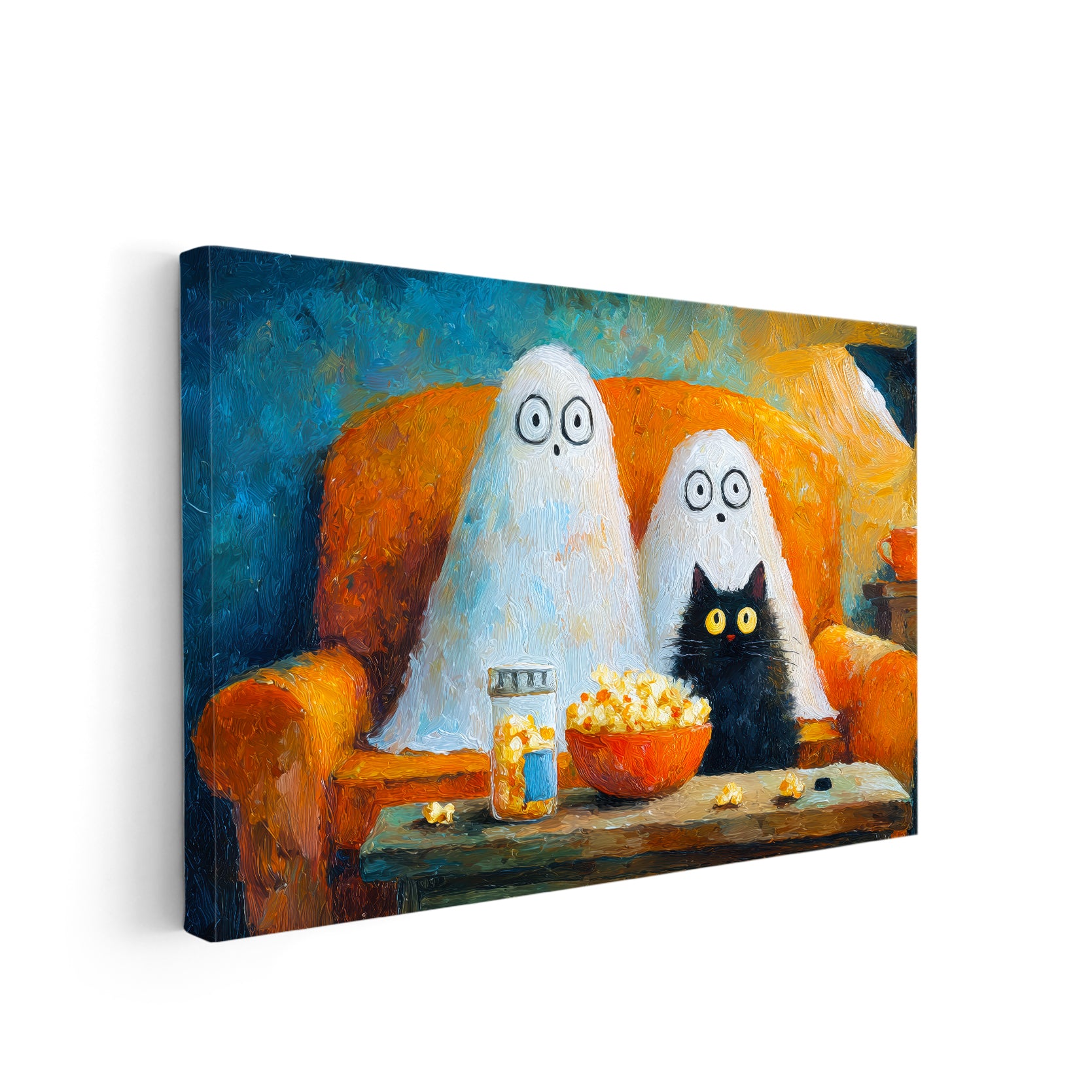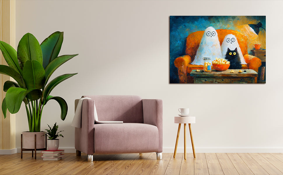 Add a touch of festive charm to your living space with this Halloween Ghost and Black Cat Canvas Wall Art. Featuring a whimsical movie night scene, it creates a cozy and playful atmosphere perfect for your living room, sofa backdrop, or bedside decoration. Crafted to enhance your home decor, this canvas combines seasonal spirit with artistic flair, making it an expert choice for those seeking unique and stylish Halloween accents.