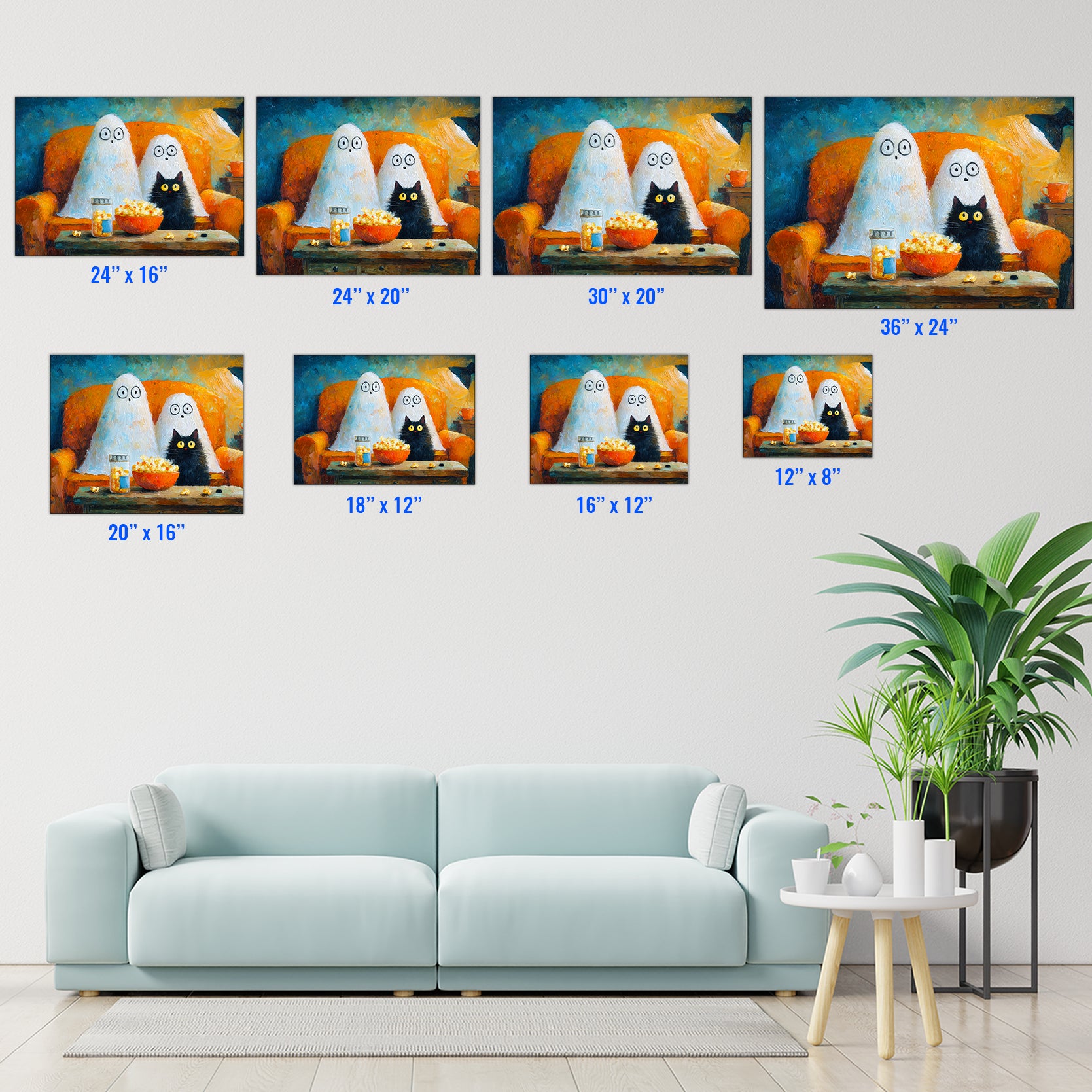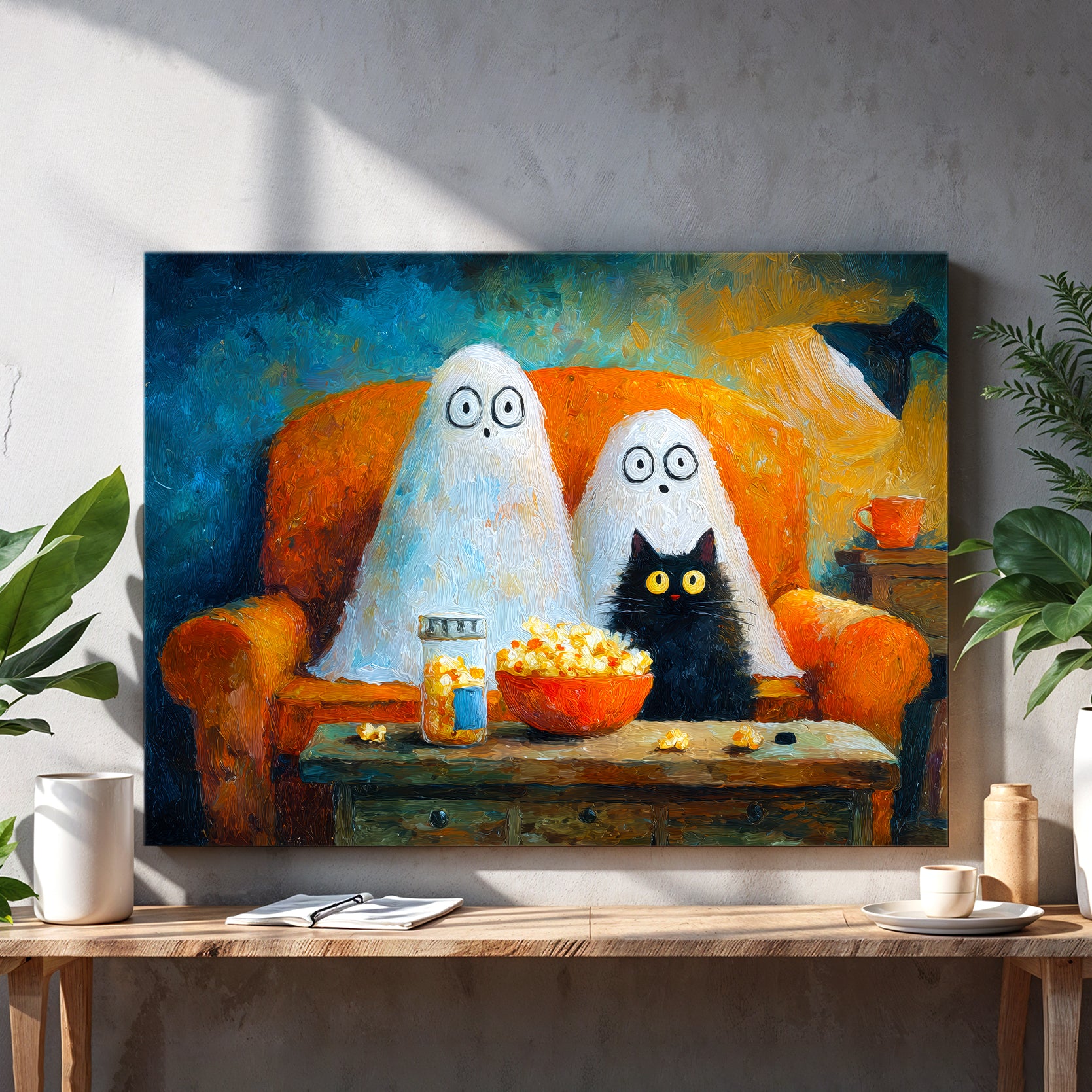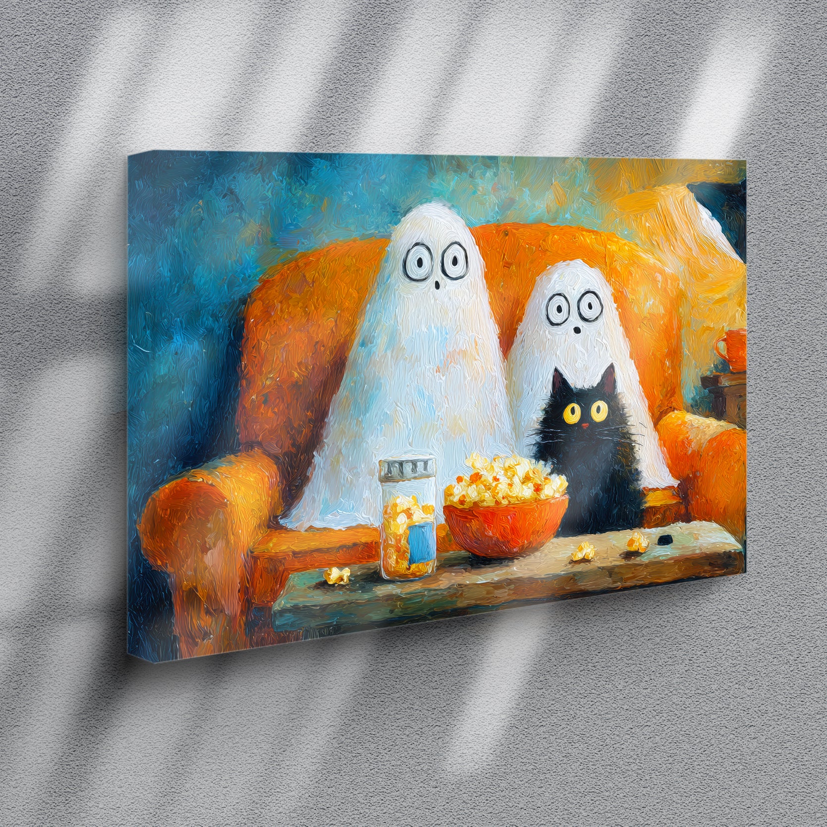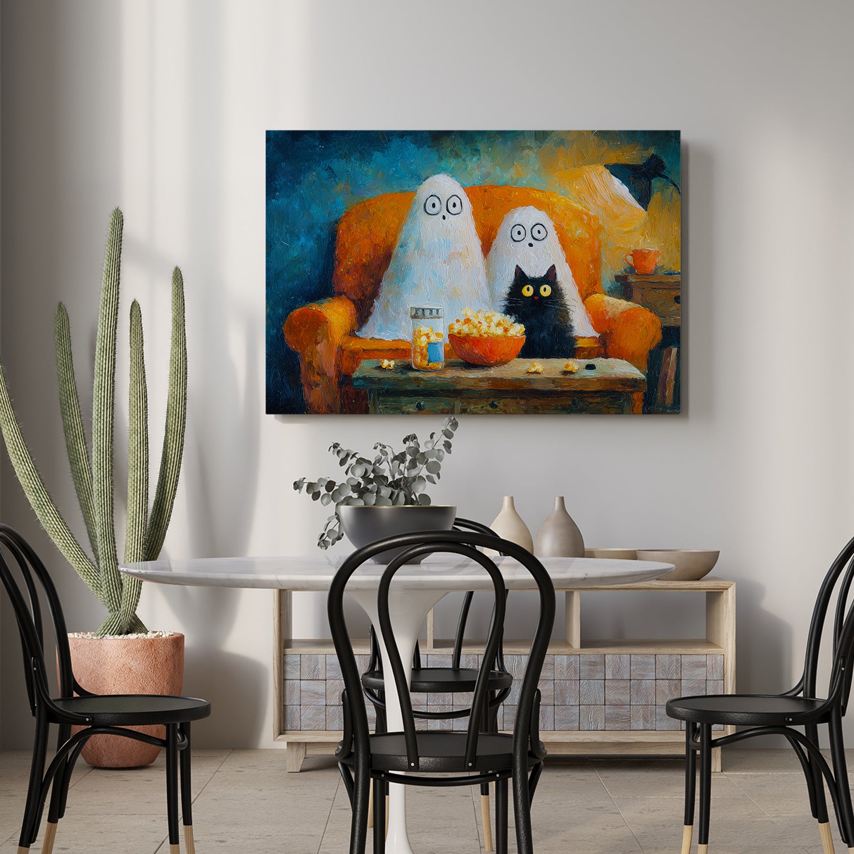 Add a touch of festive charm to your living space with this Halloween Ghost and Black Cat Canvas Wall Art. Featuring a whimsical movie night scene, it creates a cozy and playful atmosphere perfect for your living room, sofa backdrop, or bedside decoration. Crafted to enhance your home decor, this canvas combines seasonal spirit with artistic flair, making it an expert choice for those seeking unique and stylish Halloween accents.
