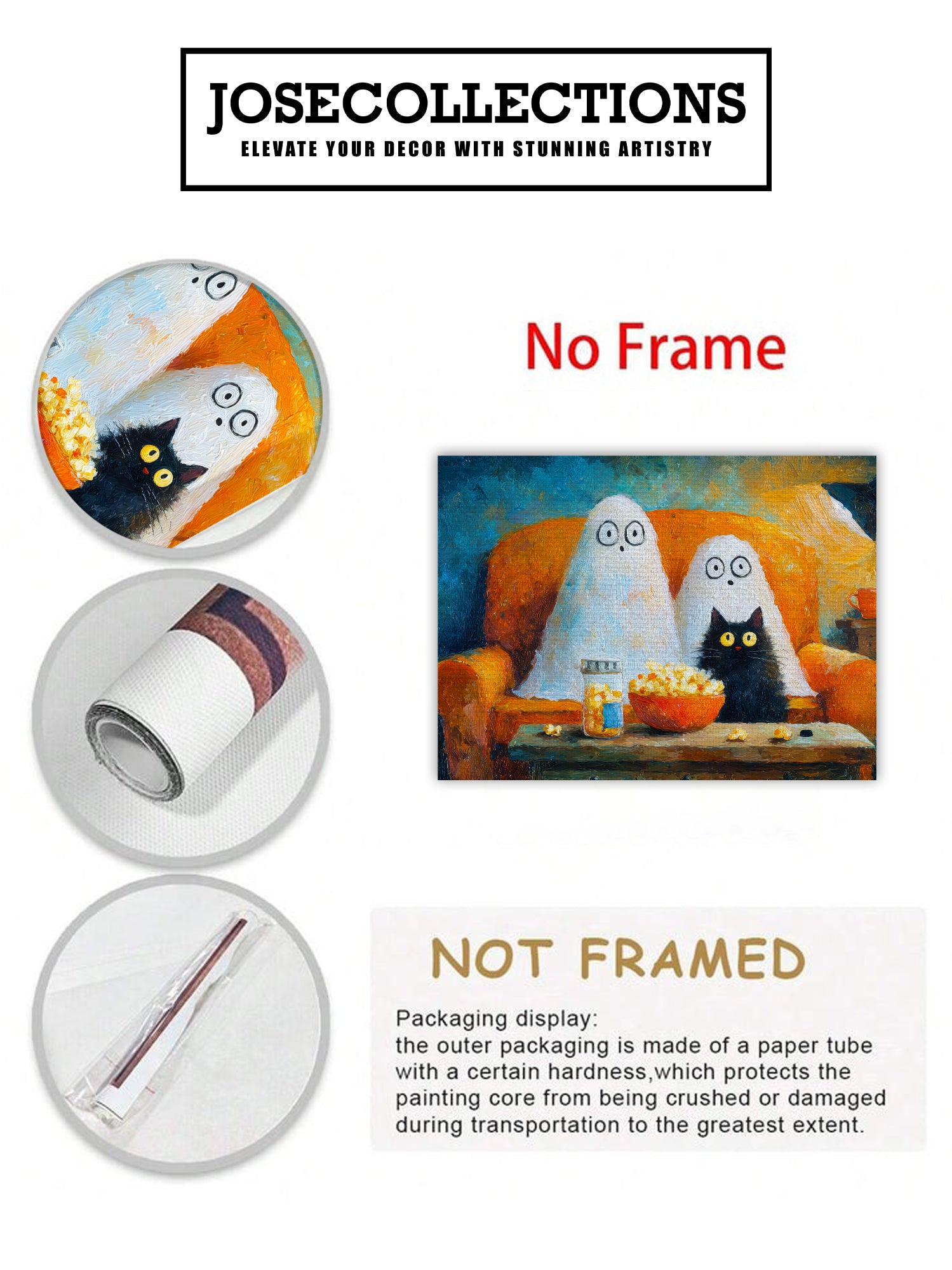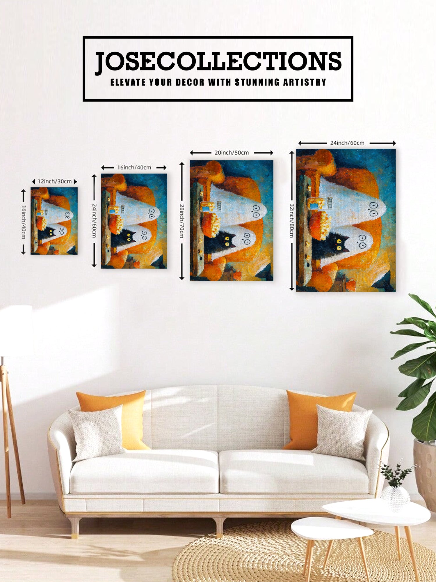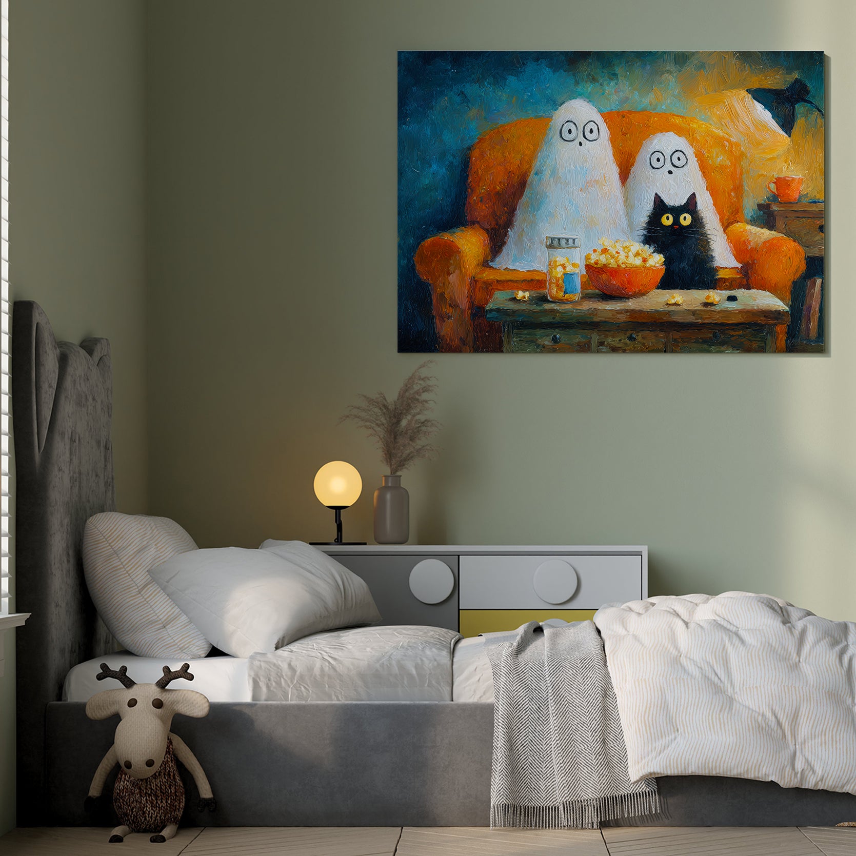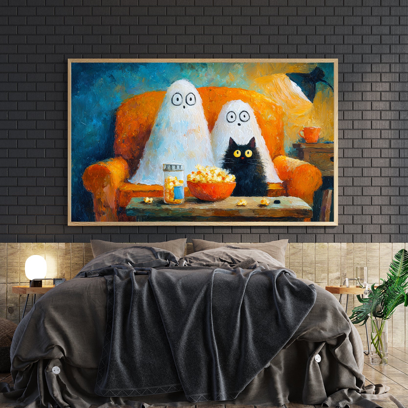 Add a touch of festive charm to your living space with this Halloween Ghost and Black Cat Canvas Wall Art. Featuring a whimsical movie night scene, it creates a cozy and playful atmosphere perfect for your living room, sofa backdrop, or bedside decoration. Crafted to enhance your home decor, this canvas combines seasonal spirit with artistic flair, making it an expert choice for those seeking unique and stylish Halloween accents.