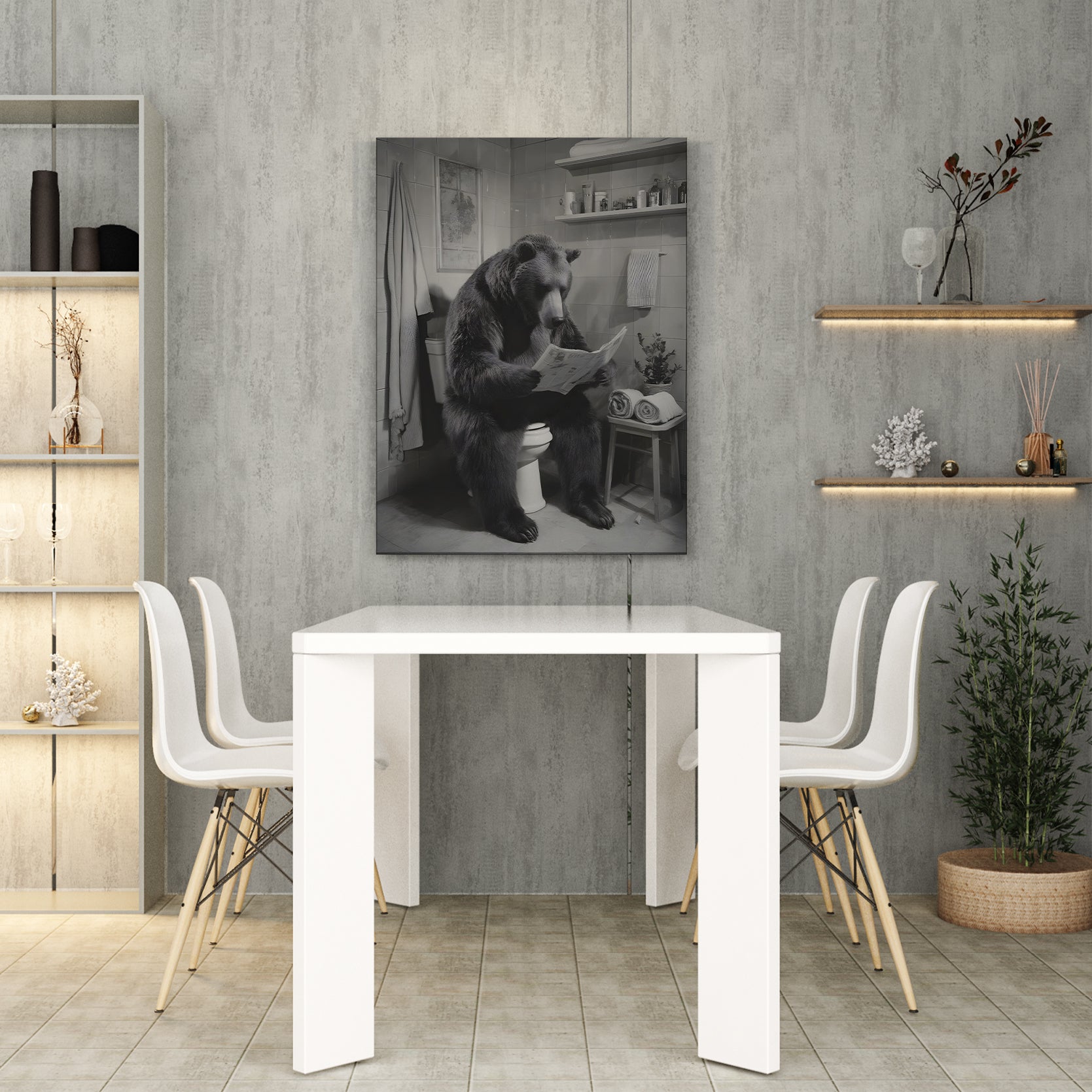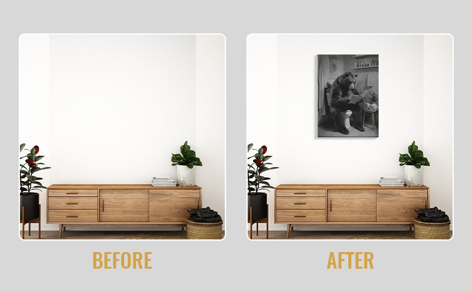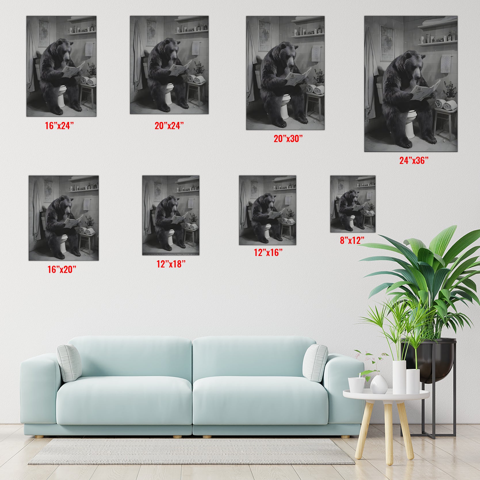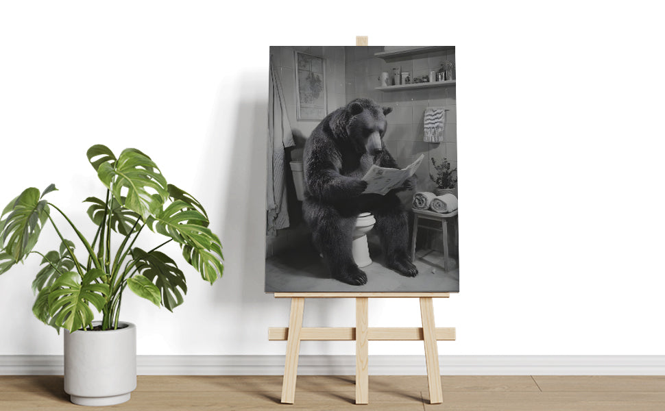 Bring unexpected humor into your home with this striking black and white photography print featuring a curious black bear in a bathroom setting. This canvas wall art captures a delightfully absurd moment that sparks conversation and laughter among guests. Perfect for living rooms, bedside walls, or above sofas, it combines artistic quality with witty charm. The monochromatic palette ensures versatility with any décor style while the bold subject matter adds personality and character to your space. An ideal choice for those seeking distinctive home décor that breaks from conventional wildlife art.