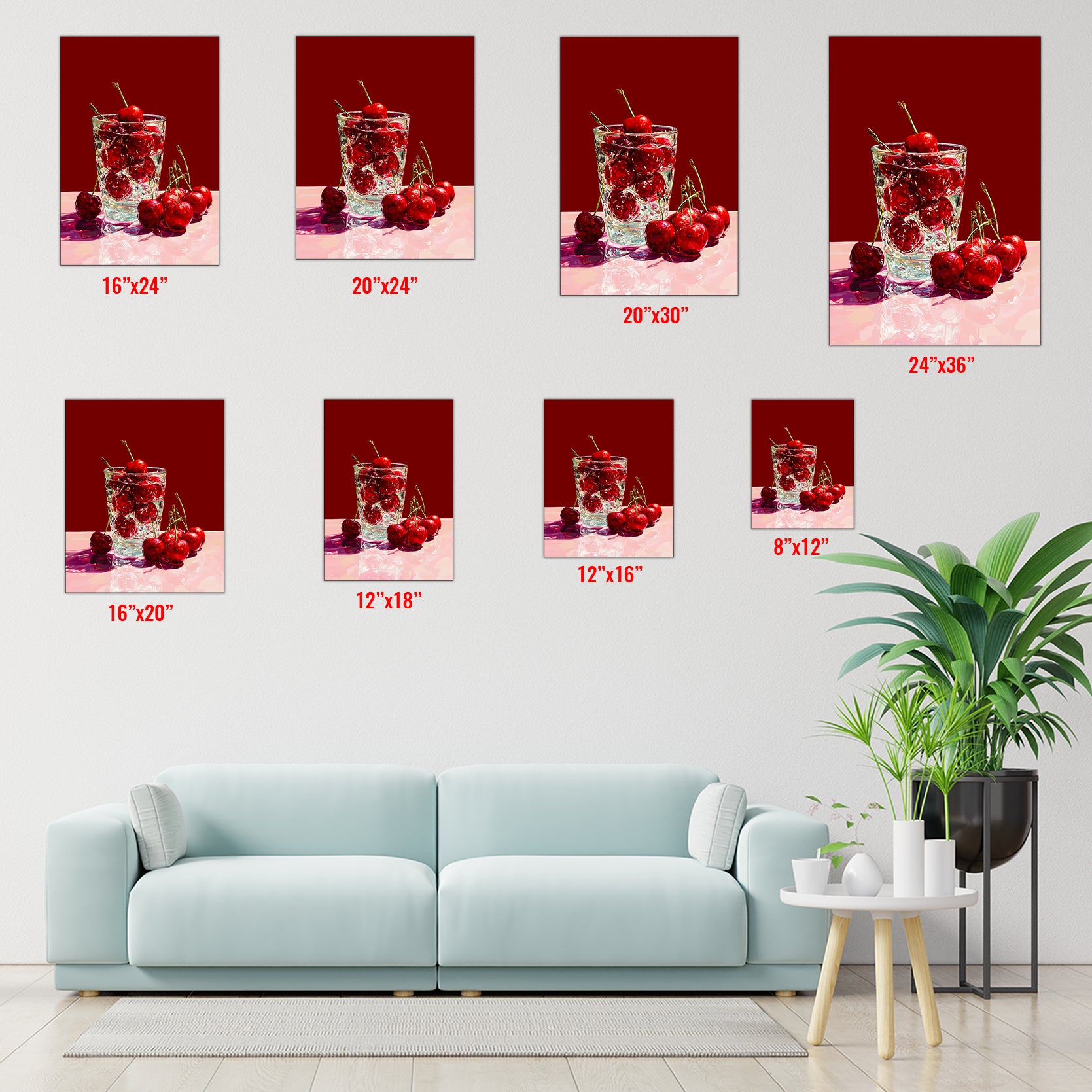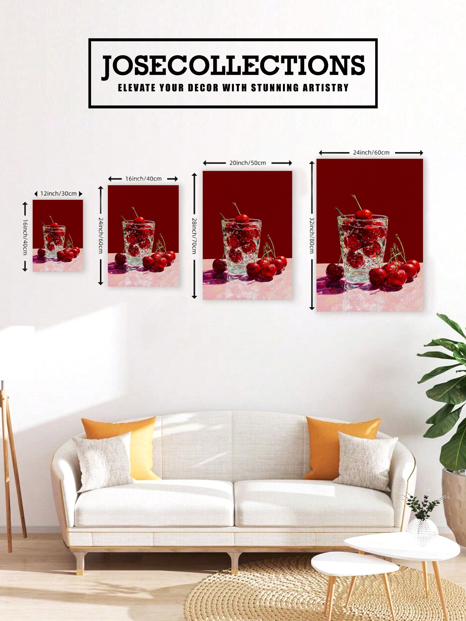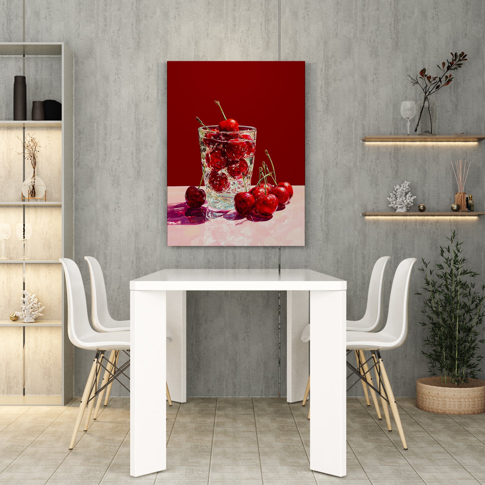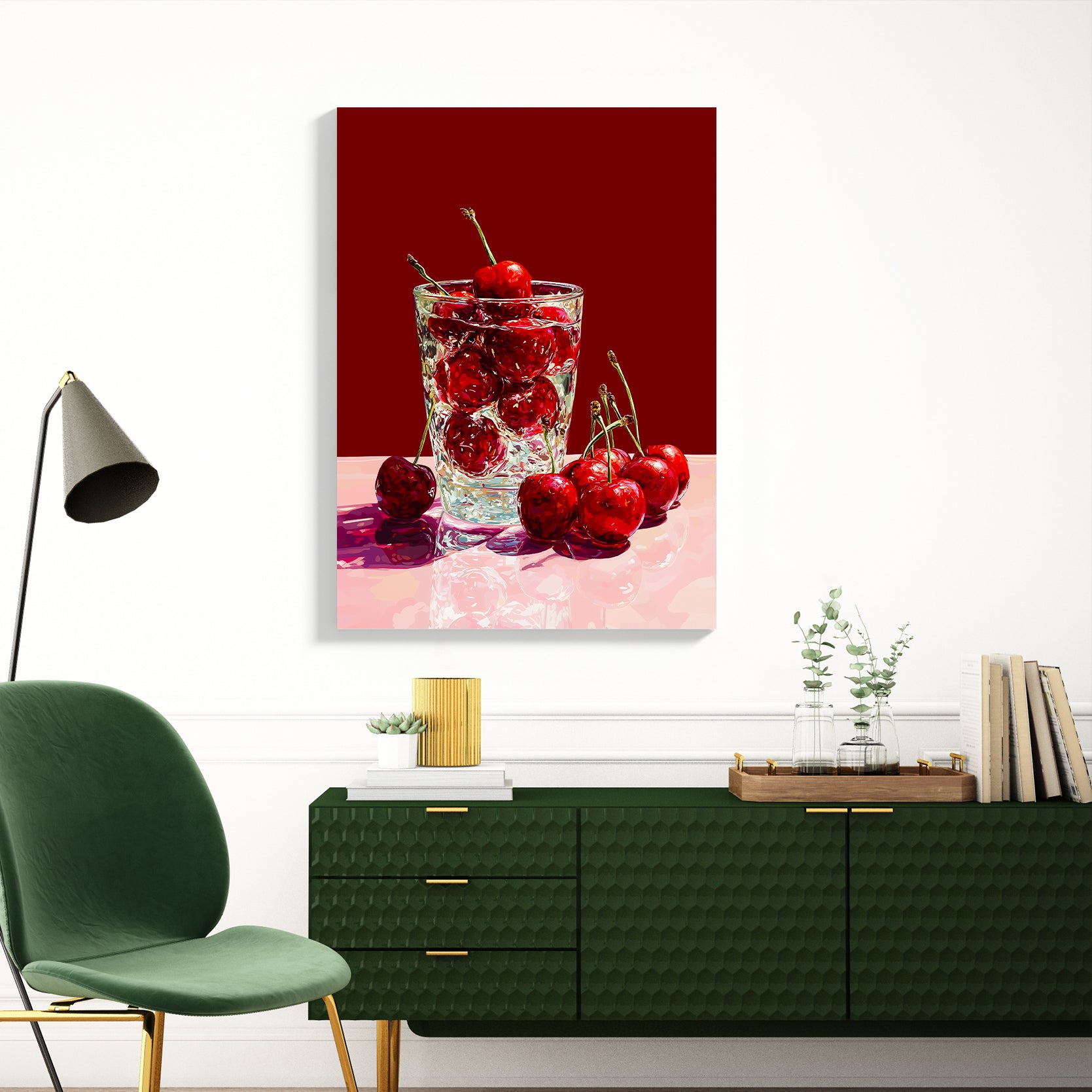 Transform your space with this striking kitchen still life canvas wall art, featuring vibrant red cherries rendered in rich detail. The glass print technique creates exceptional depth and luminosity, making the fruit appear to leap from the wall. Perfect for anchoring a living room, adding visual interest above a sofa, or creating a sophisticated focal point in bedrooms and dining areas. The warm, inviting palette complements both contemporary and traditional interiors while bringing culinary charm to any room. An ideal choice for those seeking gallery-quality artwork that combines artistic merit with functional home décor appeal.