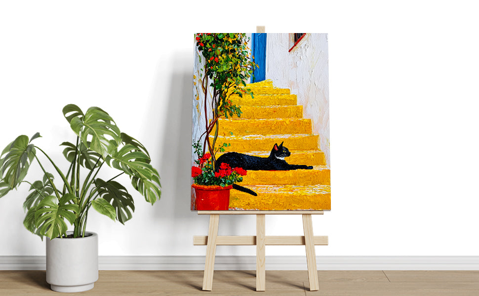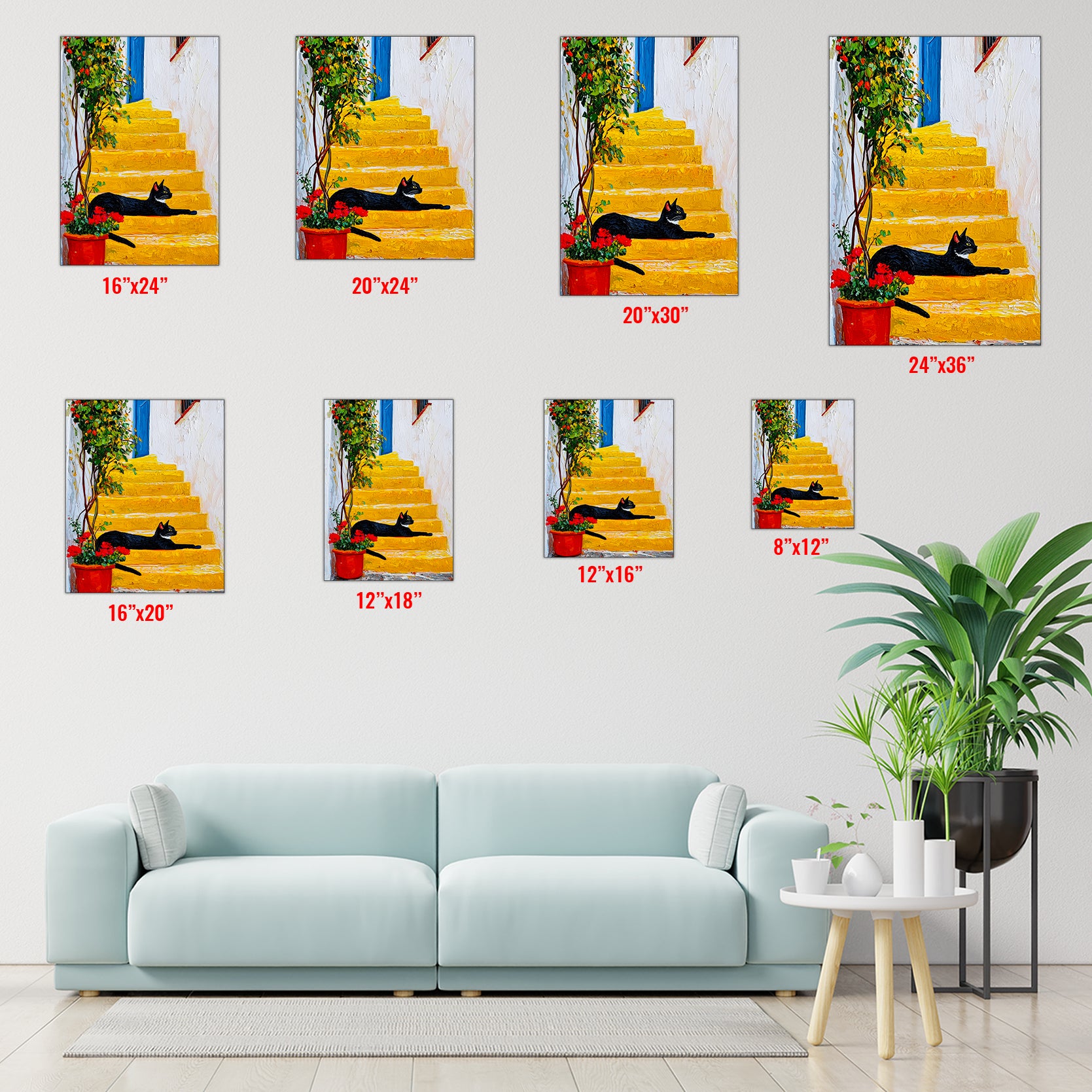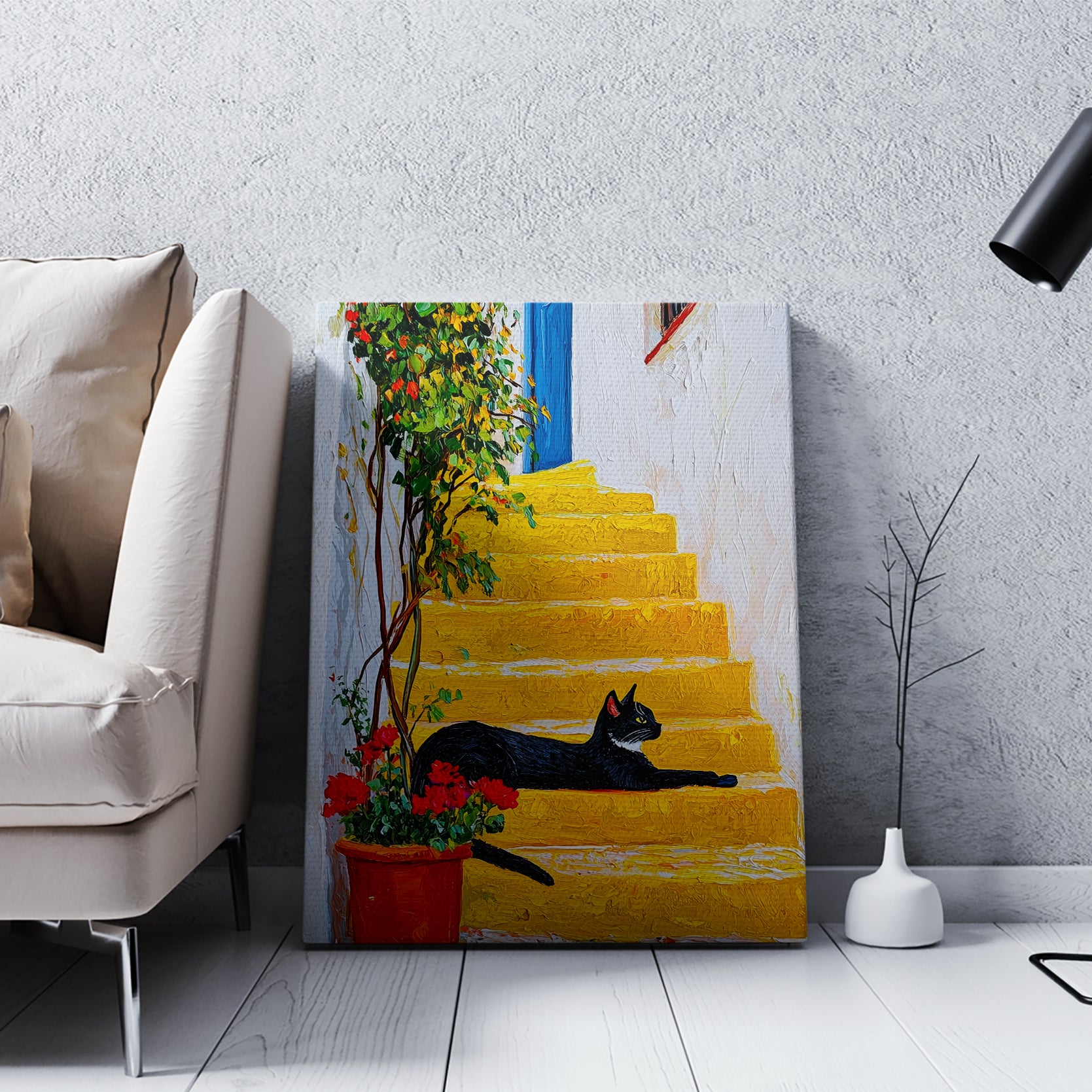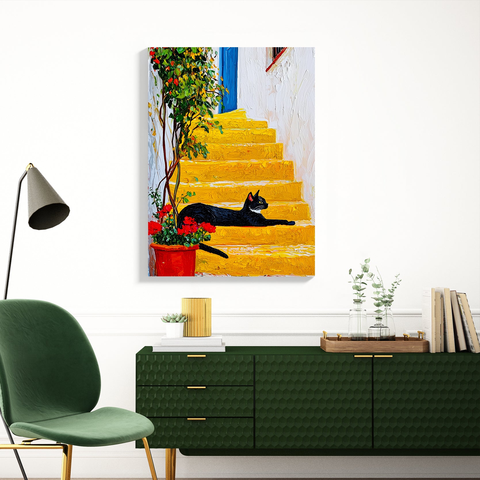 Transport your space to the sun-drenched shores of the Mediterranean with this captivating canvas art. Featuring a charming black cat perched on vibrant yellow stairs adorned with blooming red flowers, this piece captures the essence of coastal European charm. The warm color palette and whimsical composition create an inviting focal point perfect for living rooms, bedrooms, or above sofas. High-quality canvas construction ensures lasting vibrancy and durability. An ideal choice for those seeking to infuse their home with warmth, character, and artistic sophistication.