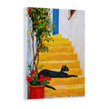 Mediterranean Yellow Stairs with Black Cat and Red Flowers Canvas Wall Art - For Living Room, Sofa Backdrop, Bedside Decoration, Home Decor