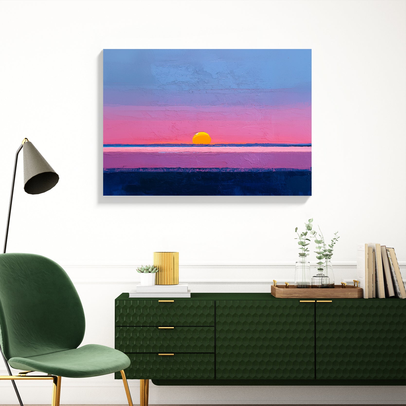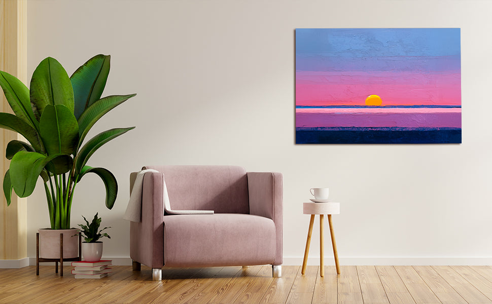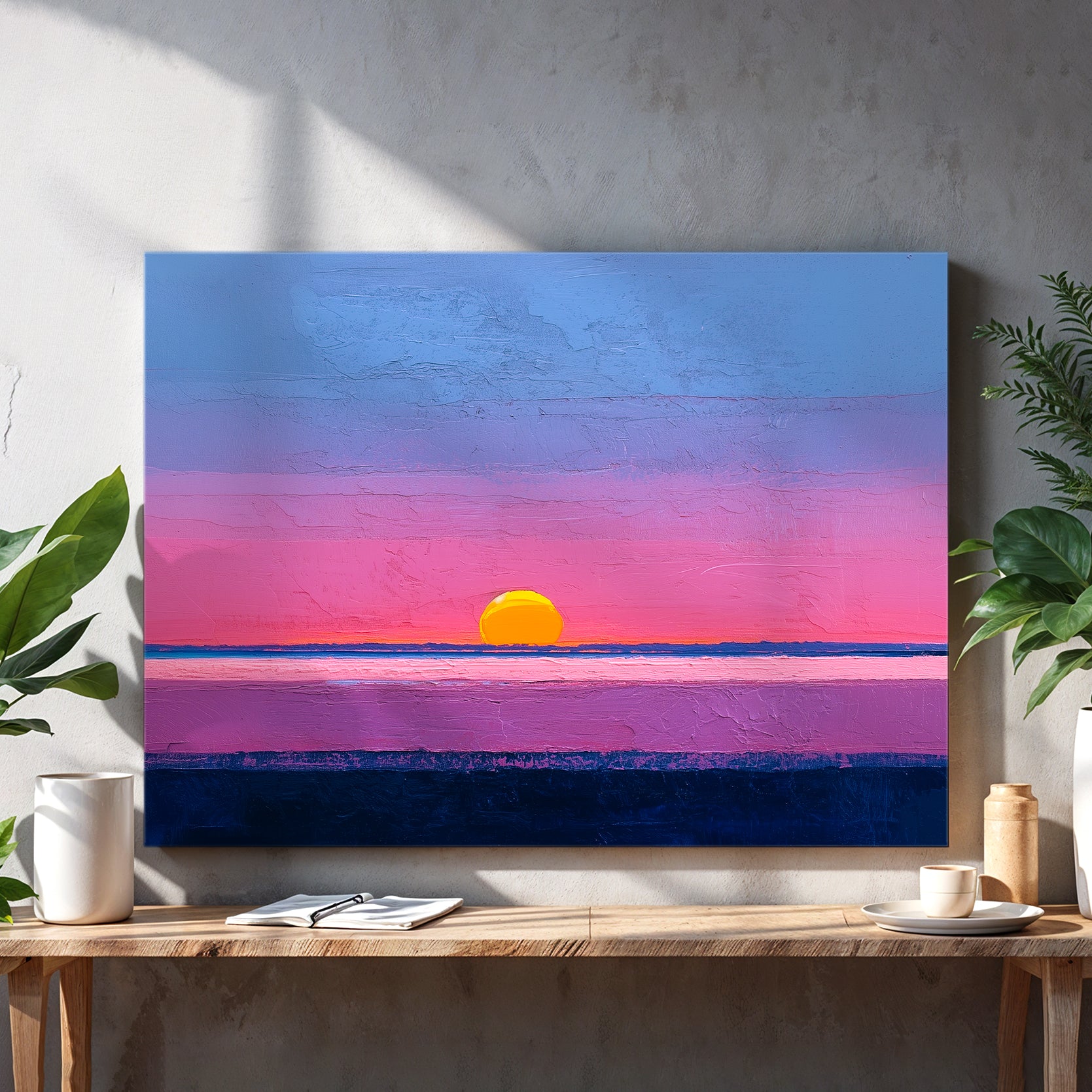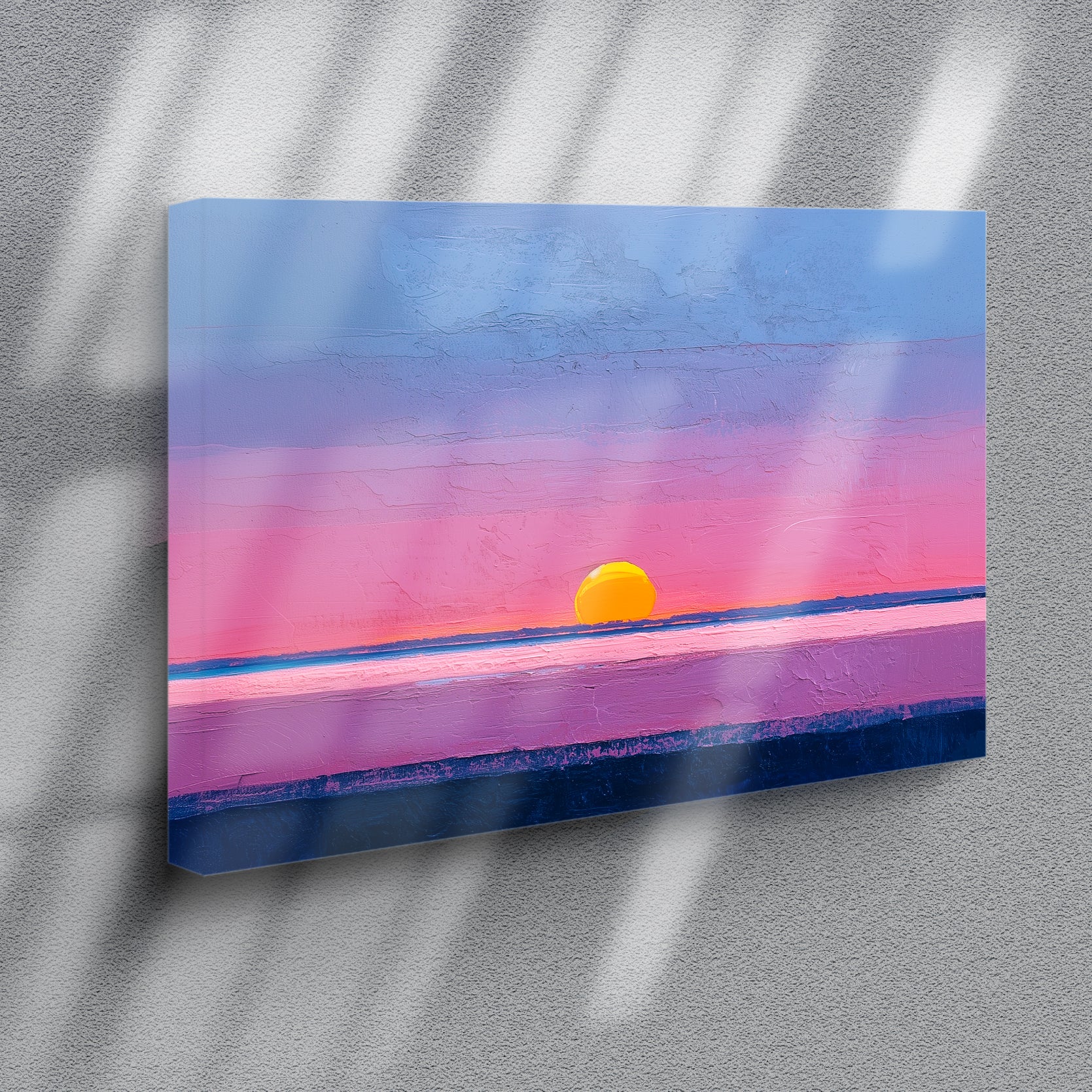 Transform your space with this striking modern abstract canvas that captures the serene beauty of a coastal sunset. Rendered in captivating shades of purple, pink, and blue, the composition evokes the tranquil meeting of ocean and sky. The contemporary design works beautifully as a focal point above sofas, beds, or accent walls, infusing any room with sophisticated color and artistic depth. Perfect for those seeking to elevate their home décor with a piece that balances vibrant hues with minimalist aesthetics.