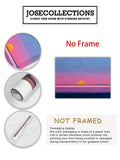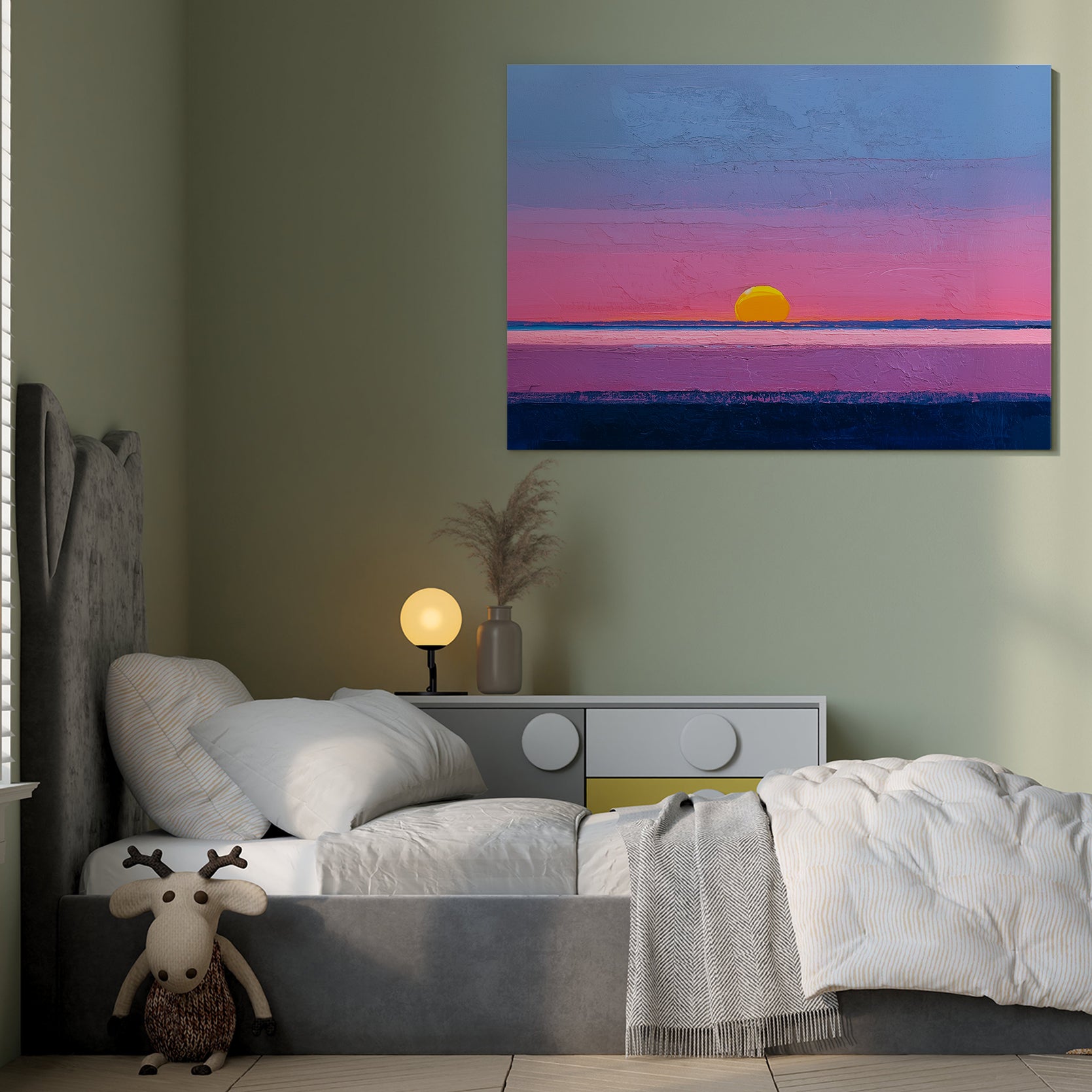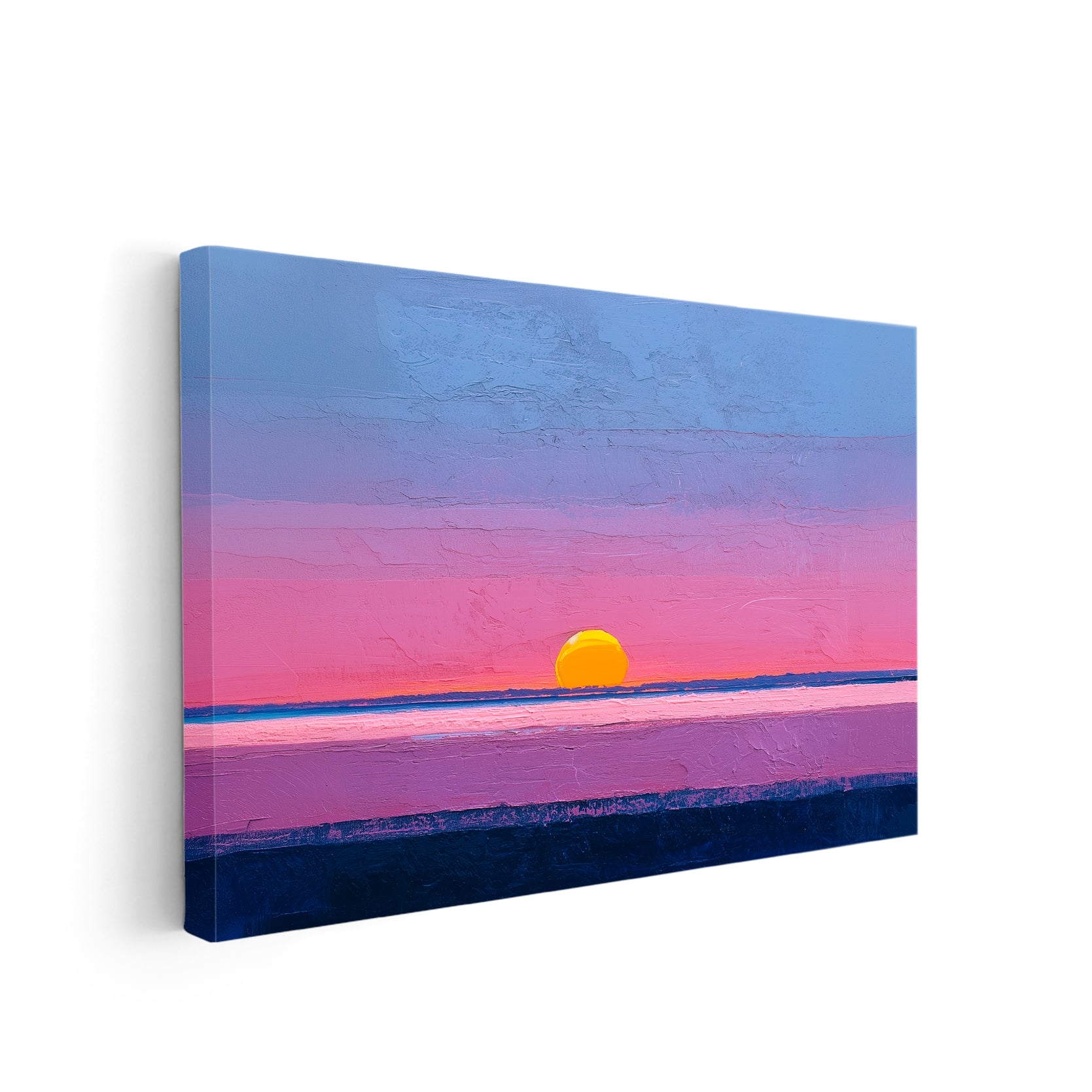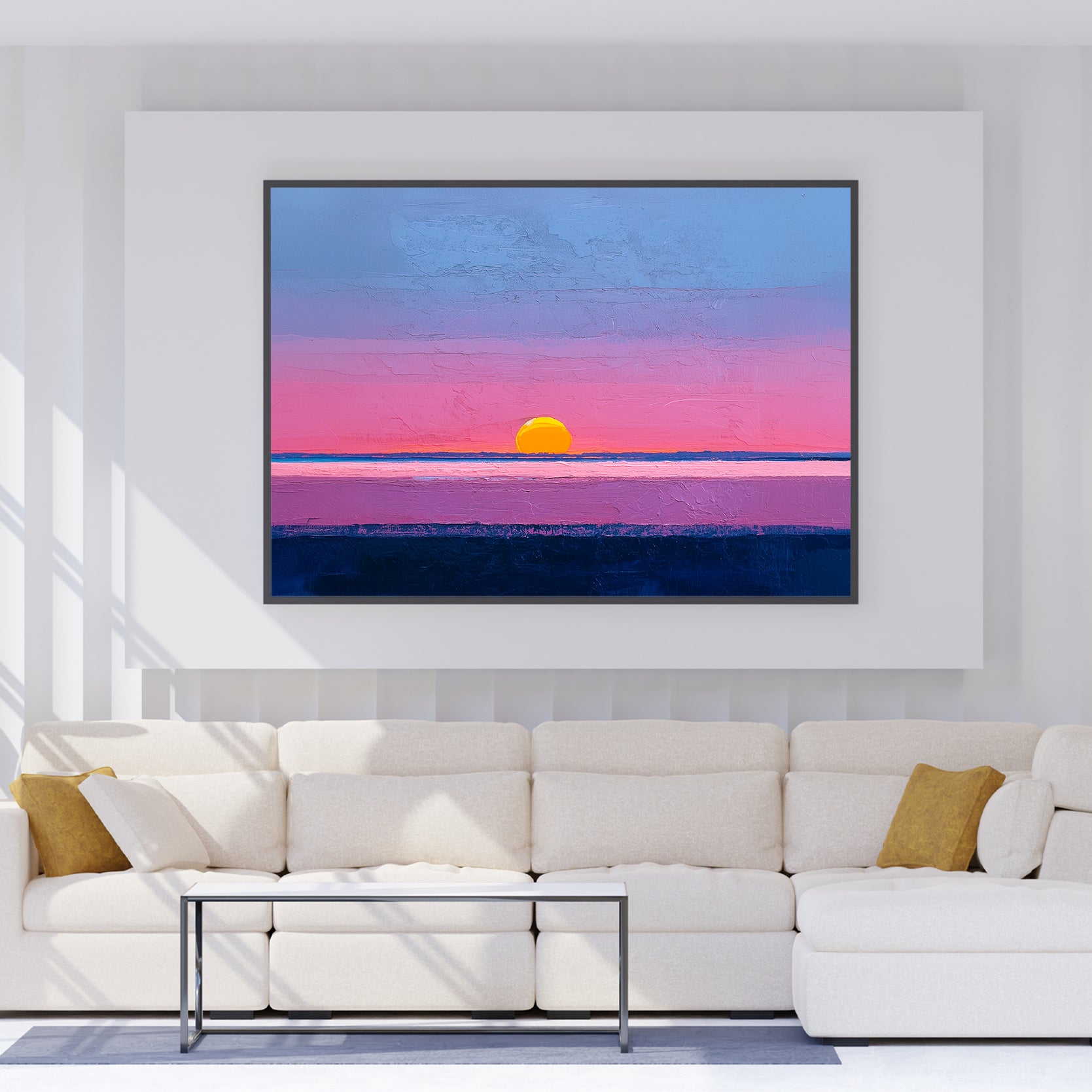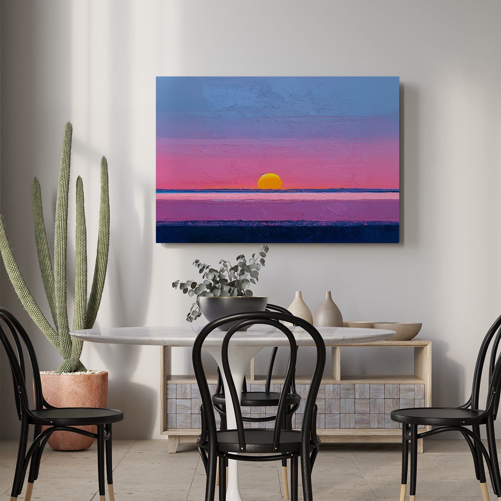 Transform your space with this striking modern abstract canvas that captures the serene beauty of a coastal sunset. Rendered in captivating shades of purple, pink, and blue, the composition evokes the tranquil meeting of ocean and sky. The contemporary design works beautifully as a focal point above sofas, beds, or accent walls, infusing any room with sophisticated color and artistic depth. Perfect for those seeking to elevate their home décor with a piece that balances vibrant hues with minimalist aesthetics.