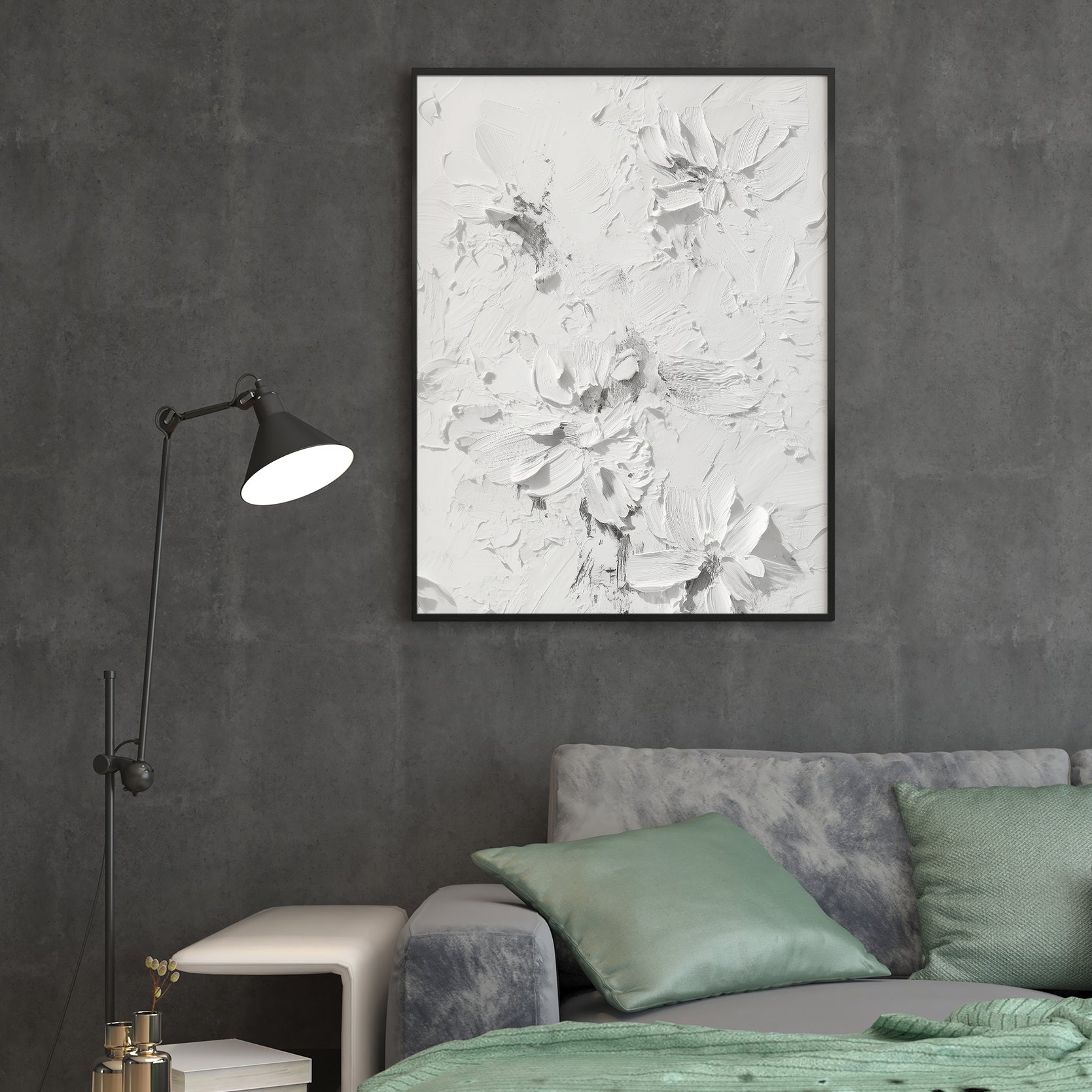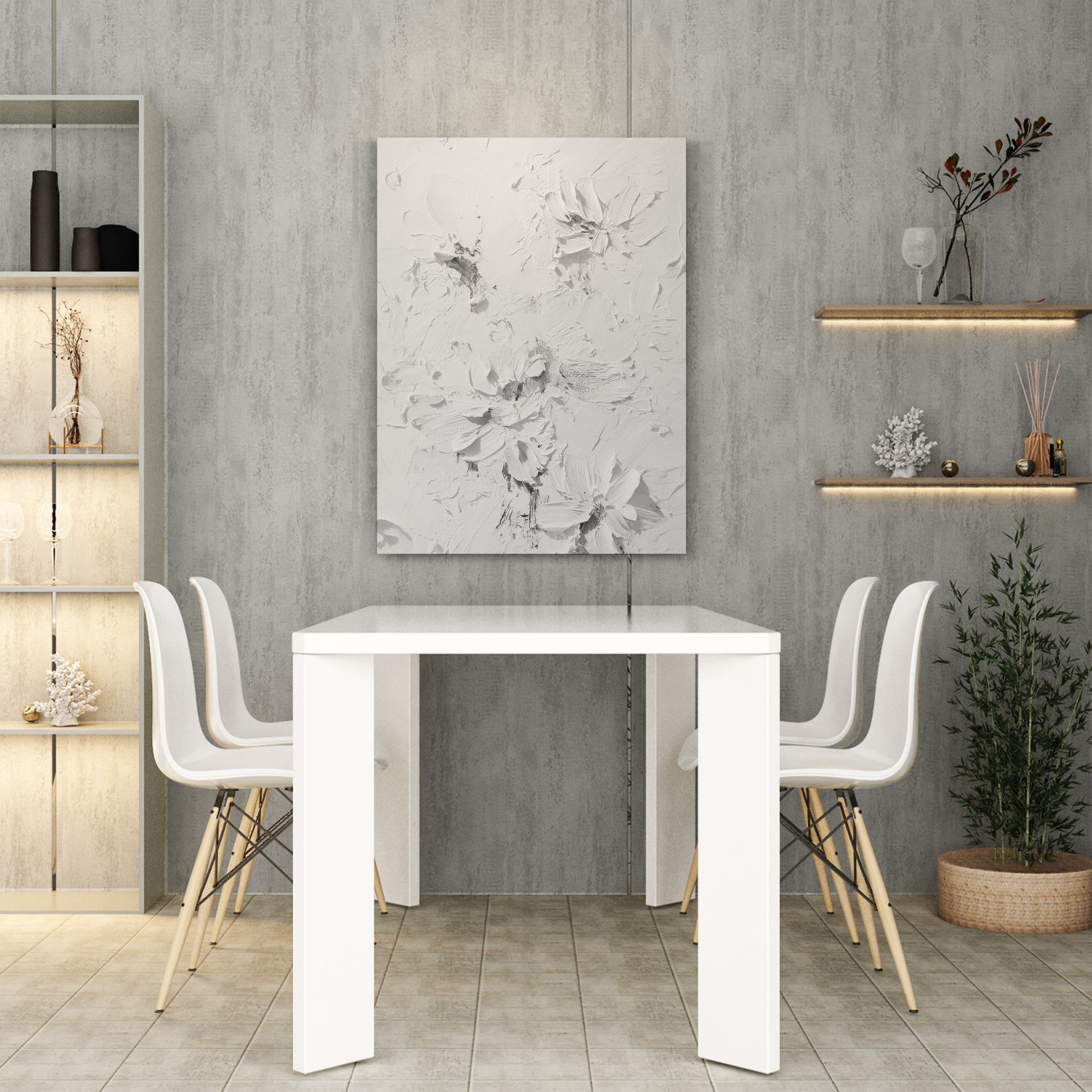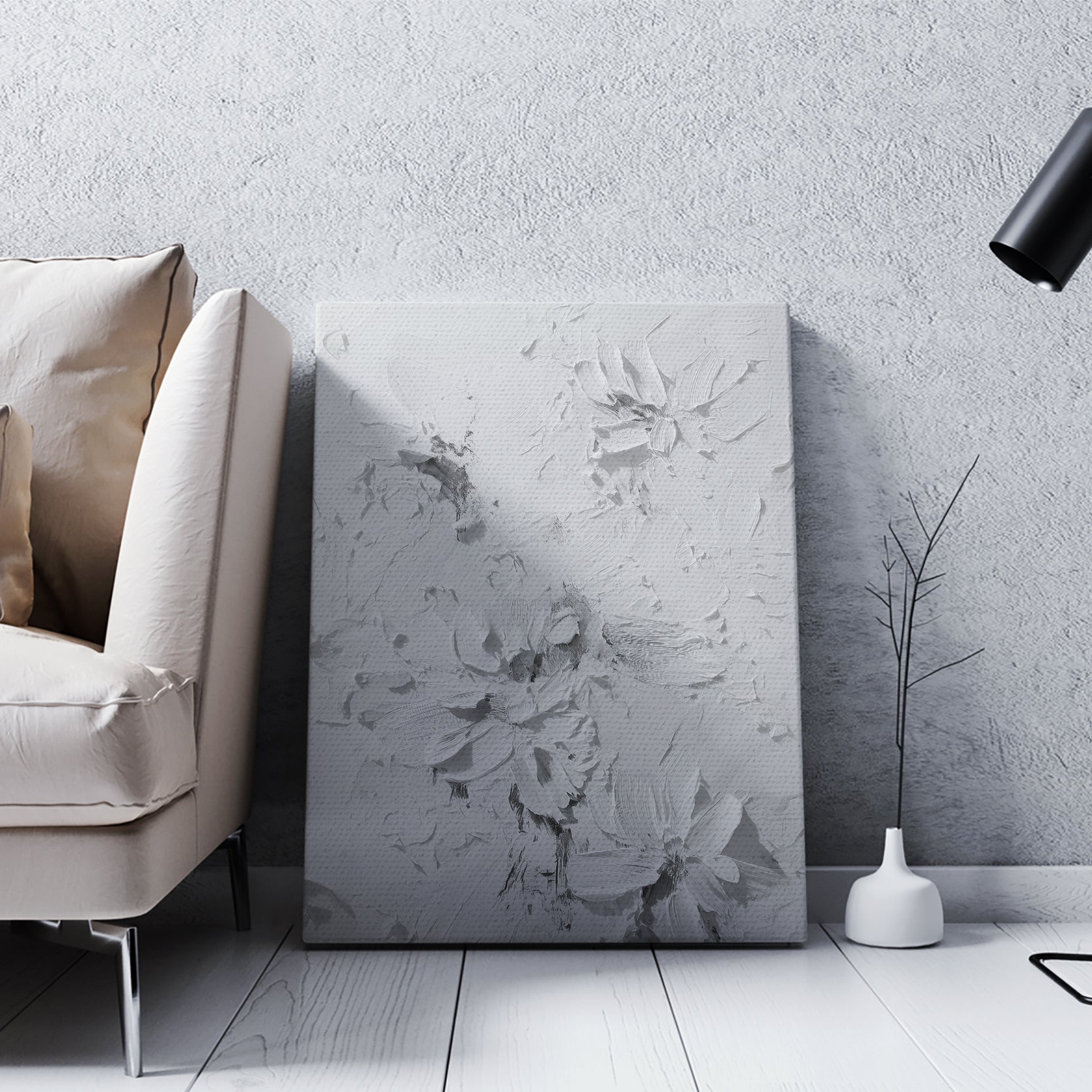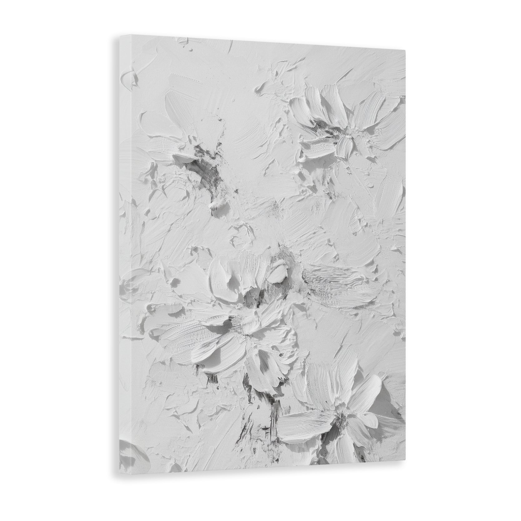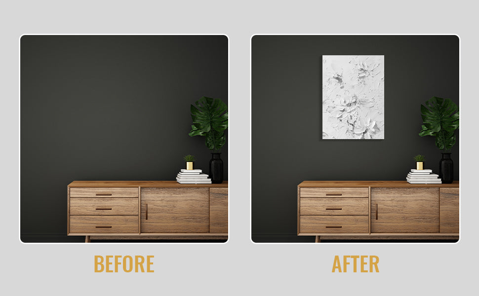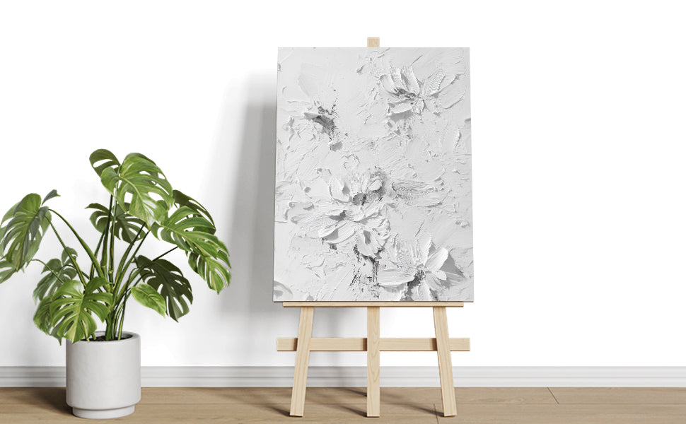 Elevate your interior with this contemporary canvas art piece, featuring delicate floral motifs rendered in sophisticated white tones against a textured background. The dimensional surface adds depth and visual interest, creating a refined focal point that complements modern and transitional décor styles. Versatile enough for living rooms, bedrooms, or entryway spaces, this artwork brings understated elegance to any wall. The neutral palette ensures seamless integration with existing furnishings while the textured finish catches light beautifully throughout the day, enhancing the overall ambiance of your home.