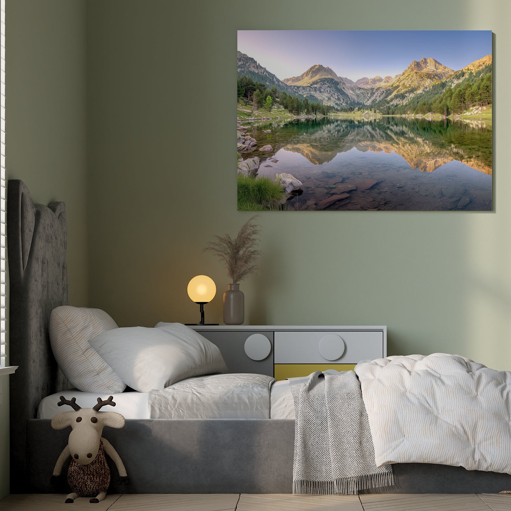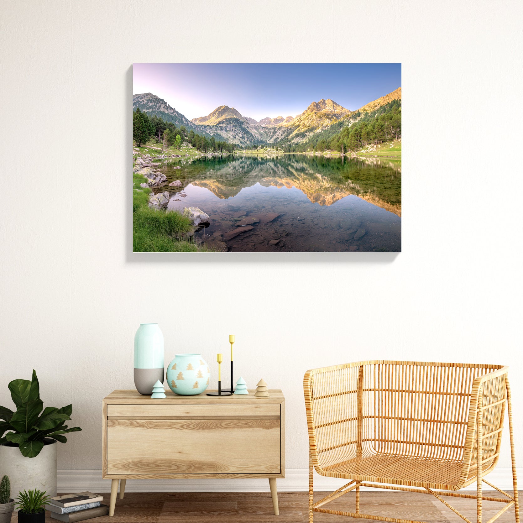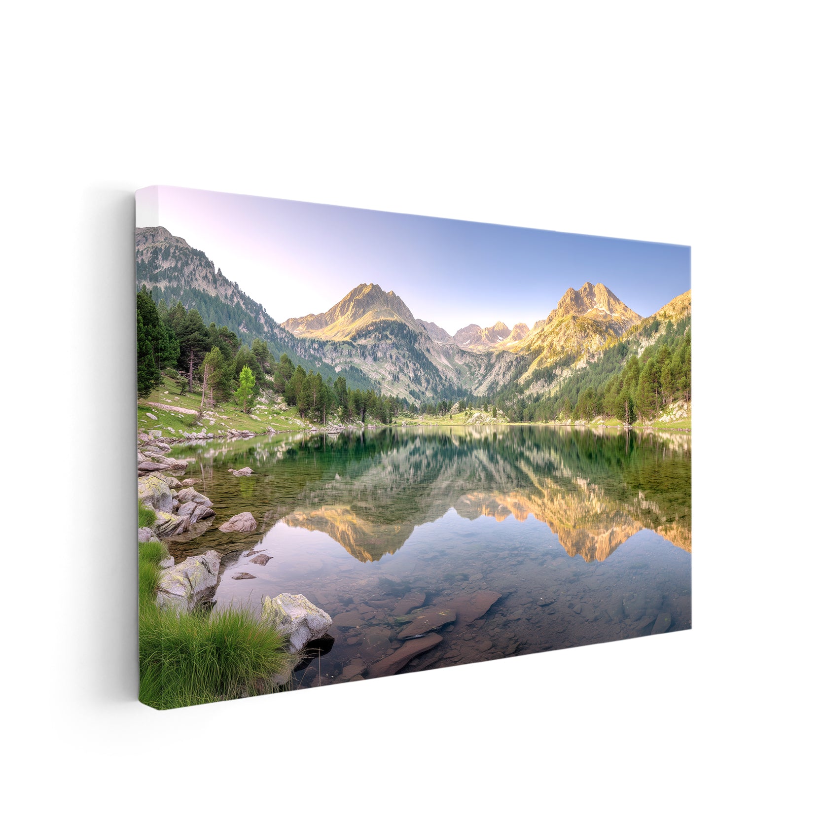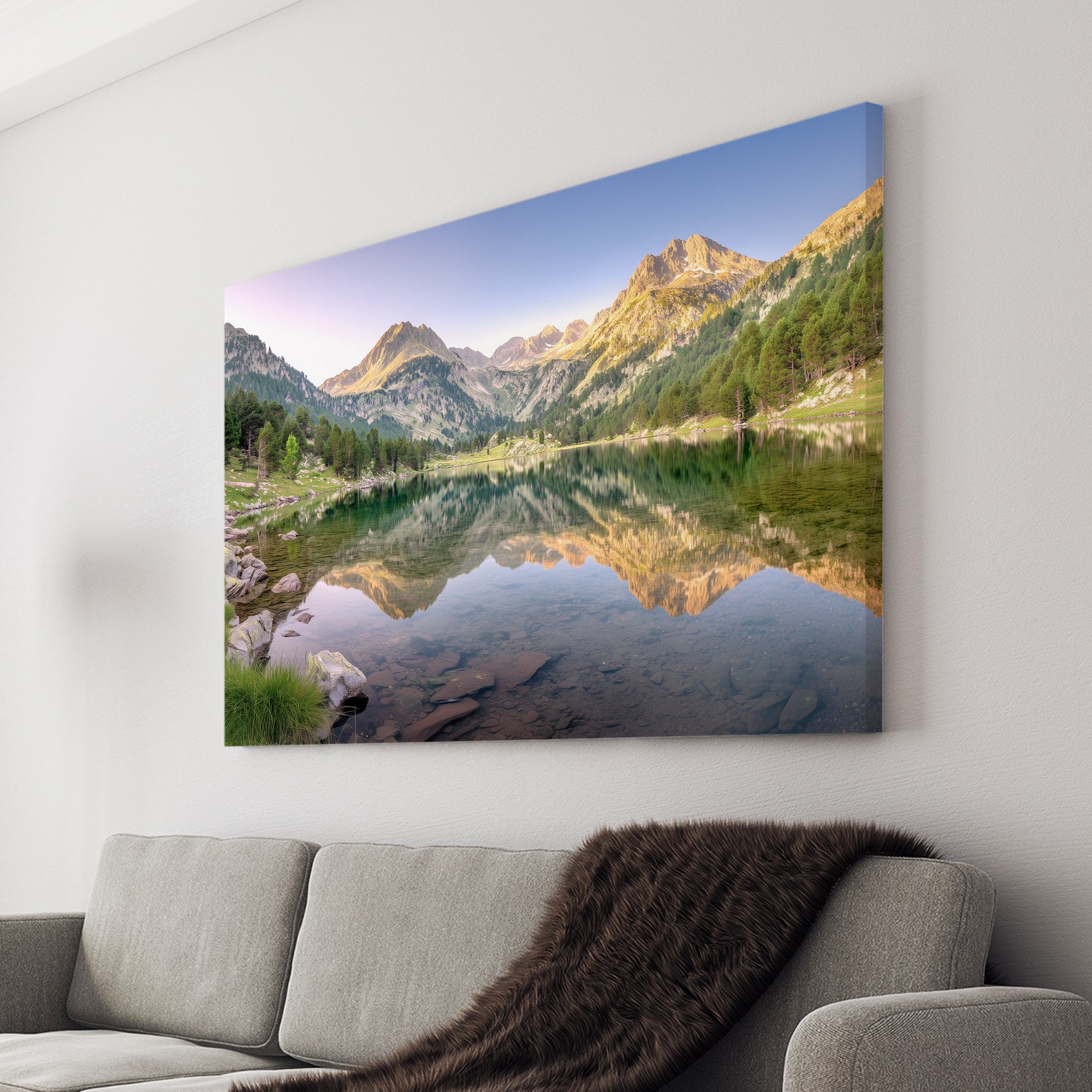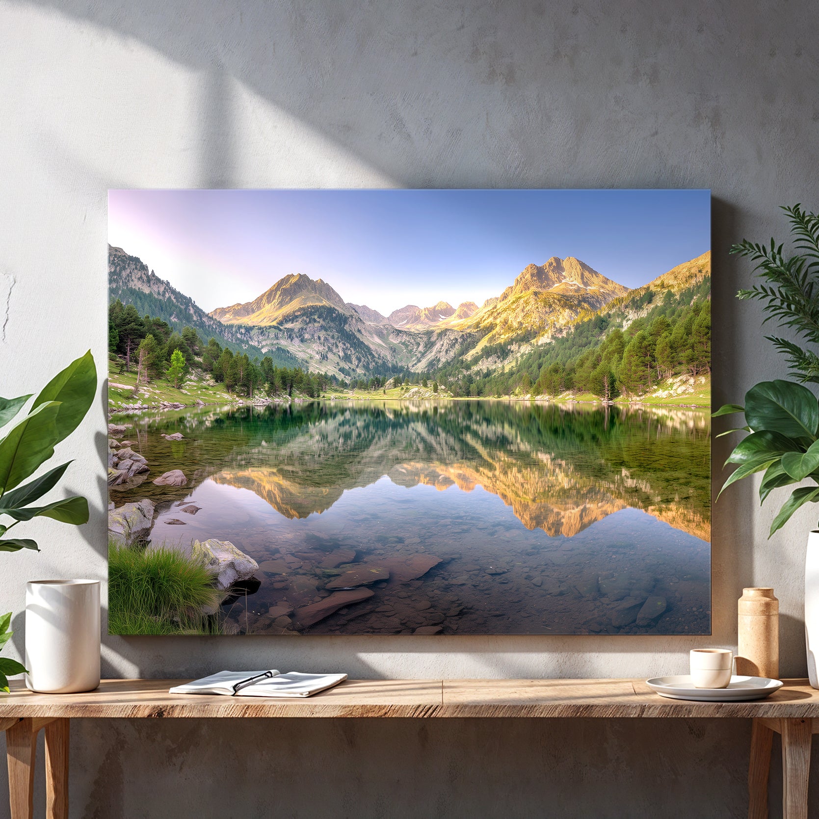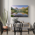 Capture the serene beauty of alpine landscapes with this stunning mountain lake canvas wall art. Featuring a breathtaking reflection scene where towering peaks mirror perfectly in tranquil waters, this piece brings nature's majesty into your home. The expertly composed alpine imagery creates a calming focal point ideal for living rooms, above sofas, or beside bedroom spaces. High-quality canvas construction ensures lasting vibrancy and durability, while the timeless landscape composition complements both contemporary and traditional interiors. Transform any room into a peaceful retreat with this sophisticated nature-inspired wall décor that evokes the grandeur of mountain wilderness.