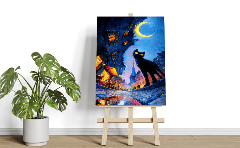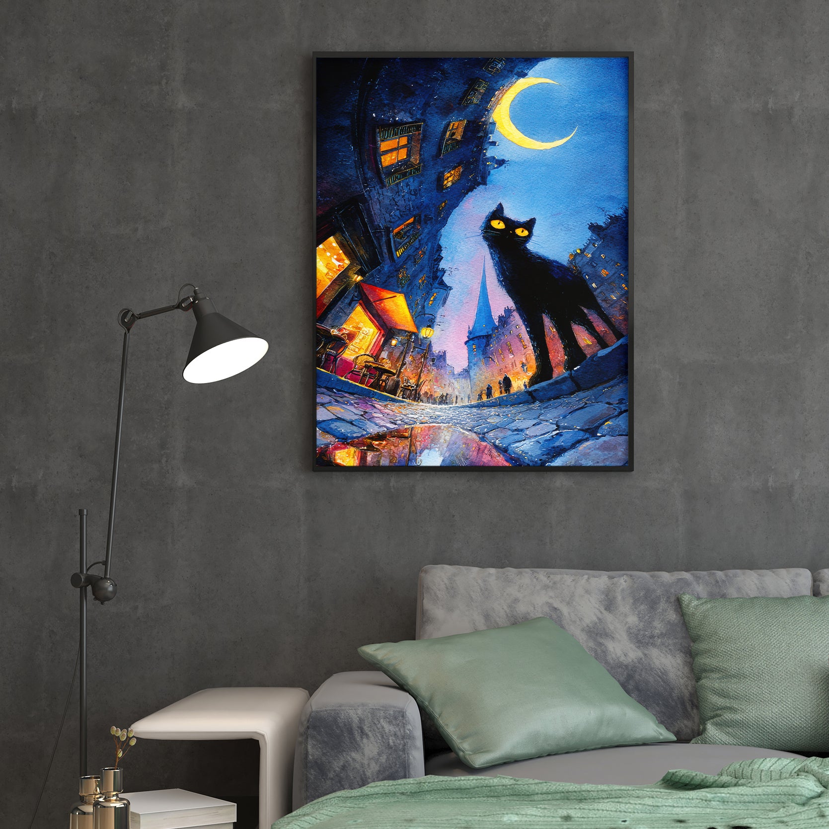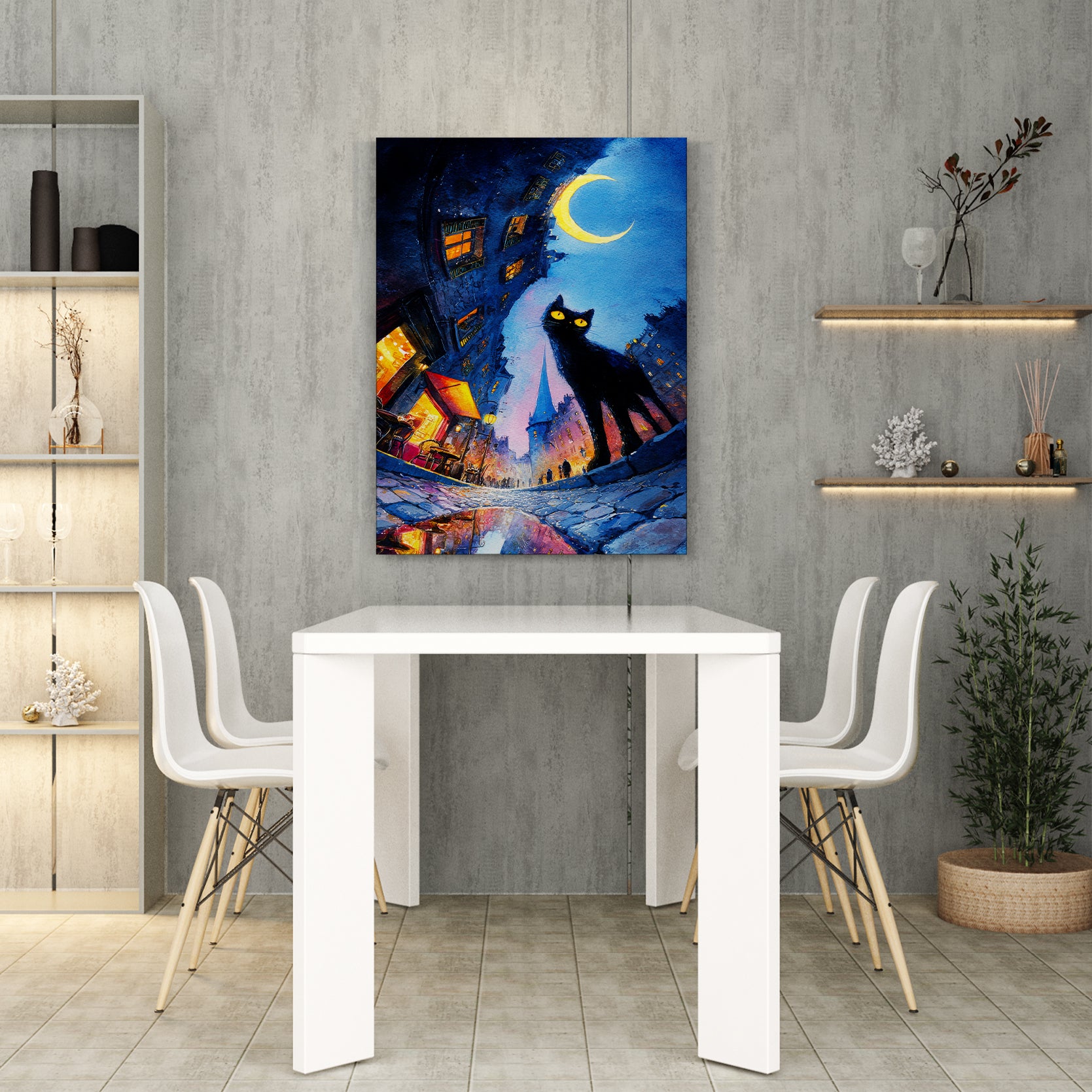 Elevate your interior with this captivating black cat wall art, featuring a mystical feline silhouetted against an atmospheric night city backdrop. This canvas print combines contemporary urban aesthetics with enigmatic charm, making it an ideal focal point for living rooms, bedroom walls, or spaces above sofas.