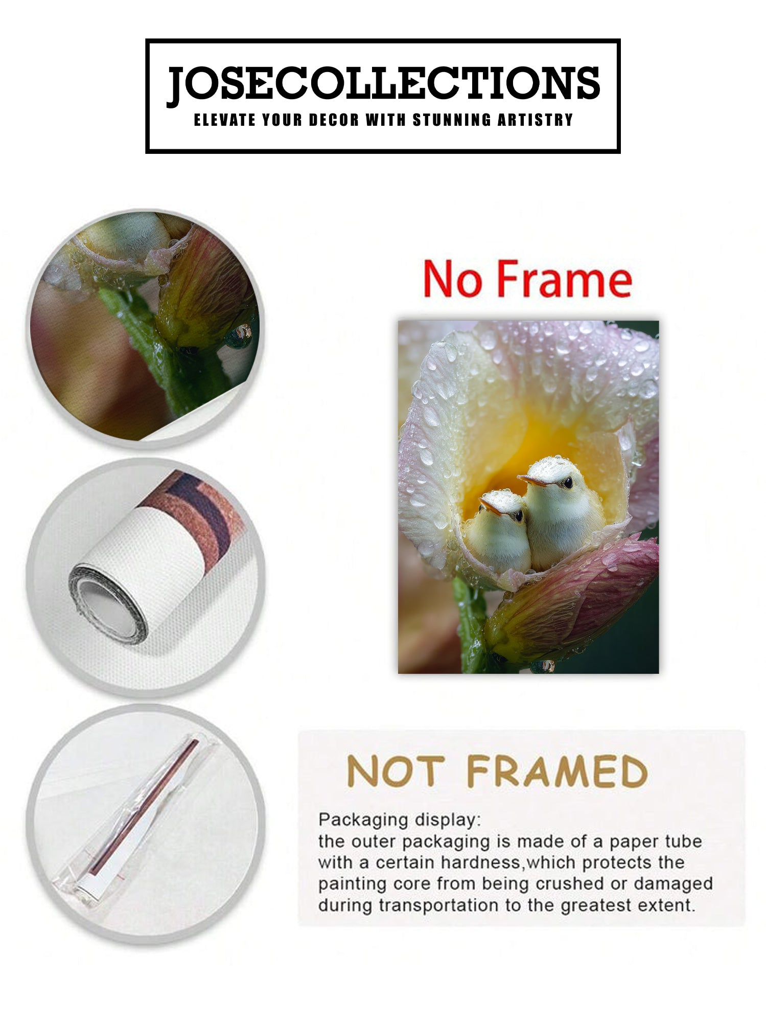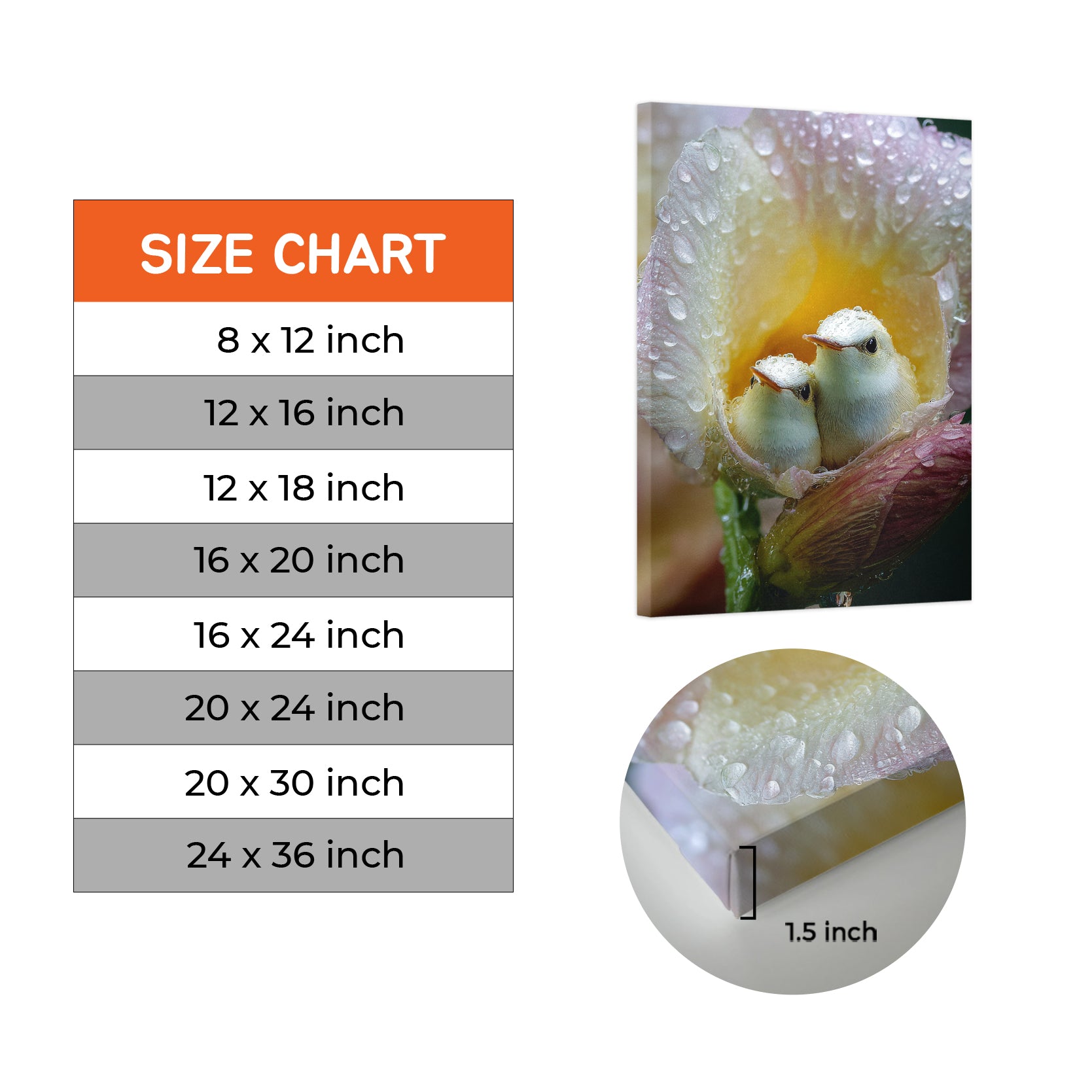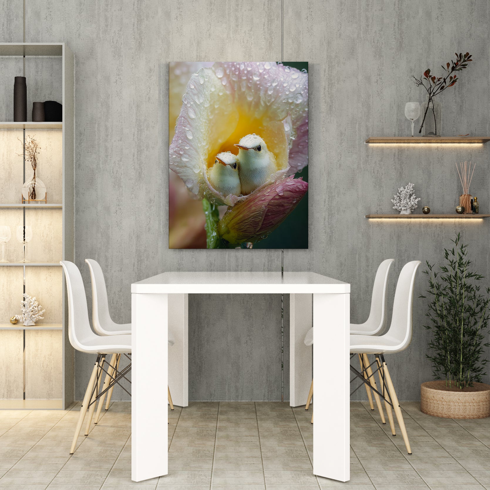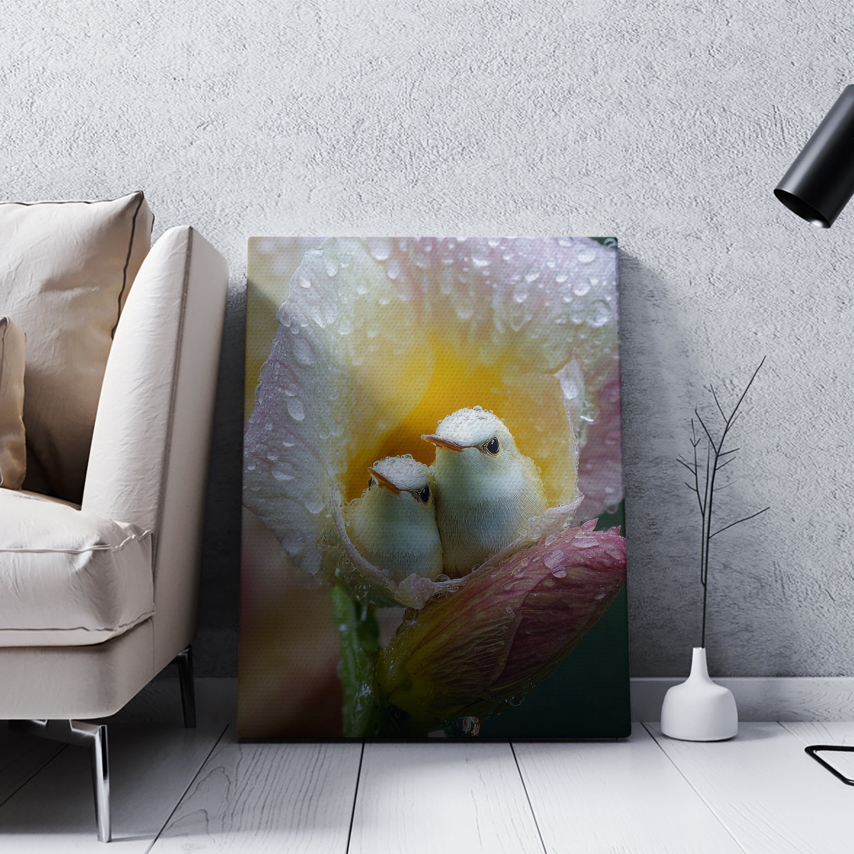 Bring serene natural beauty into your home with this exquisite canvas wall art featuring delicate baby birds nestled among dewy flowers. The soft, detailed composition creates a calming focal point perfect for living rooms, bedrooms, or above sofas. This nature-inspired piece combines artistic elegance with peaceful imagery, transforming any space into a tranquil sanctuary. Ideal for those seeking to add warmth and sophistication to their interior design while celebrating the gentle wonders of wildlife and botanical elements.