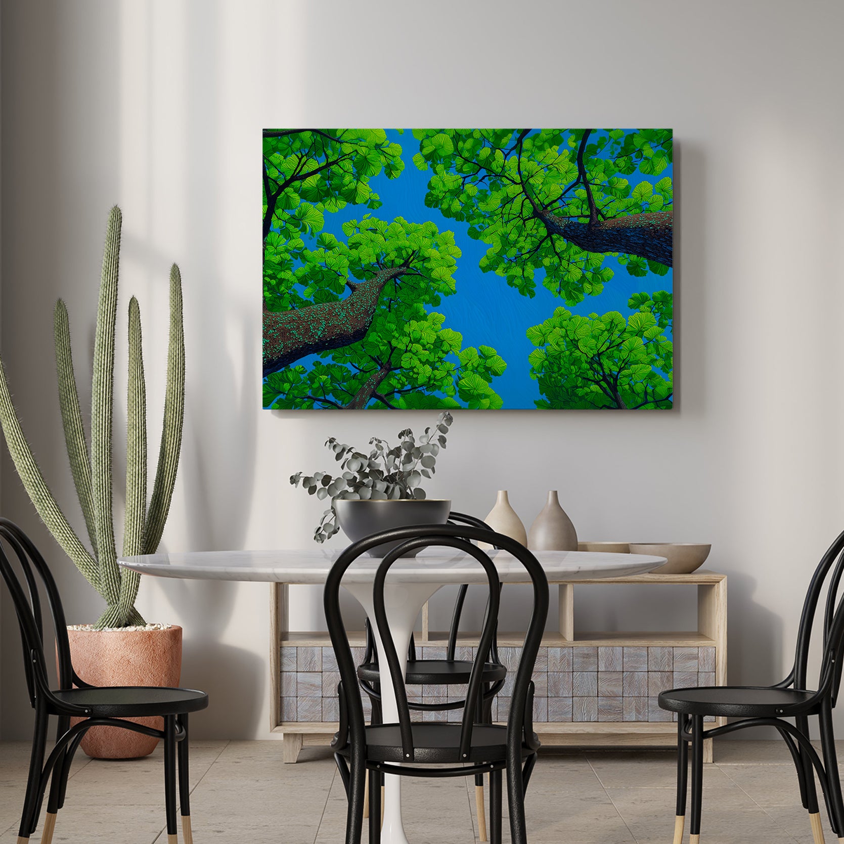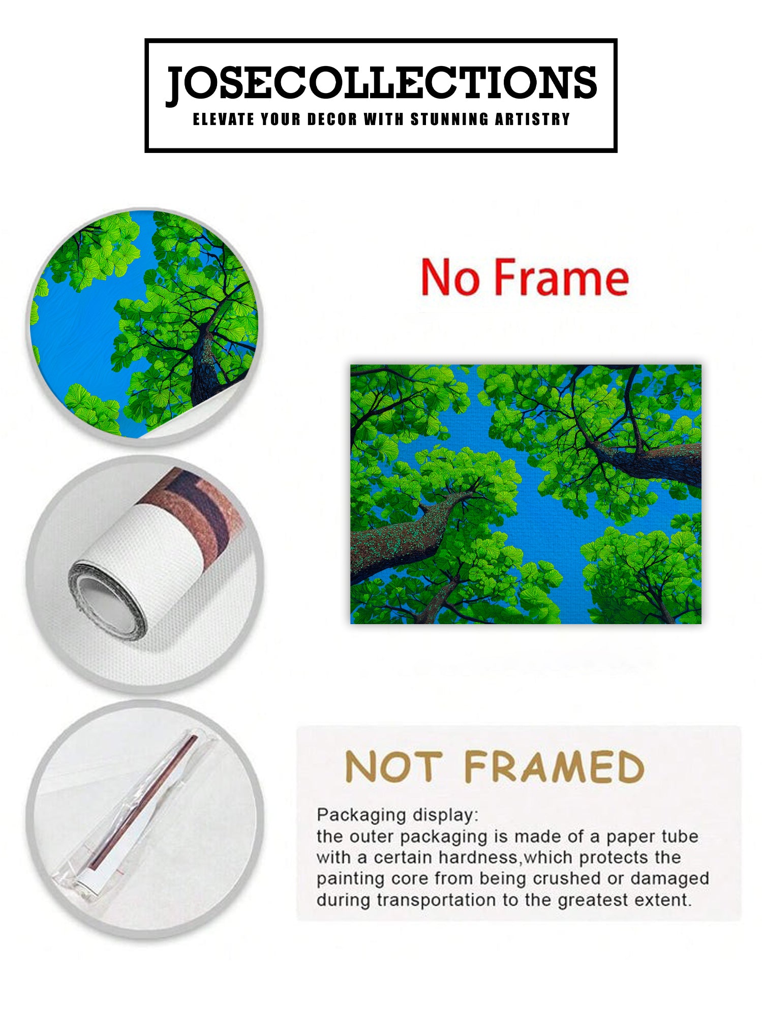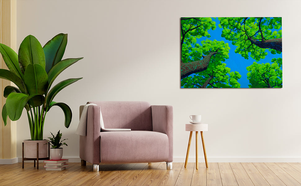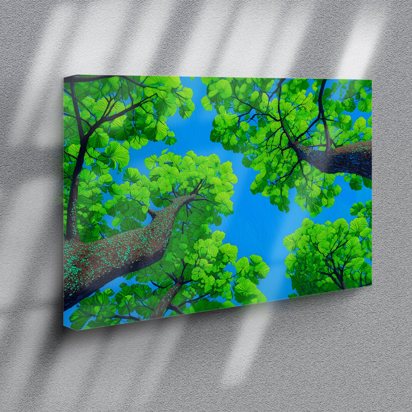 Bring serene natural beauty into your home with this captivating canvas wall art. Featuring lush green tree branches gracefully set against a tranquil blue sky, this piece creates an instant focal point that transforms any room. The calming color palette and organic composition make it ideal for living rooms, bedrooms, or above sofas, promoting relaxation and visual interest. Expertly rendered with attention to detail, this nature-inspired artwork complements both modern and traditional interiors while adding depth and character to your walls. A sophisticated choice for those seeking to infuse their space with peaceful, timeless elegance.