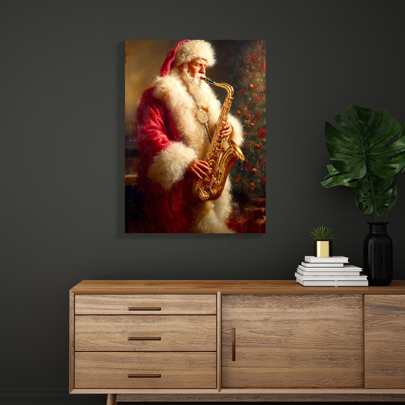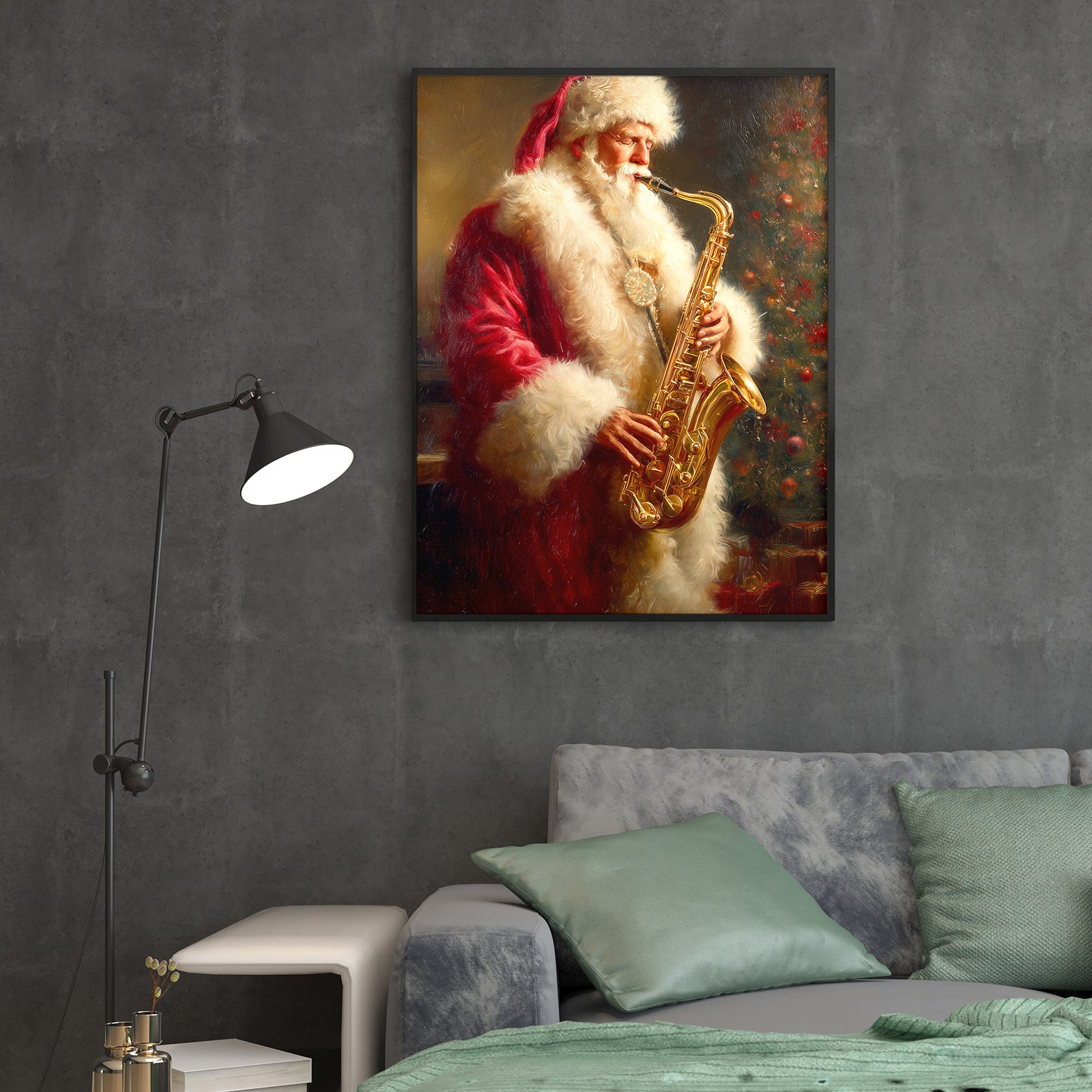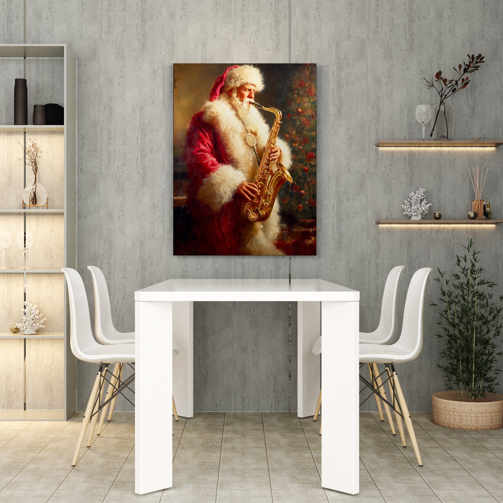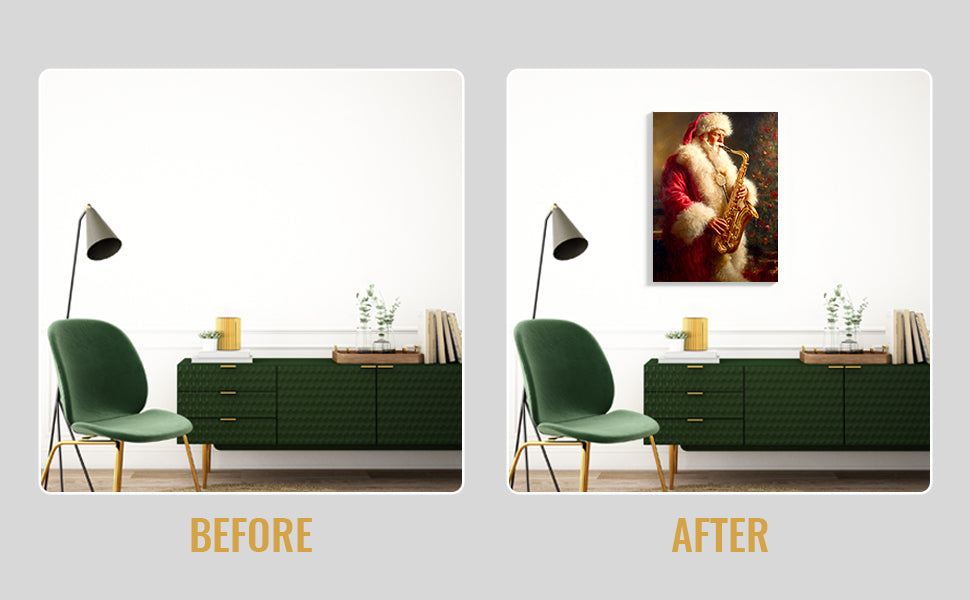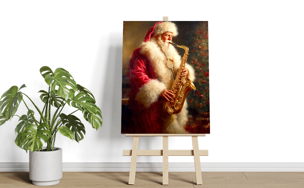 Bring festive cheer and artistic flair to any room with this charming Santa Claus Playing Saxophone canvas wall art. This whimsical piece captures a classic Christmas scene with Santa in a delightful musical moment, perfect for creating a warm, inviting atmosphere. The vibrant colors and detailed composition make it an ideal focal point above your sofa, in the living room, or beside your bed. Crafted on premium canvas, this artwork combines holiday nostalgia with contemporary home décor sensibilities. Whether you're seeking to enhance your seasonal decorations or add year-round character to your space, this piece delivers both visual interest and festive spirit to elevate your interior design.