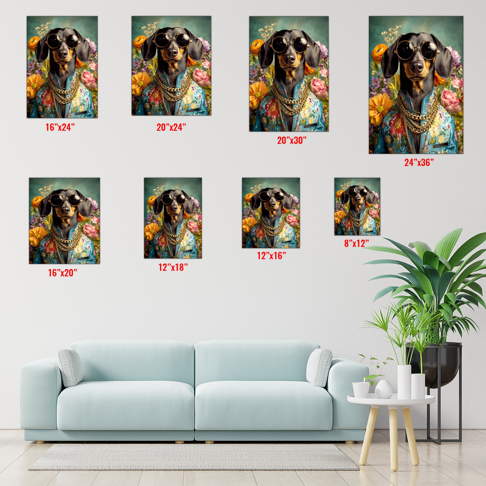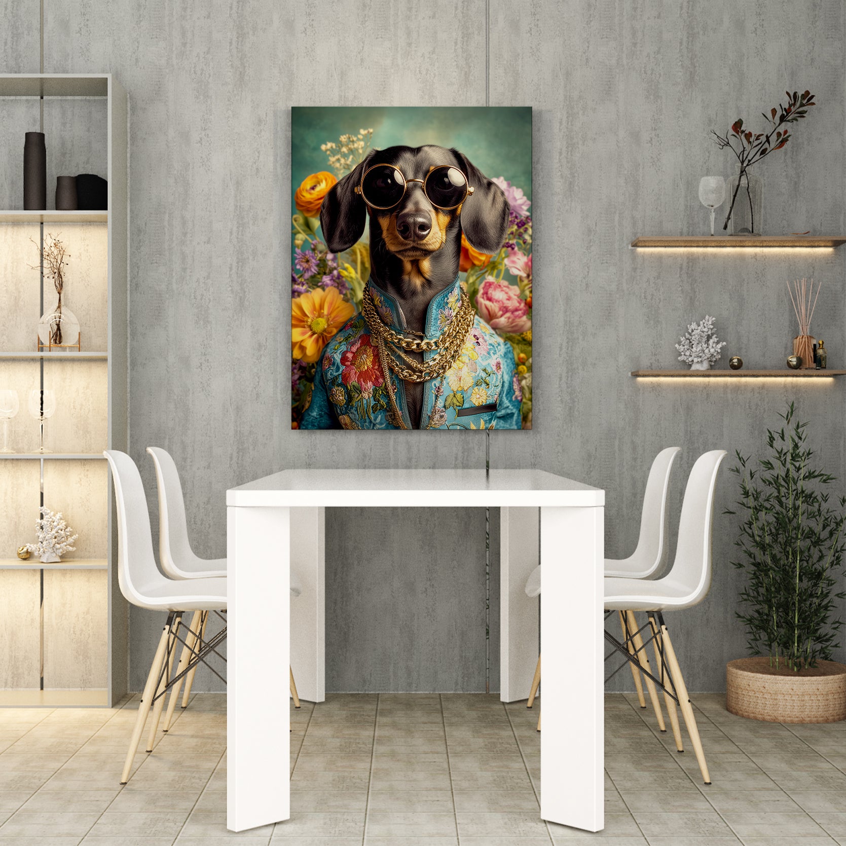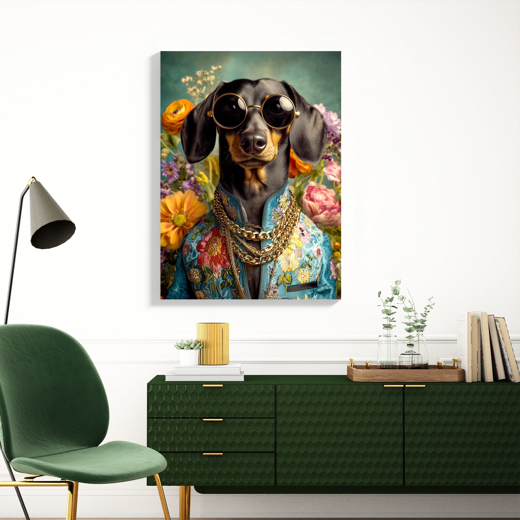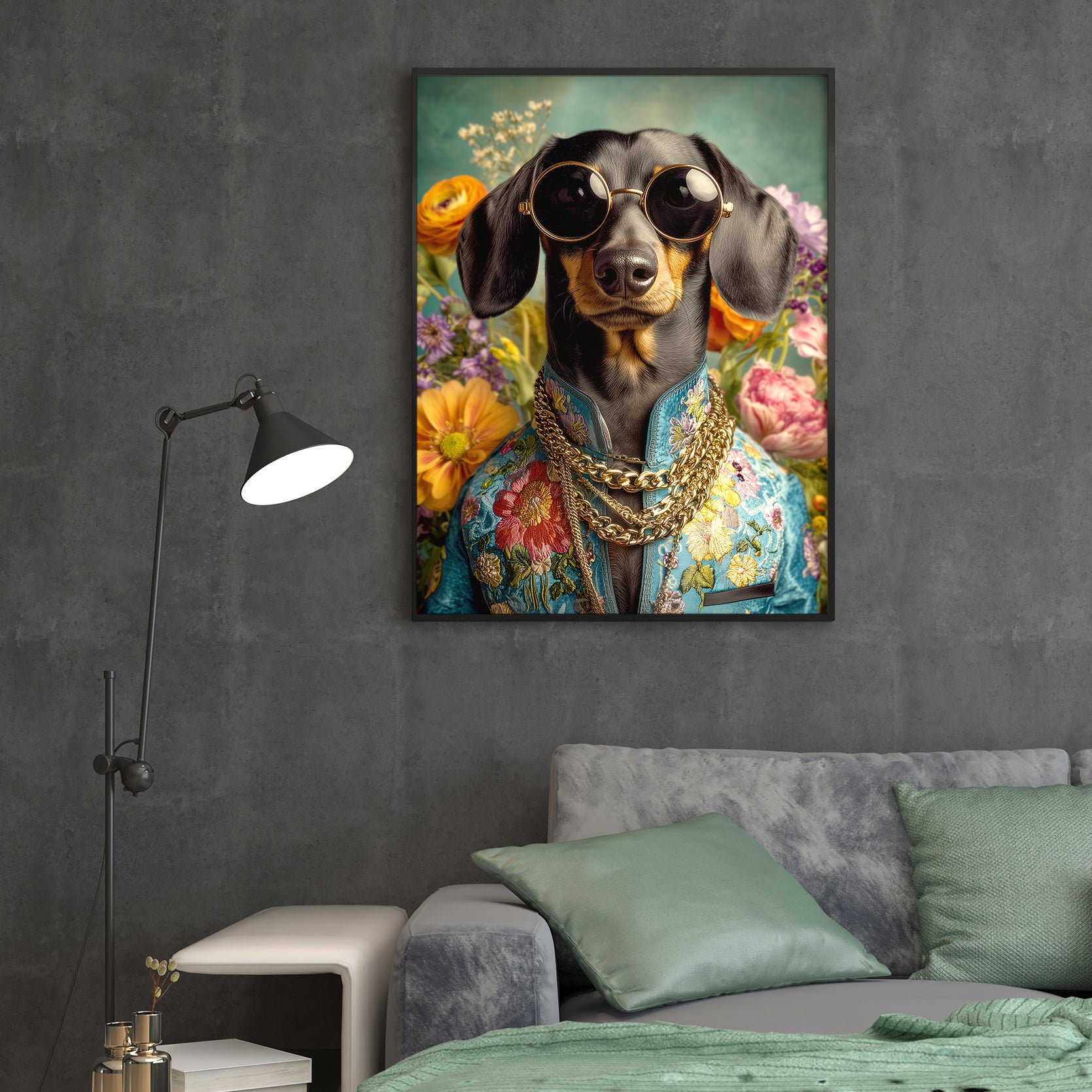 Elevate your interior design with this striking dachshund canvas art that seamlessly blends contemporary style with whimsical charm. Featuring a fashionable dachshund adorned with sunglasses and a gleaming gold chain, set against a vibrant floral backdrop, this piece makes a bold statement in any room. The sophisticated composition transforms a playful subject into gallery-worthy décor, perfect for living rooms, bedrooms, or above sofas where it commands attention. High-quality canvas construction ensures lasting color vibrancy and durability. Ideal for pet lovers and design enthusiasts seeking artwork that balances personality with polish, this piece adds character and visual interest to your home while reflecting your distinctive taste.