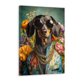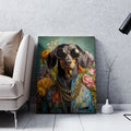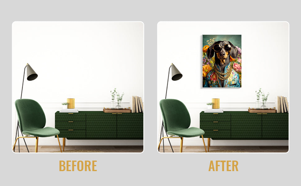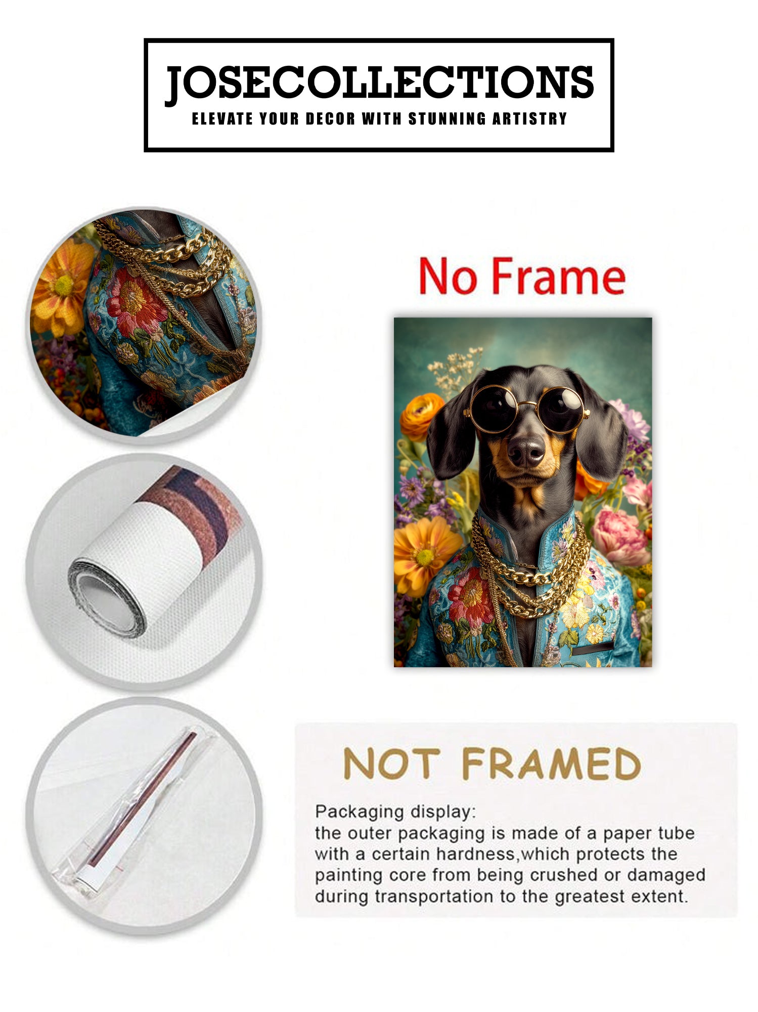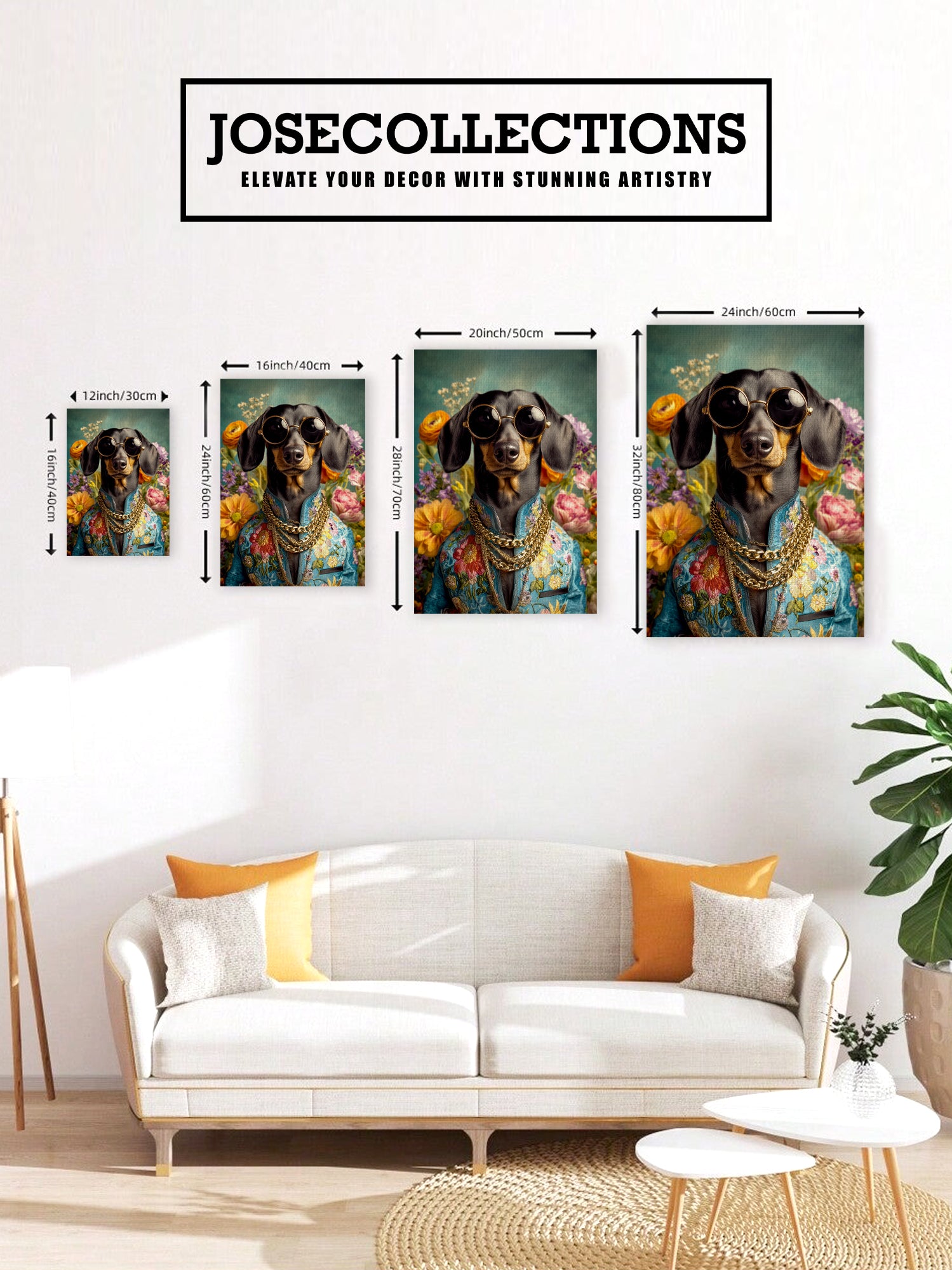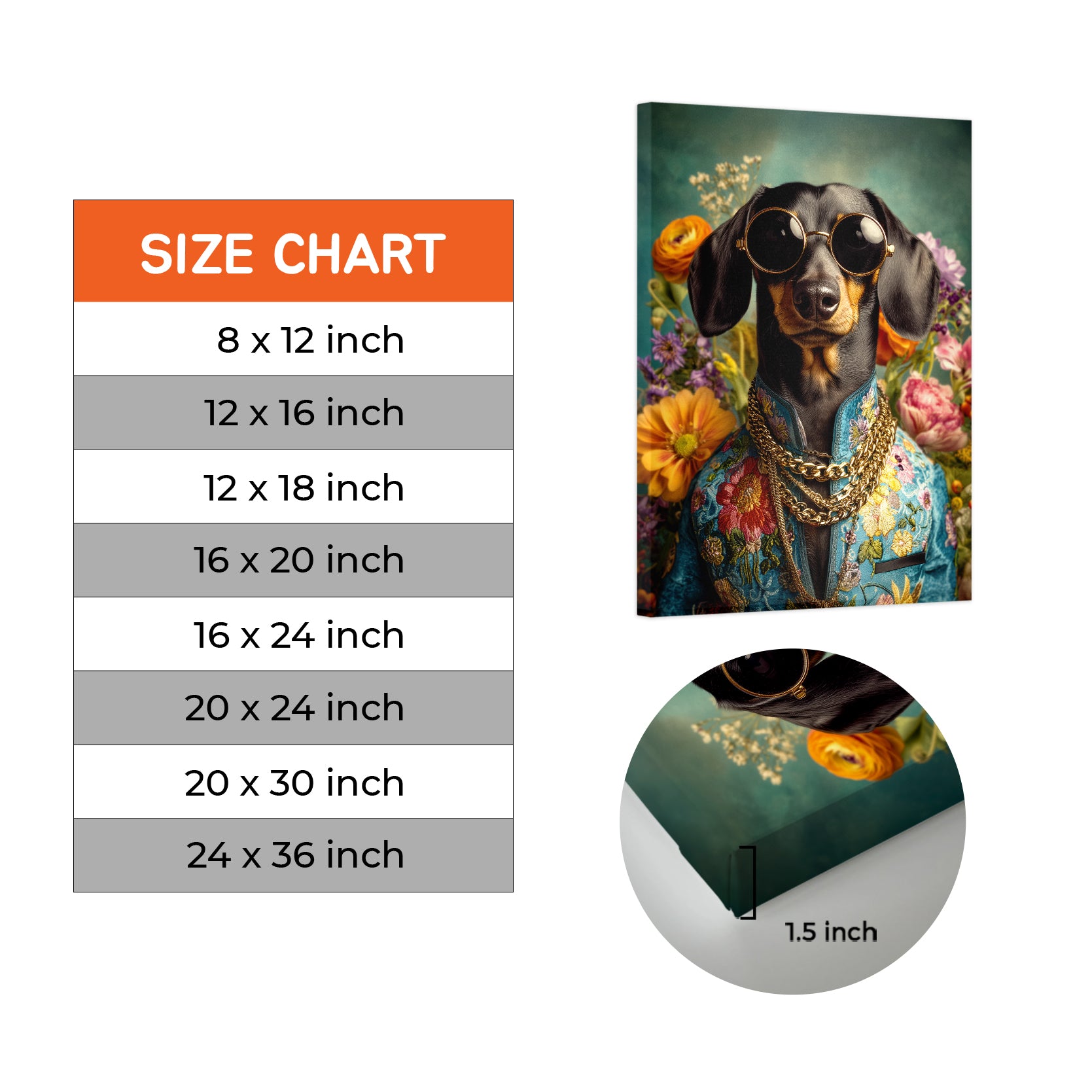 Elevate your interior design with this striking dachshund canvas art that seamlessly blends contemporary style with whimsical charm. Featuring a fashionable dachshund adorned with sunglasses and a gleaming gold chain, set against a vibrant floral backdrop, this piece makes a bold statement in any room. The sophisticated composition transforms a playful subject into gallery-worthy décor, perfect for living rooms, bedrooms, or above sofas where it commands attention. High-quality canvas construction ensures lasting color vibrancy and durability. Ideal for pet lovers and design enthusiasts seeking artwork that balances personality with polish, this piece adds character and visual interest to your home while reflecting your distinctive taste.