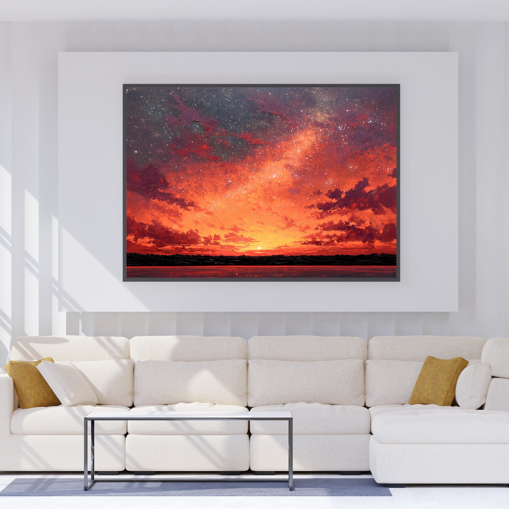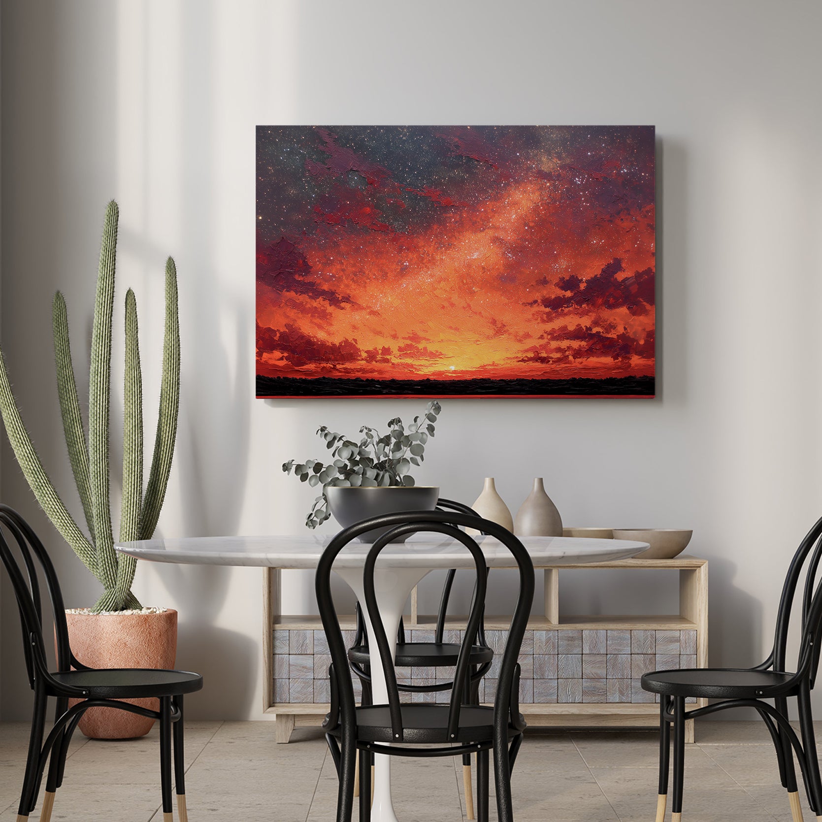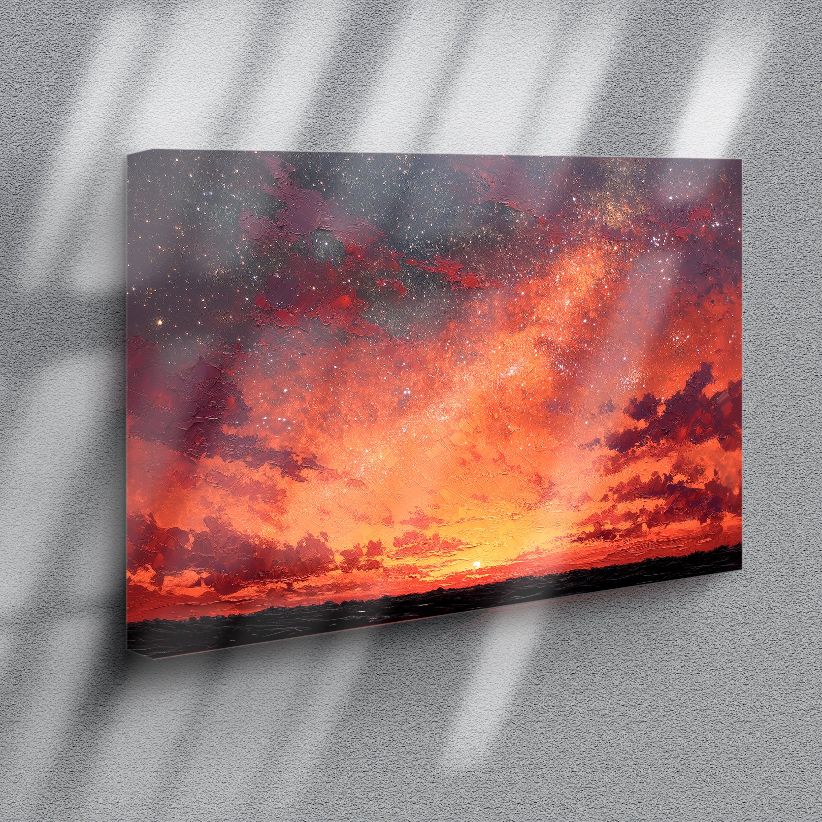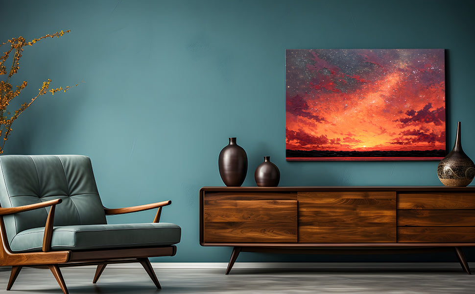 Transform your space with this captivating canvas wall art featuring a mesmerizing blend of warm orange and red hues against a starry night sky. The dynamic landscape composition creates visual depth and movement, making it an ideal focal point for living rooms, bedrooms, or above sofas. This professionally rendered sunset scene brings warmth and sophistication to any interior, while the celestial elements add an artistic, contemplative quality. Perfect for those seeking to elevate their home décor with a piece that balances vibrant color with serene natural beauty. A versatile addition that complements both modern and traditional design schemes.
