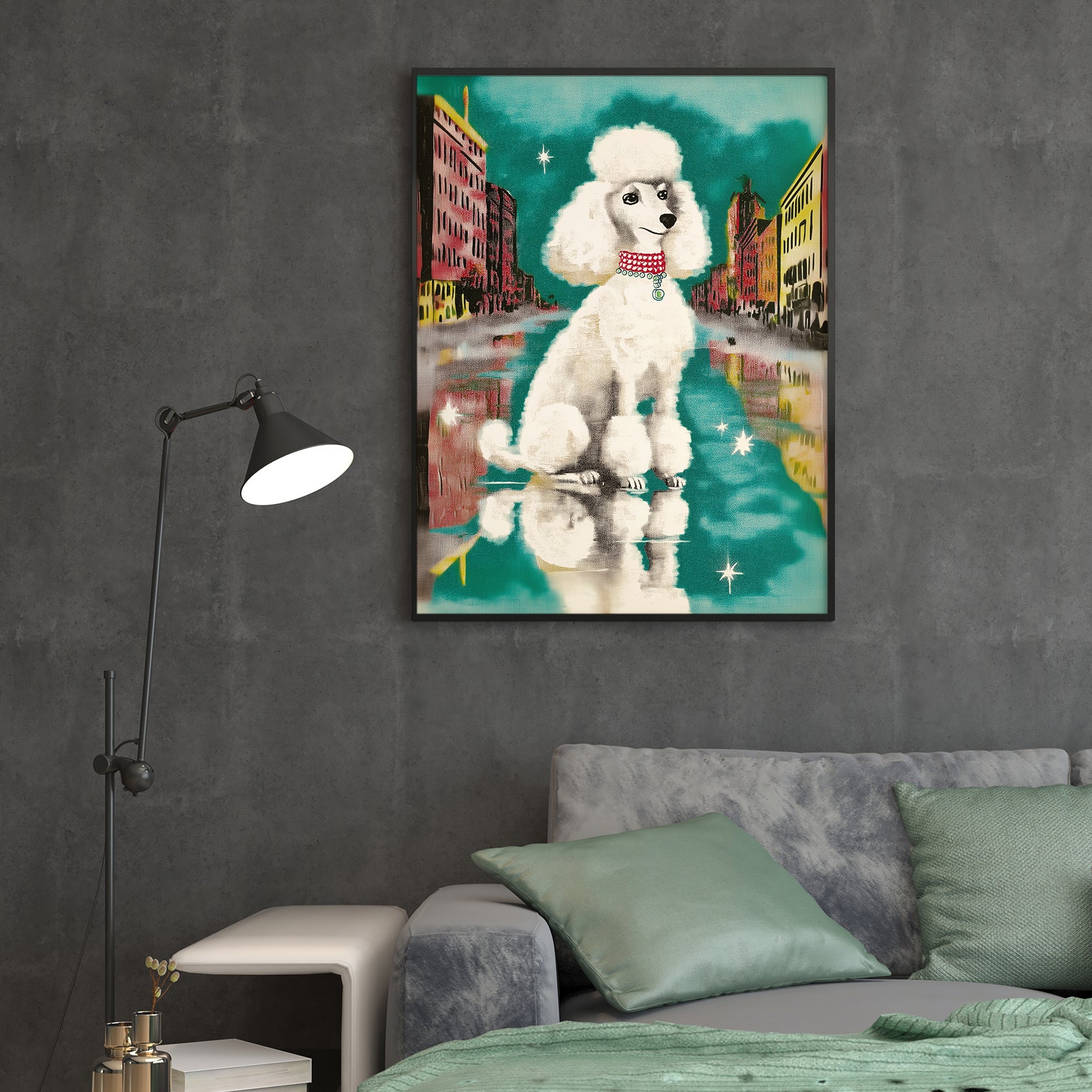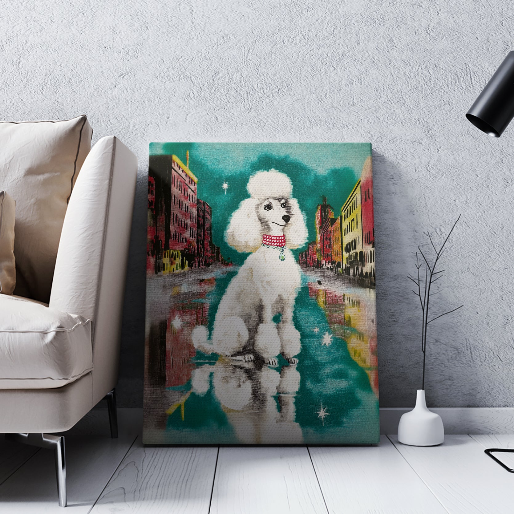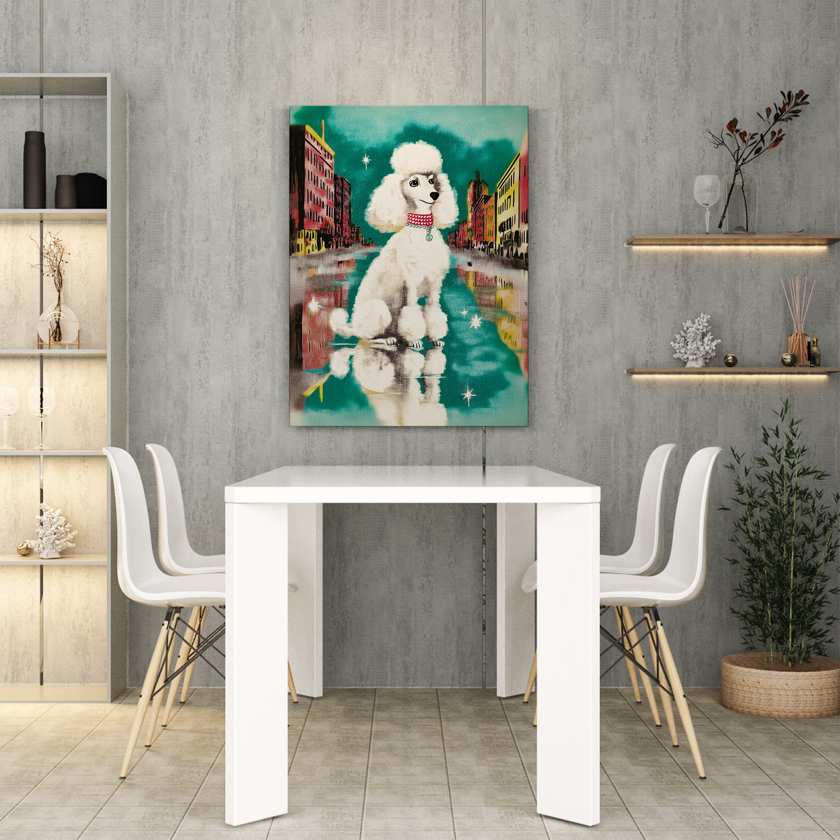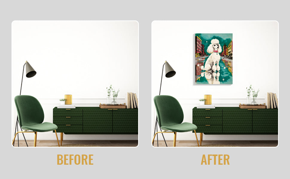 Transform your living space with this striking Urban Poodle Wall Art, a contemporary canvas print featuring an elegant white poodle set against a vibrant city street backdrop. Perfect for modern interiors, this piece brings sophistication and artistic flair to your sofa wall, bedroom, or any room seeking a refined focal point. The crisp imagery and urban aesthetic create visual interest while maintaining a refined aesthetic that complements both minimalist and eclectic décor styles. Ideal for those who appreciate fine art with personality, this canvas print delivers gallery-quality presentation without the gallery price tag.