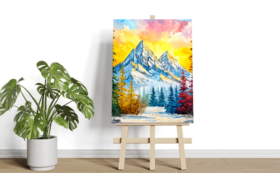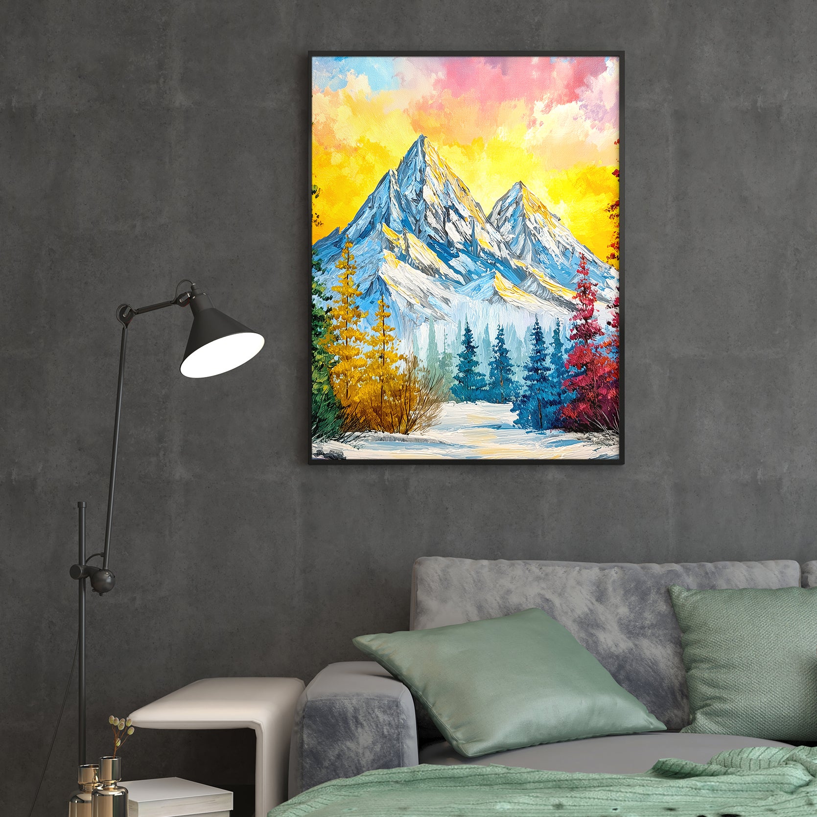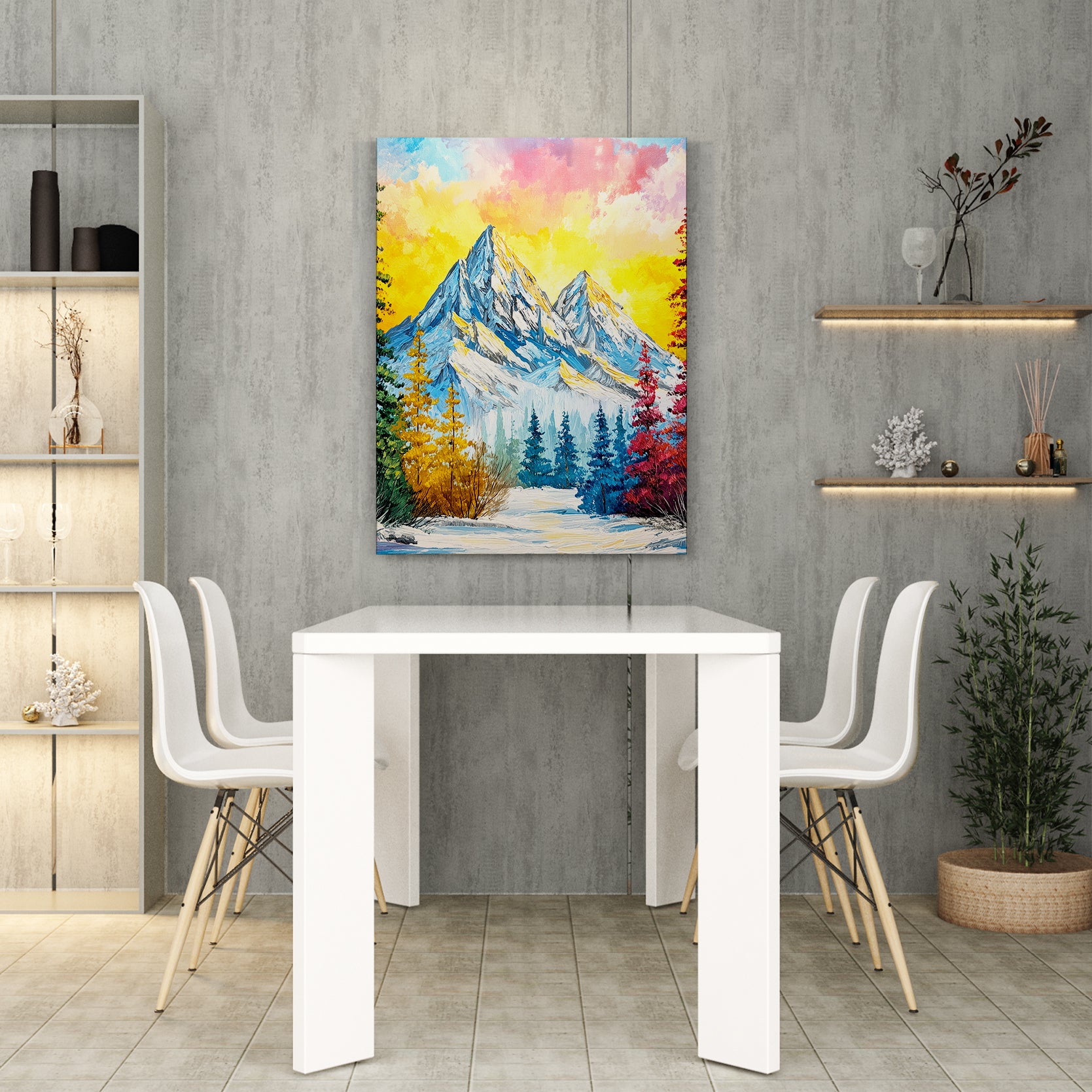 Elevate your interior with this striking impasto mountain landscape canvas print, where bold brushwork and dynamic color create visual depth and movement. The composition captures a dramatic sunset over snow-capped peaks, rendered in vibrant hues that command attention without overwhelming your space. Perfect for living rooms, bedside walls, or above sofas, this artwork serves as a sophisticated focal point that transforms any room into a gallery-worthy setting. The textured impasto technique adds tactile dimension, making the piece feel like an original painting rather than a standard print. Ideal for collectors seeking contemporary landscape art with personality and presence.